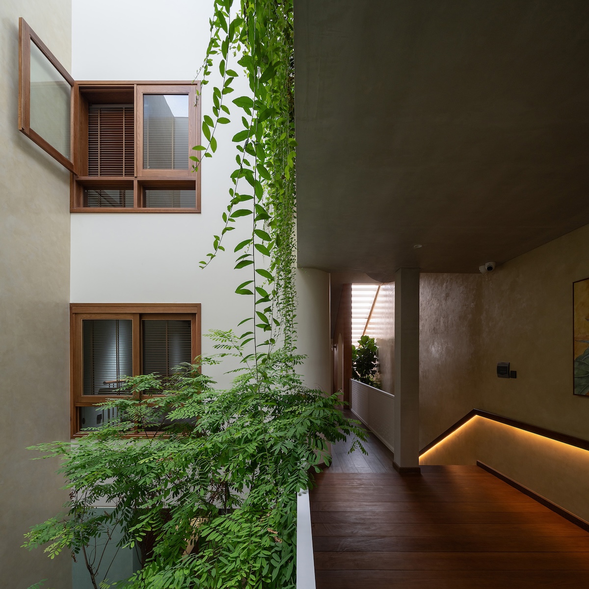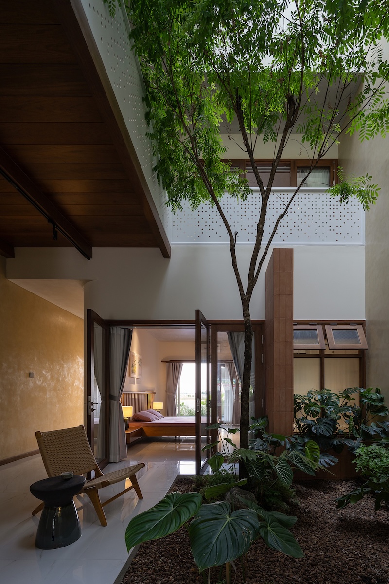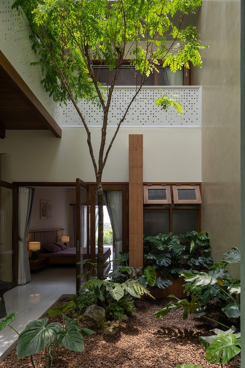 Ngay trung tâm ngôi nhà là giếng trời kết hợp vườn trong, đóng vai trò “trái tim xanh”. Giếng trời đảm bảo thông thoáng, giảm bụi, và kết nối các không gian sinh hoạt.