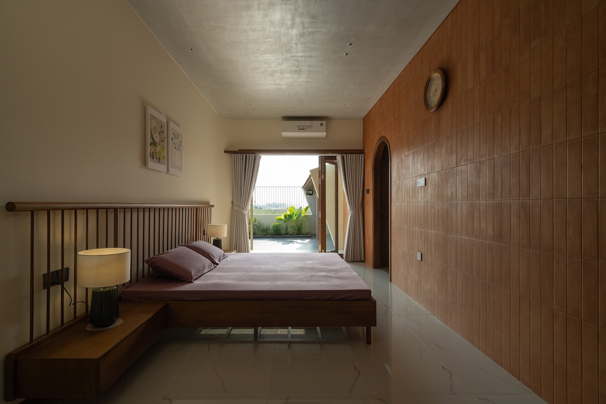 Công trình sử dụng vật liệu tự nhiên quen thuộc như gạch đất nung, gỗ và ngói đỏ, đảm bảo tính bản địa, bền vững và hiệu quả cách nhiệt. Hệ cây xanh phủ quanh khối nhà làm mềm kiến trúc, duy trì cảm giác mát mẻ.