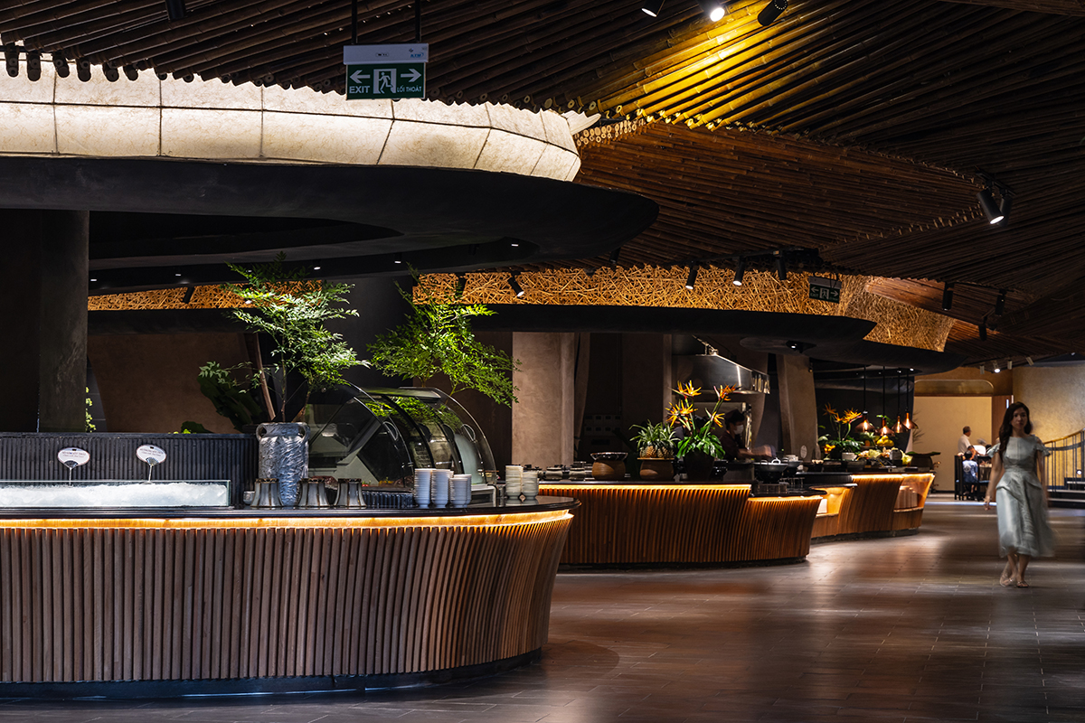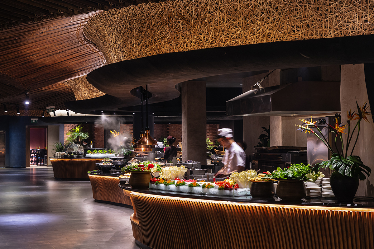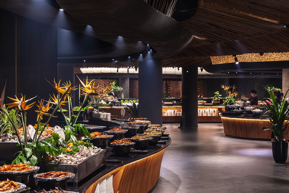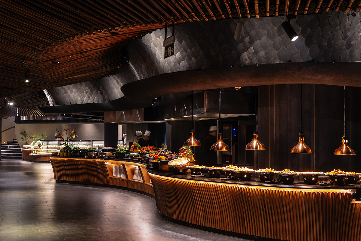Khu buffet nổi bật với năm quầy ẩm thực độc đáo, mỗi quầy được thiết kế với một chủ đề ẩm thực riêng biệt, thể hiện nét đặc trưng của từng loại ẩm thực, góp phần tạo nên nét đa dạng cho không gian chung. Các quầy đảo buffet với hình dạng cong tự nhiên giúp khách hàng khám phá và dễ dàng tìm thấy món ăn ưa thích.