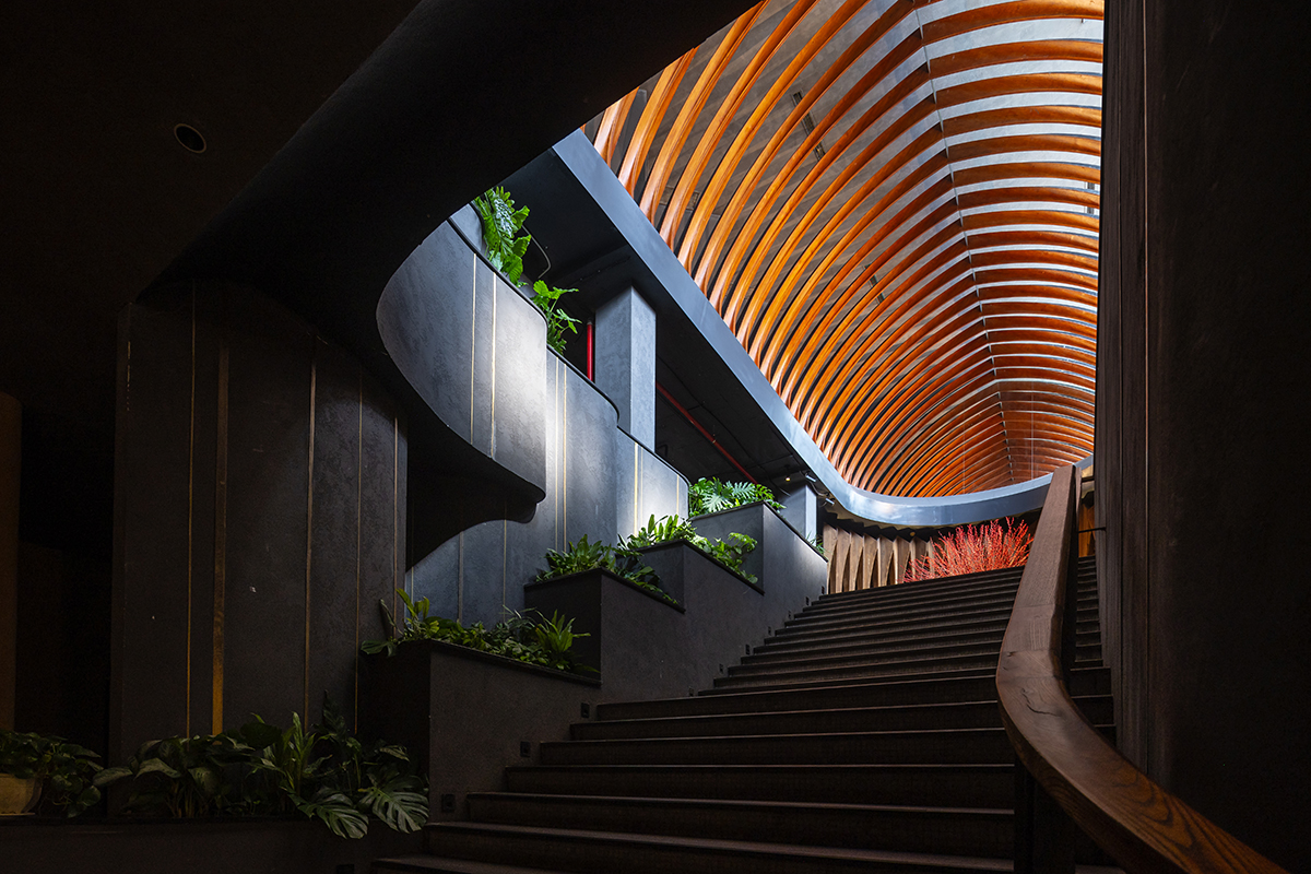 Khách hàng được chào đón bằng cổng vòm với các lam gỗ gợi hình ảnh con đường rợp bóng cây cao vút. Cầu thang chính với chi tiết đồng sáng bóng lấp lánh trên tường tối tựa như ánh nắng chiếu qua ngôi nhà làng quê. Khi bước vào không gian chính, một dải những tấm vải dệt thổ cẩm đã được thiết kế sắp đặt với những hoa văn và màu sắc được chọn lựa kỹ càng để tạo nên sự hài hòa của những giá trị văn hóa dân tộc, thể hiện bề dày văn hóa Việt Nam.