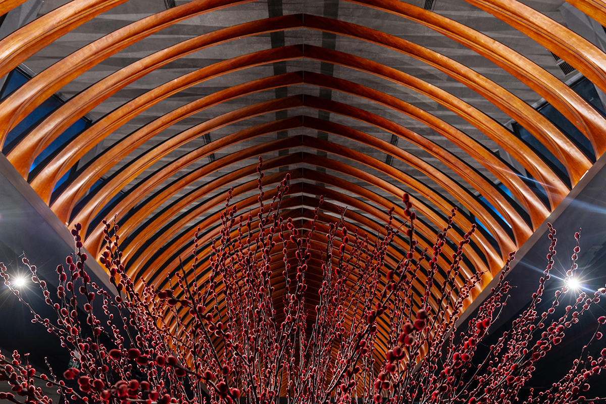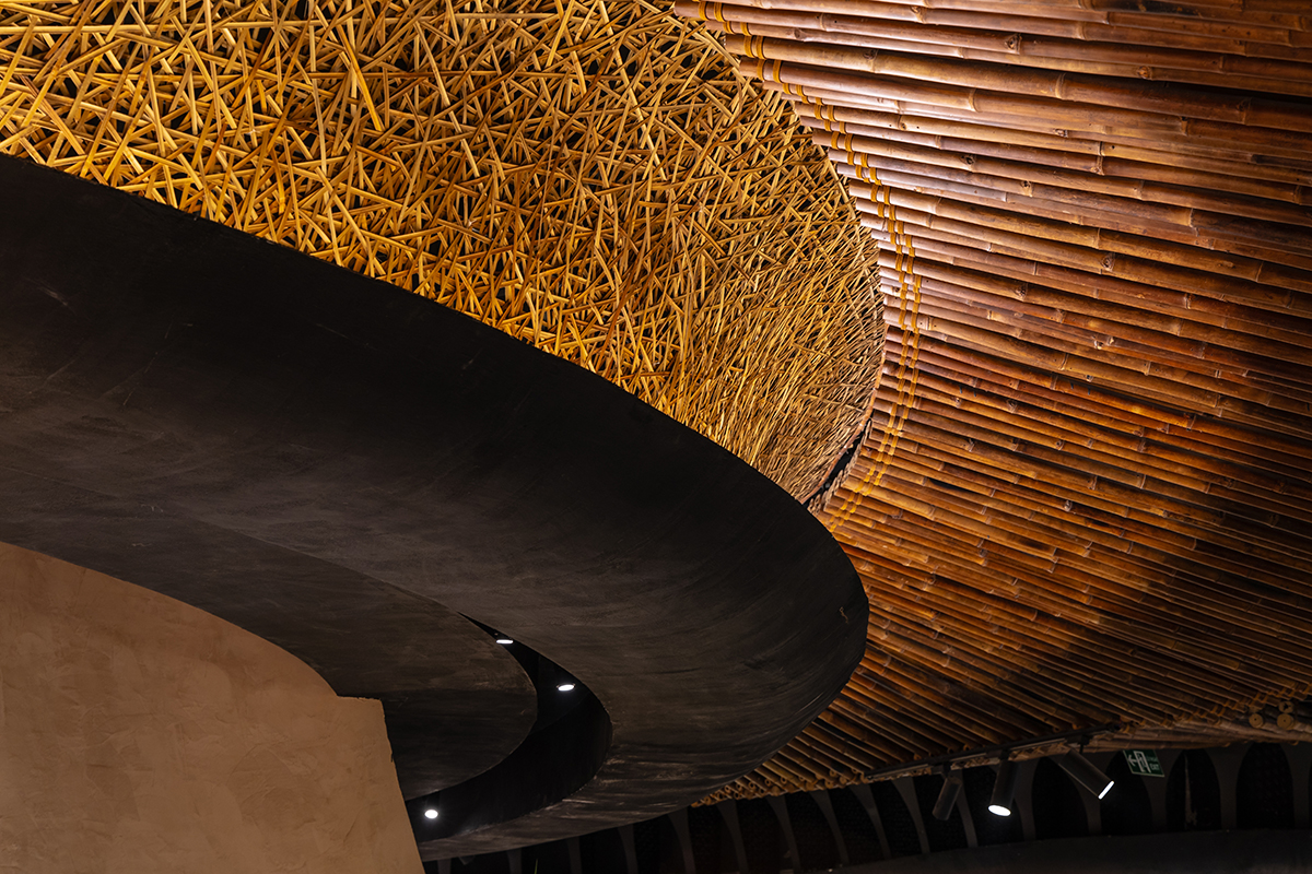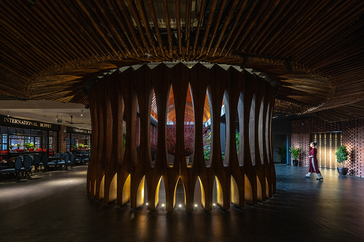 Các vật liệu sử dụng trong thiết kế từng quầy buffet đa dạng và tinh tế, từ những lau tre, thép thô, giấy truyền thống Việt Nam, lớp sơn vỏ trấu cho đến các họa tiết ánh sáng tinh xảo, lấy cảm hứng từ hoa văn cổ xưa.