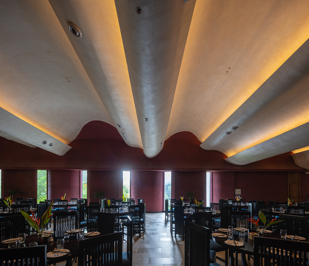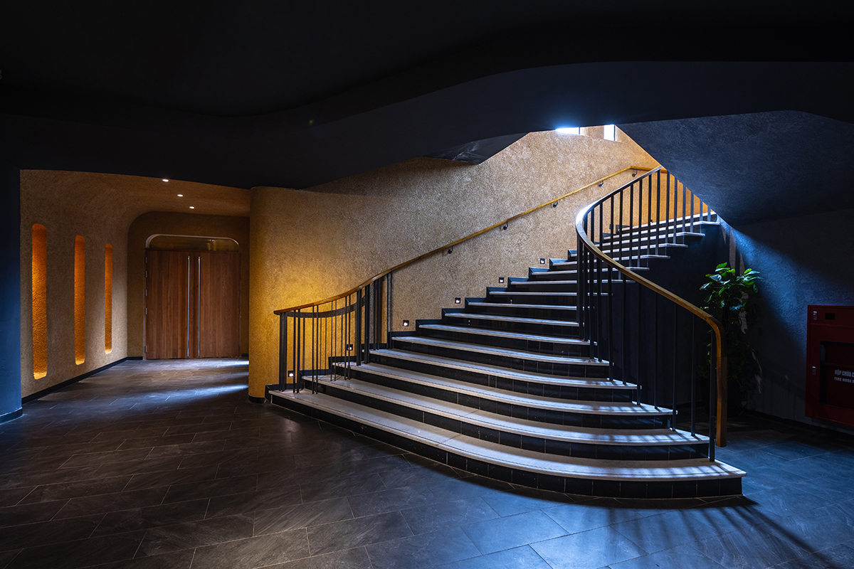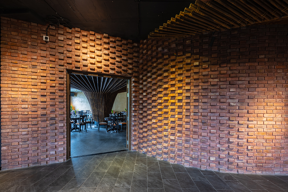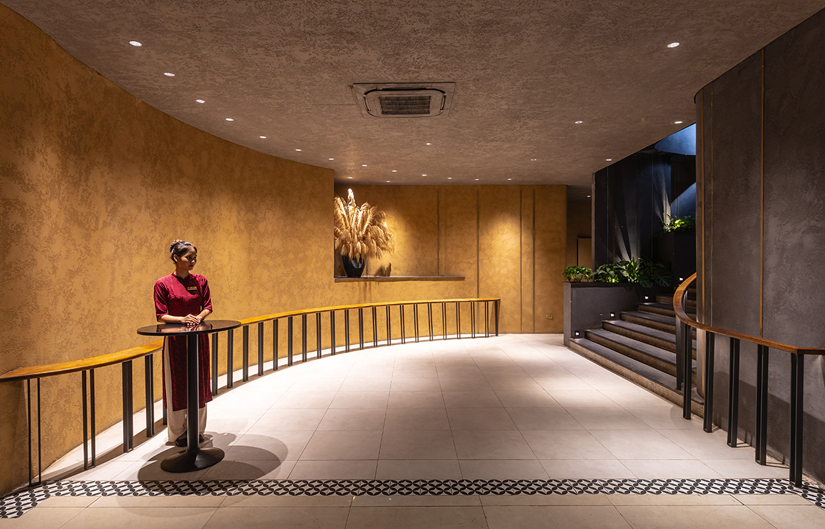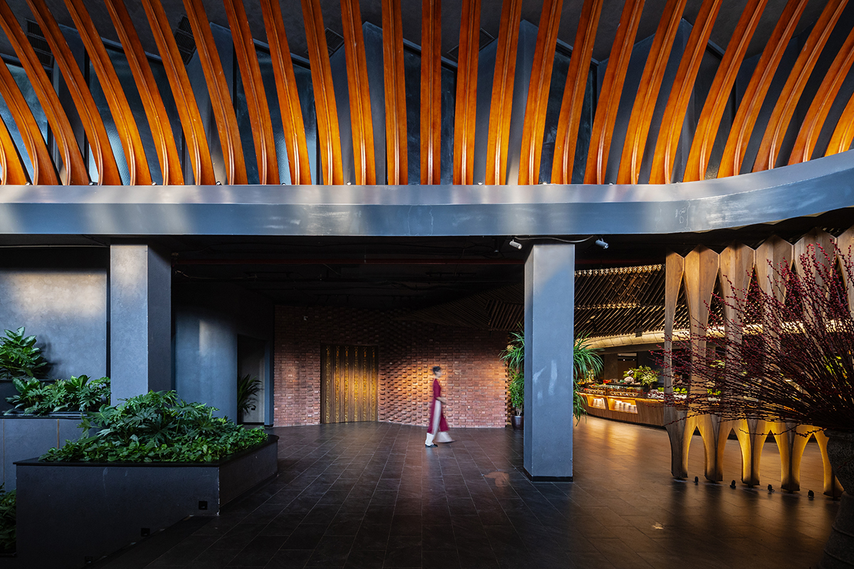 Phòng tiệc được thiết kế với trần nhà trắng sống động giống như những nếp lụa dập dềnh, ý tưởng từ hình ảnh truyền thống của miền Bắc Việt Nam. Tường của phòng tiệc được thiết kế sơn màu đỏ rượu vang đậm, lấy cảm hứng từ rượu vang địa phương, khi kết hợp với trần nhà trằng làm tăng thêm cảm giác ấm áp cho không gian. Phòng ăn riêng tư thì được thiết kế nổi bật với bức tường gạch theo nhịp điệu gợi nhớ đến phong cách kiến trúc Champa độc đáo và tinh xảo, giúp thực khách cảm nhận vẻ đẹp cổ kính theo dòng thời gian.