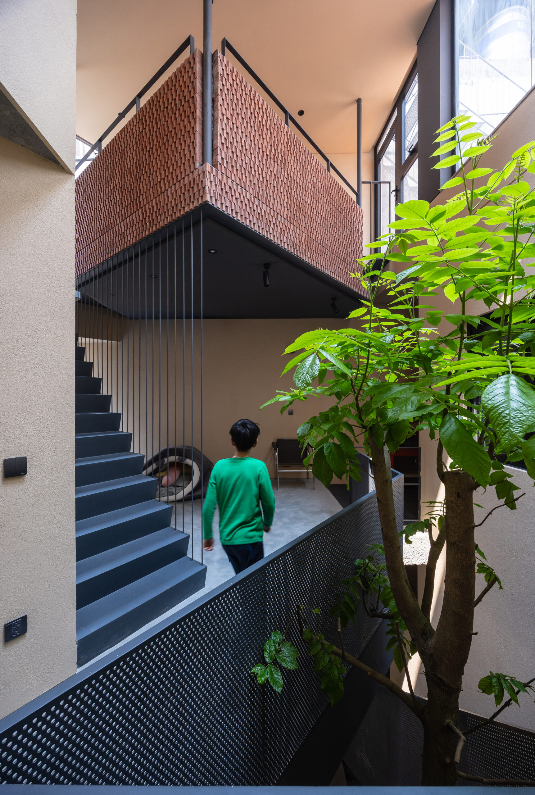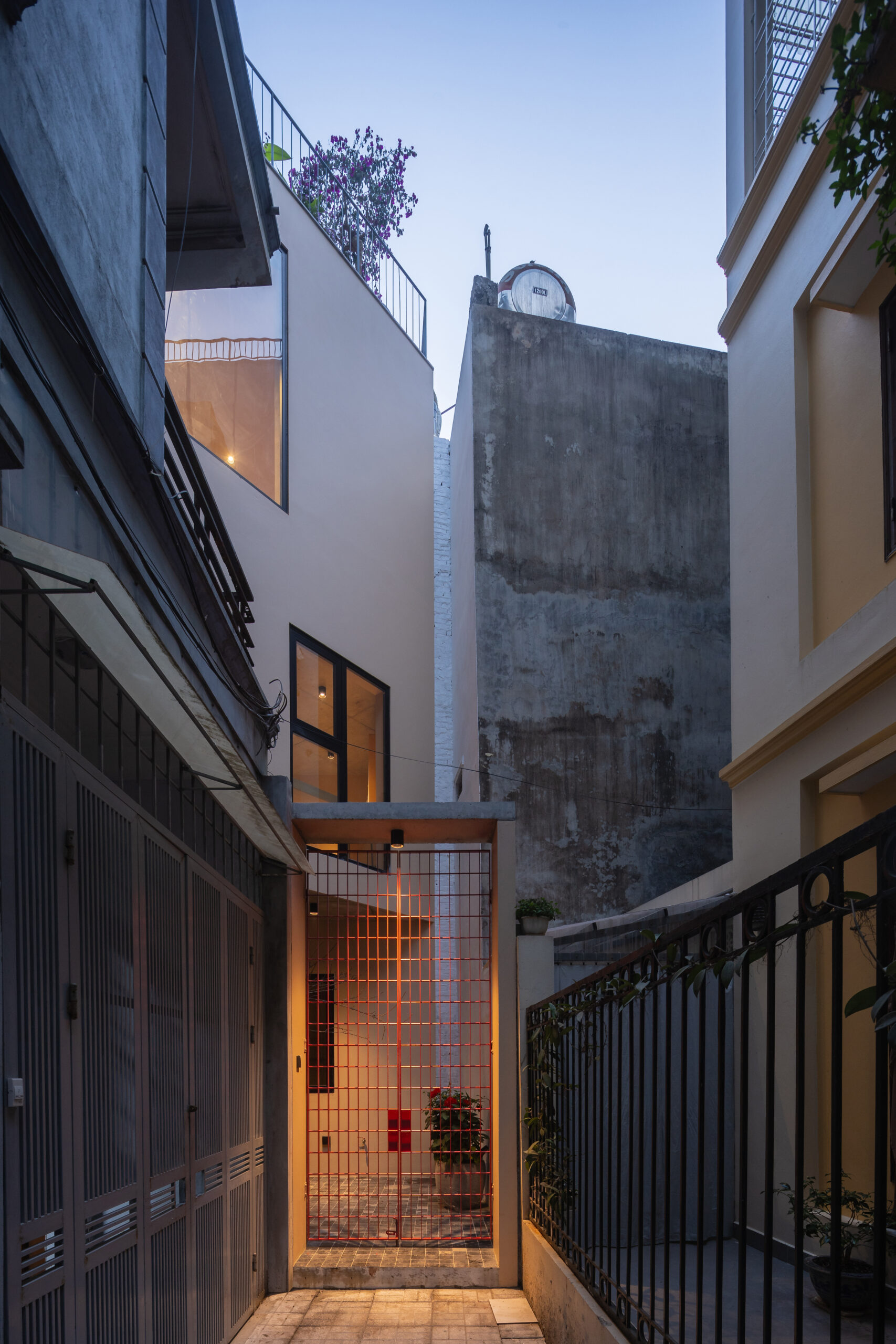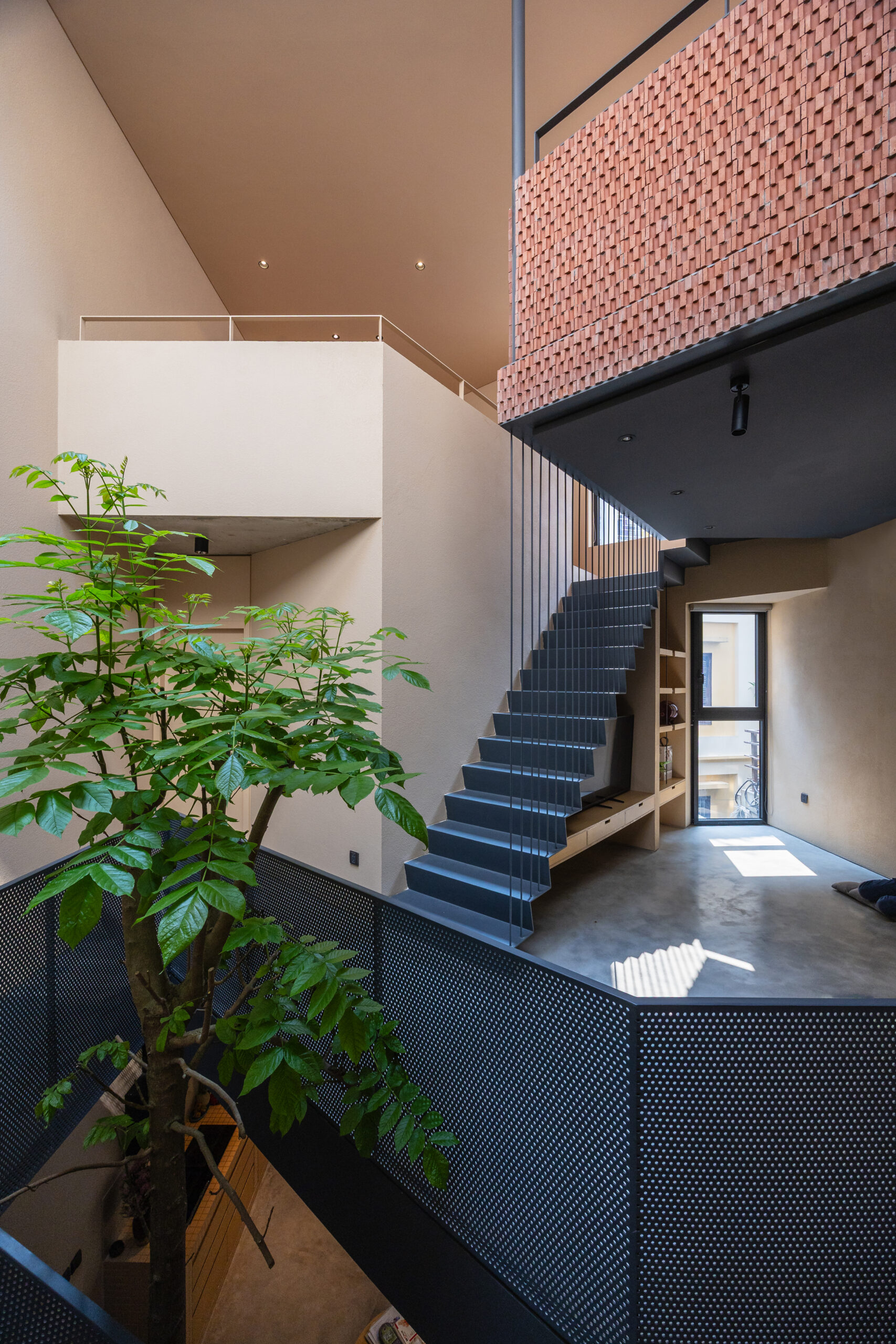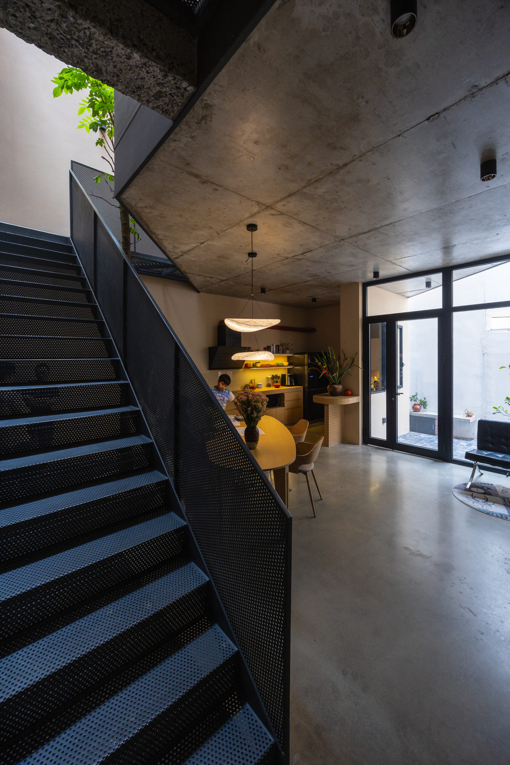 Nằm giữa những khối nhà cao tầng san sát, Lĩnh Nam House gây ấn tượng bởi cách xử lý không gian thông minh dù lối vào chỉ rộng vỏn vẹn 1,5m. Thay vì tận dụng tối đa chiều cao như các công trình xung quanh, ngôi nhà duy trì một cao độ khiêm tốn để tạo nên khoảng thở, hình thành một “thung lũng” yên tĩnh và tách biệt giữa lòng phố thị ồn ào.