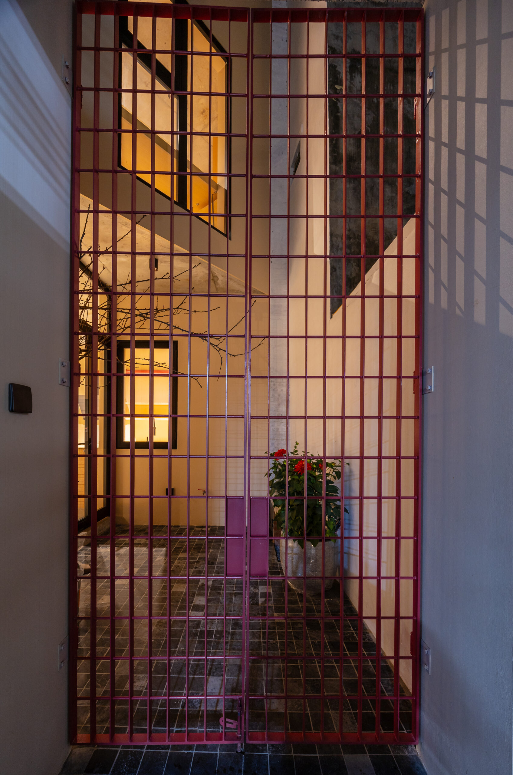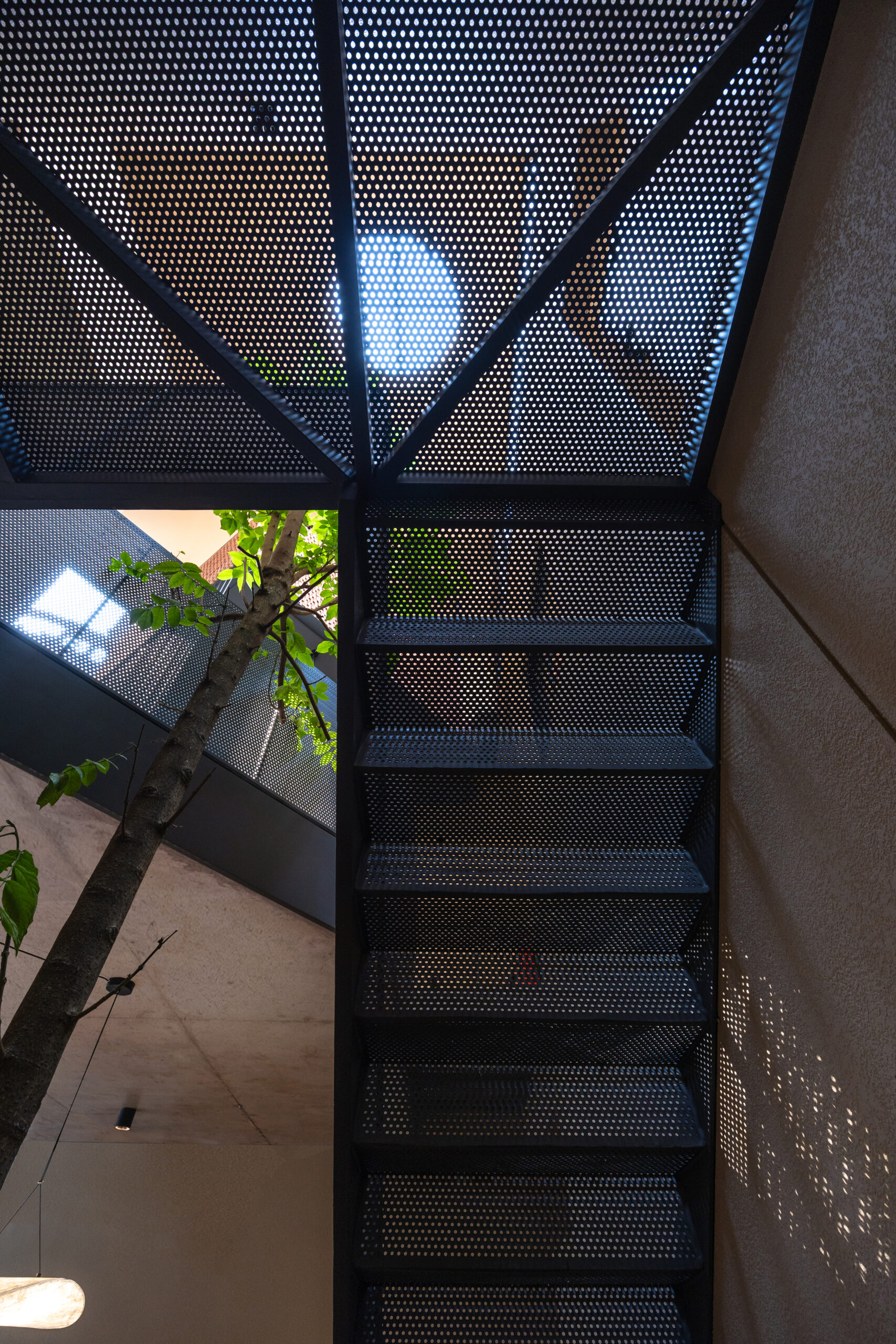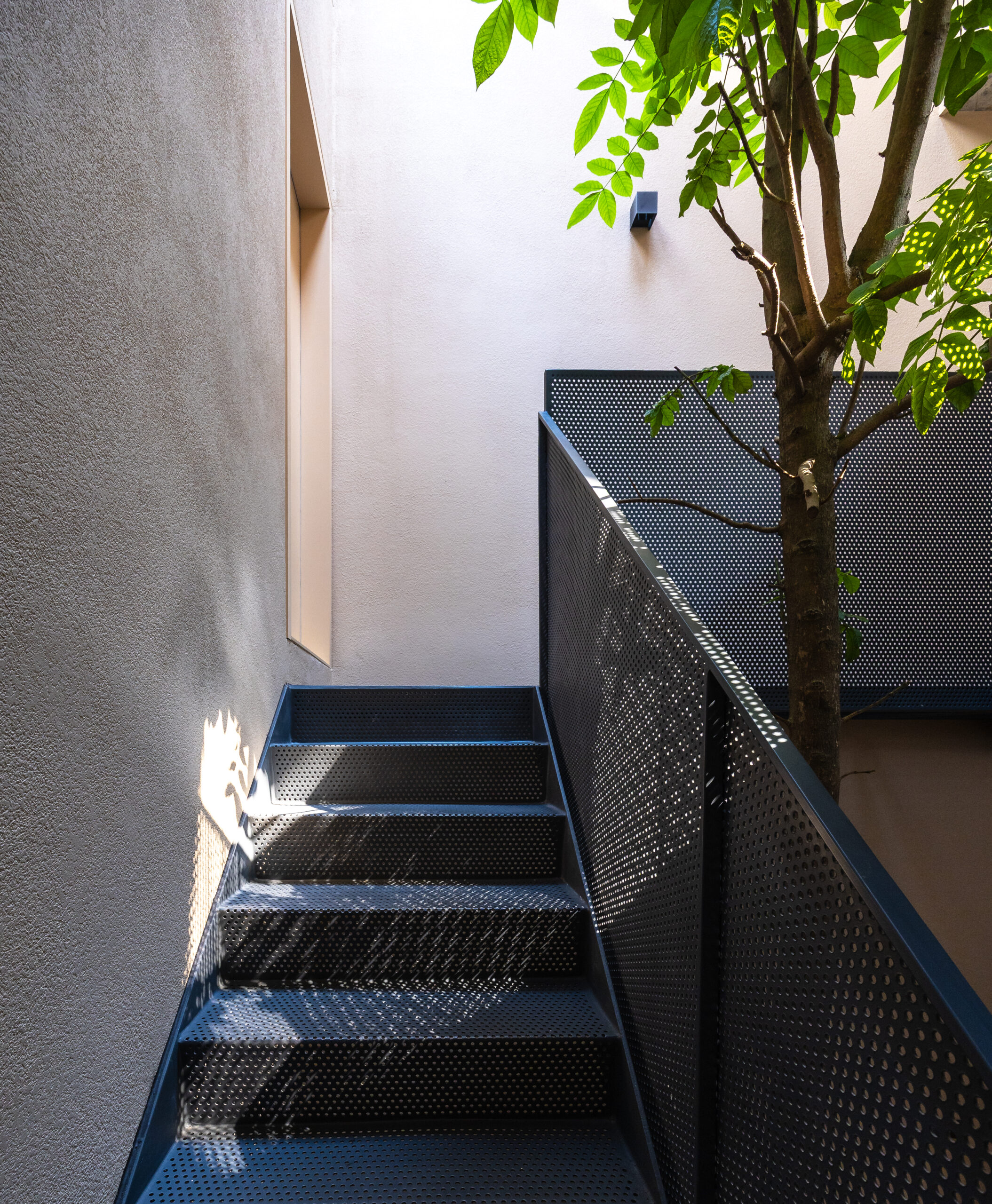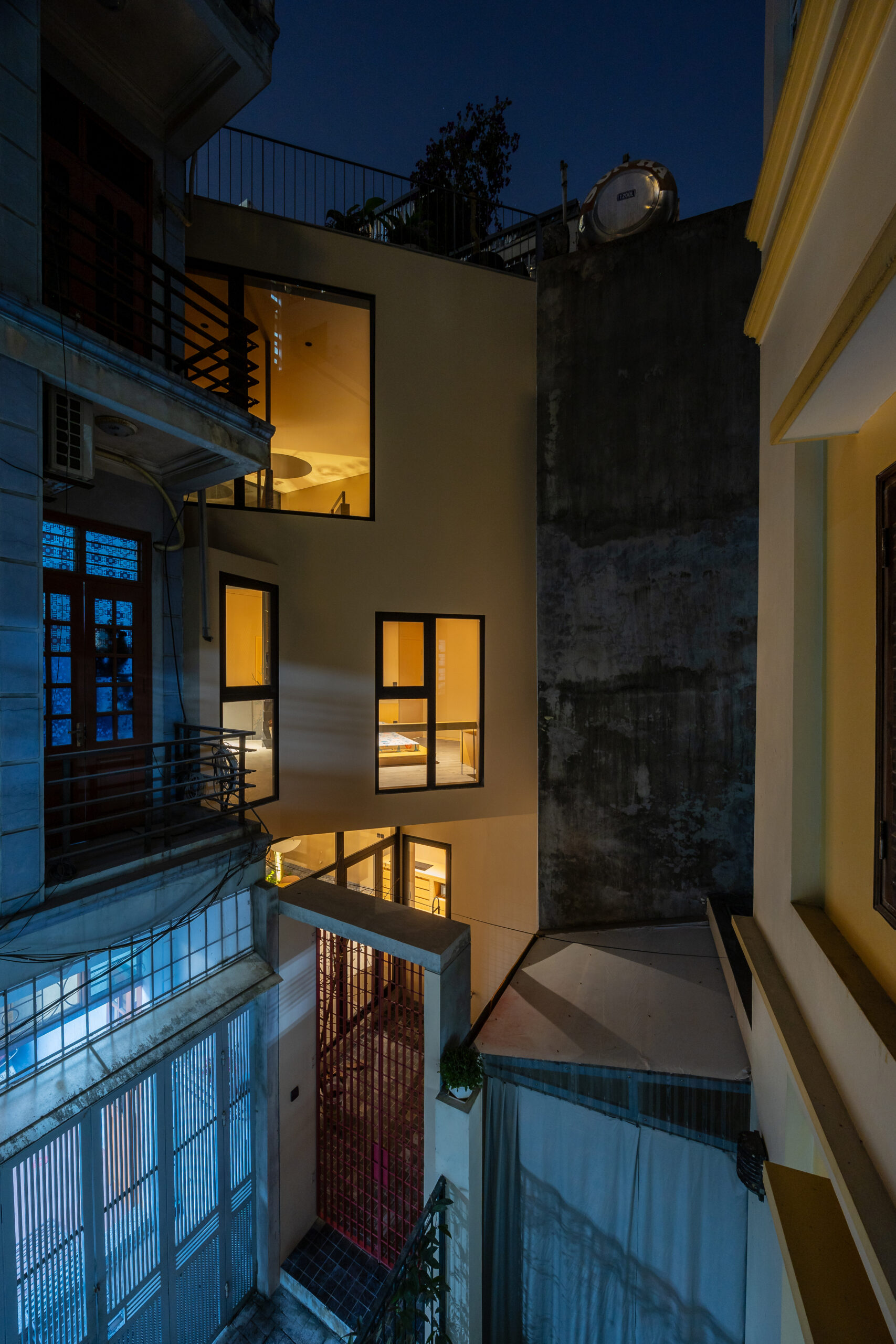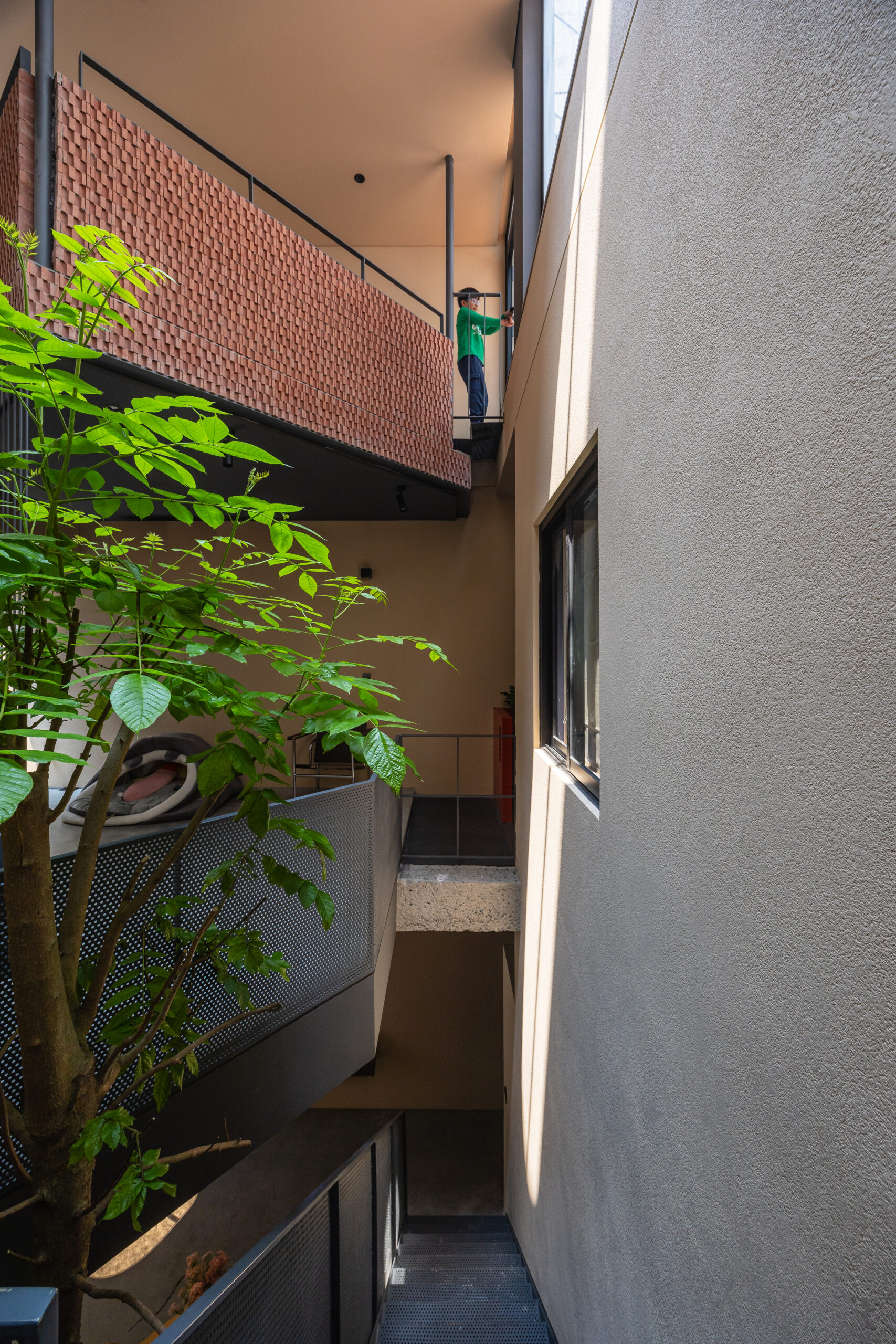 Nằm giữa những khối nhà cao tầng san sát, Lĩnh Nam House gây ấn tượng bởi cách xử lý không gian thông minh dù lối vào chỉ rộng vỏn vẹn 1,5m. Thay vì tận dụng tối đa chiều cao như các công trình xung quanh, ngôi nhà duy trì một cao độ khiêm tốn để tạo nên khoảng thở, hình thành một “thung lũng” yên tĩnh và tách biệt giữa lòng phố thị ồn ào.