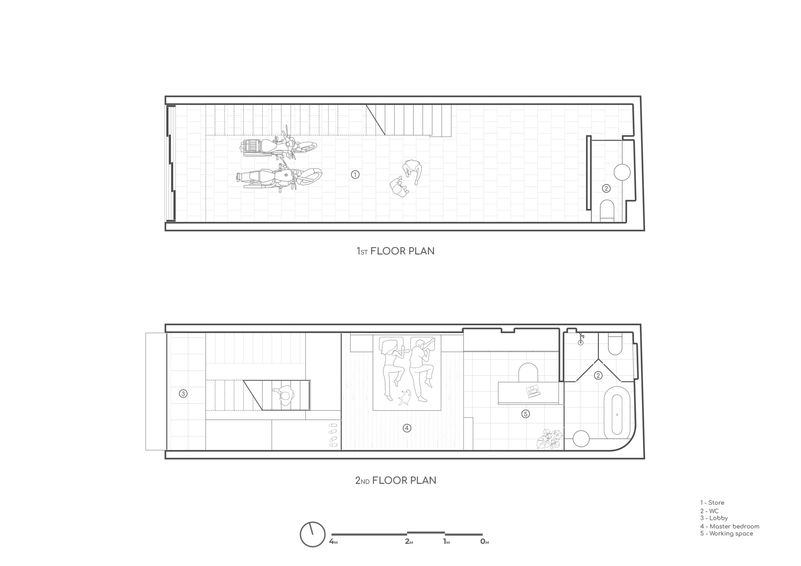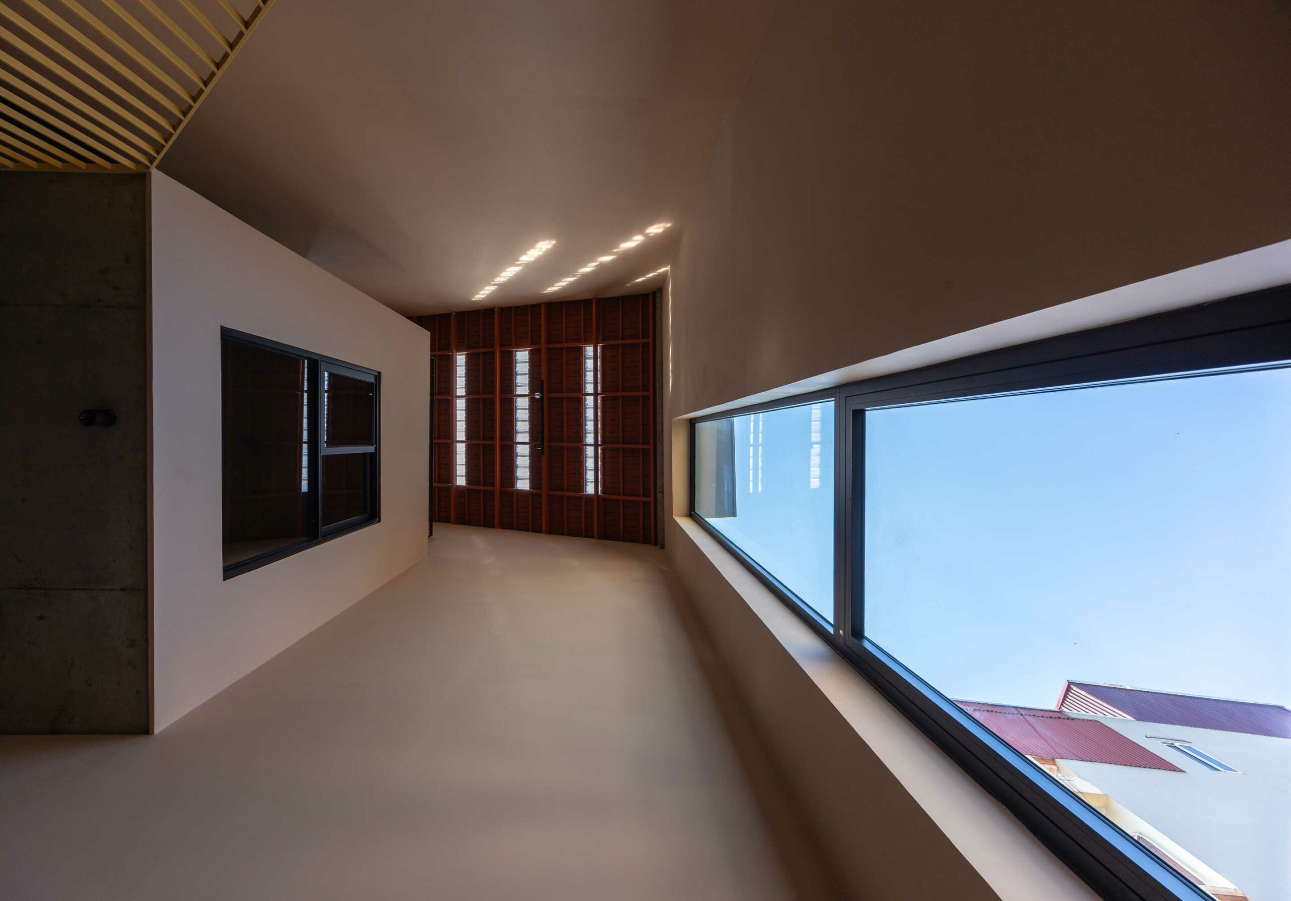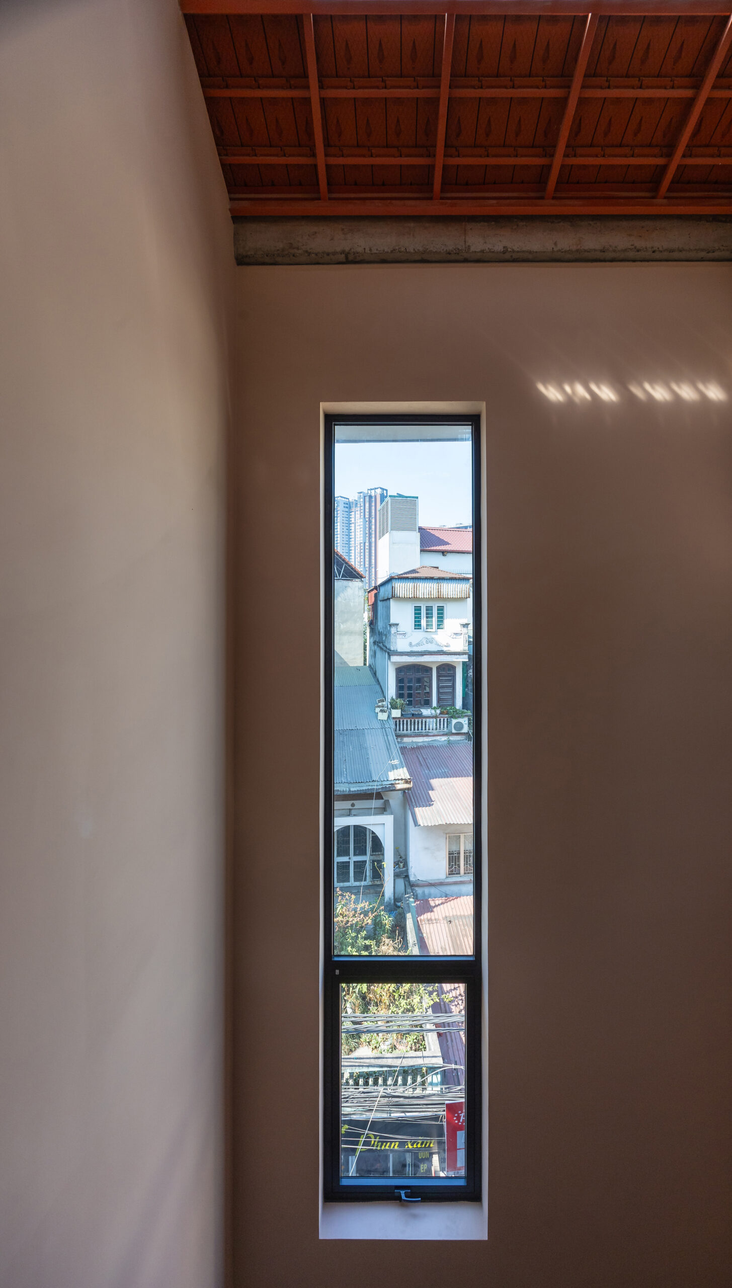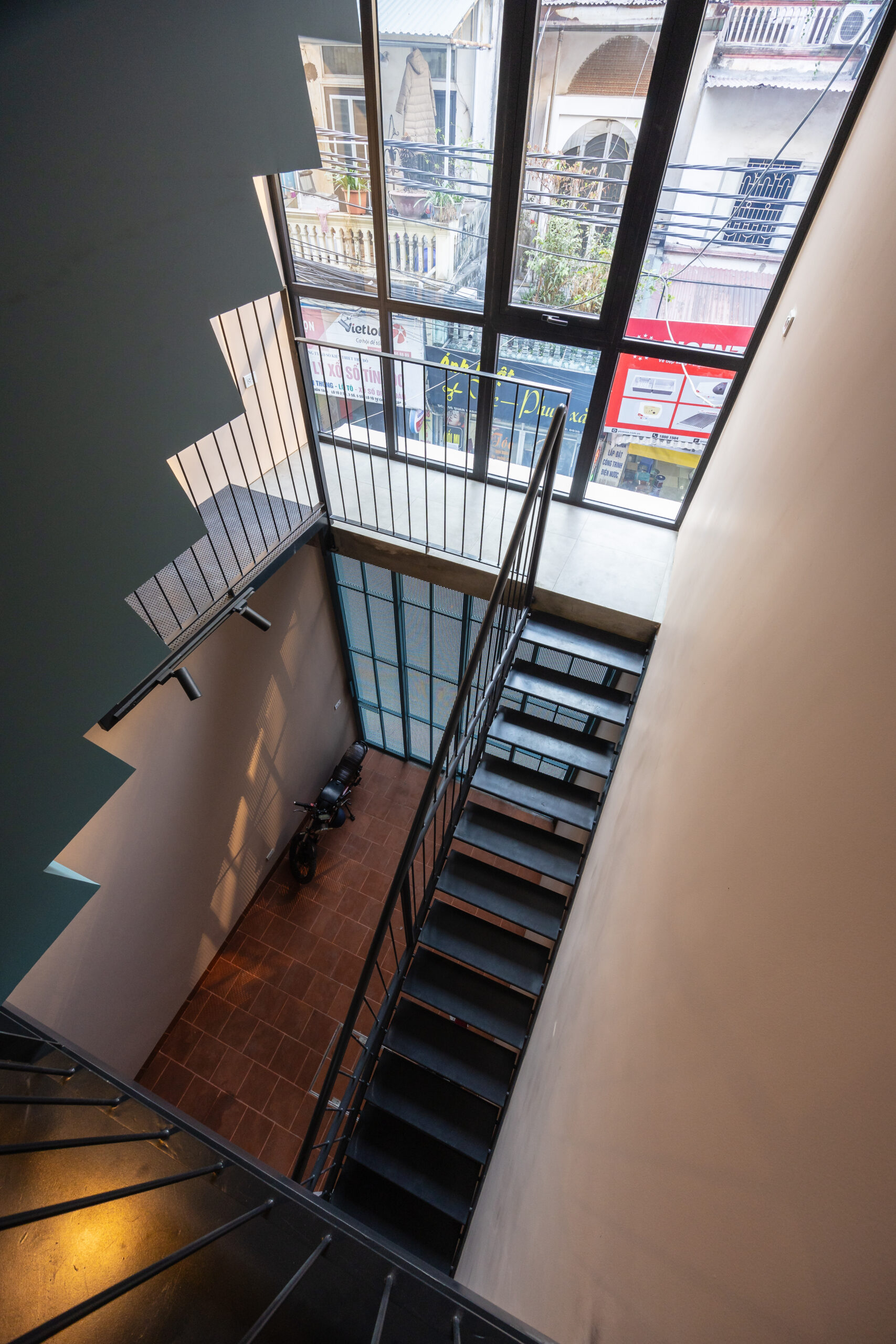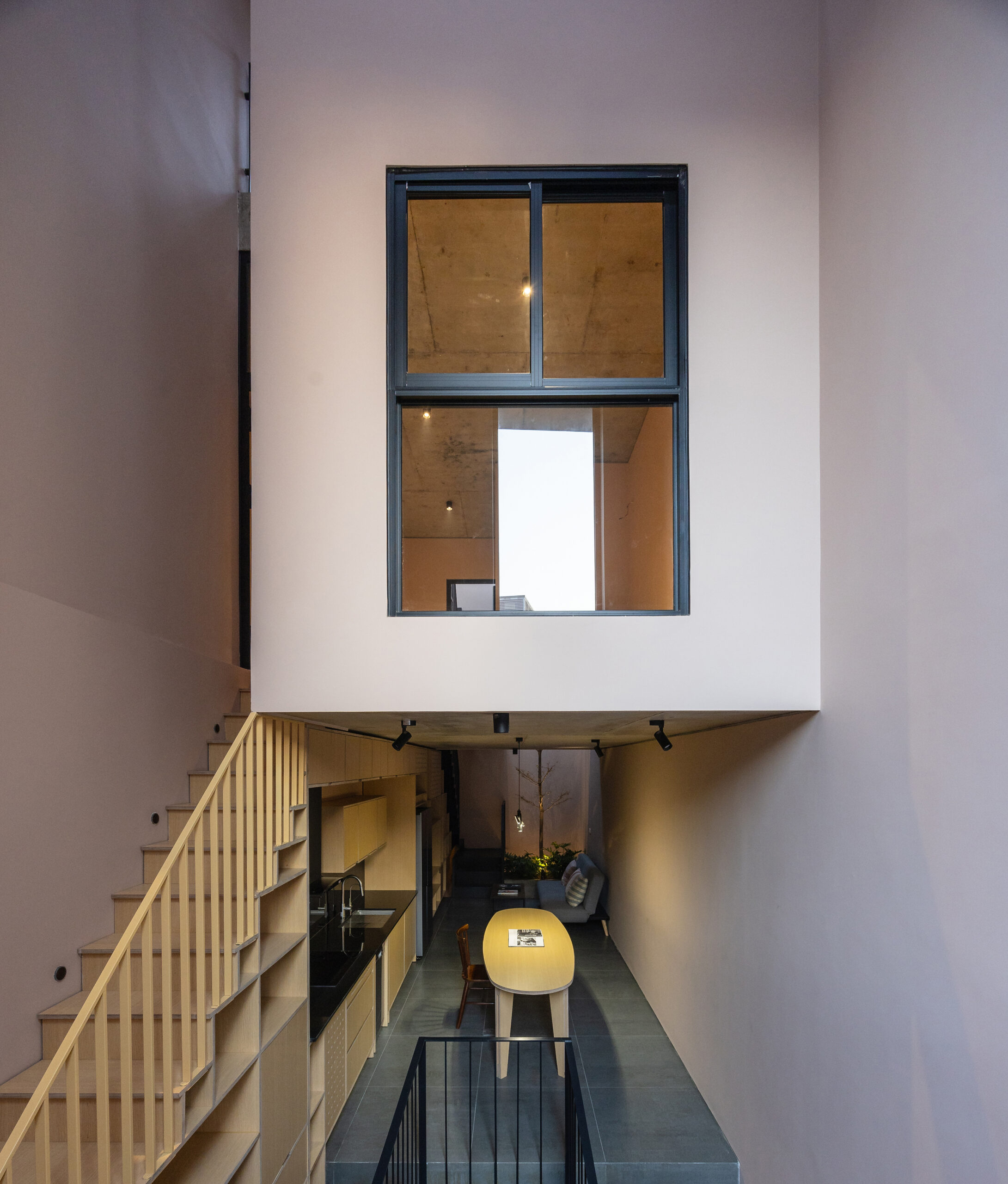 Cấu trúc ngôi nhà chia thành 2 phần : Ở và Cho thuê. Không gian Ở được nâng đến một chiều cao nhất định để tránh xa tiếng ồn và bụi bặm, lợi thế là tạo nên một không gian thoáng đãng cho các hoạt động kinh doanh tại tầng một. Mặc dù có hạn chế về diện tích và tầm nhìn, nhưng không vì thế mà ngôi nhà thiếu đi những khoảng trống chứa đựng nhiều năng lượng và ánh sáng tự nhiên. Dường như bầu trời là thứ duy nhất không mang lại giới hạn cho ngôi nhà.