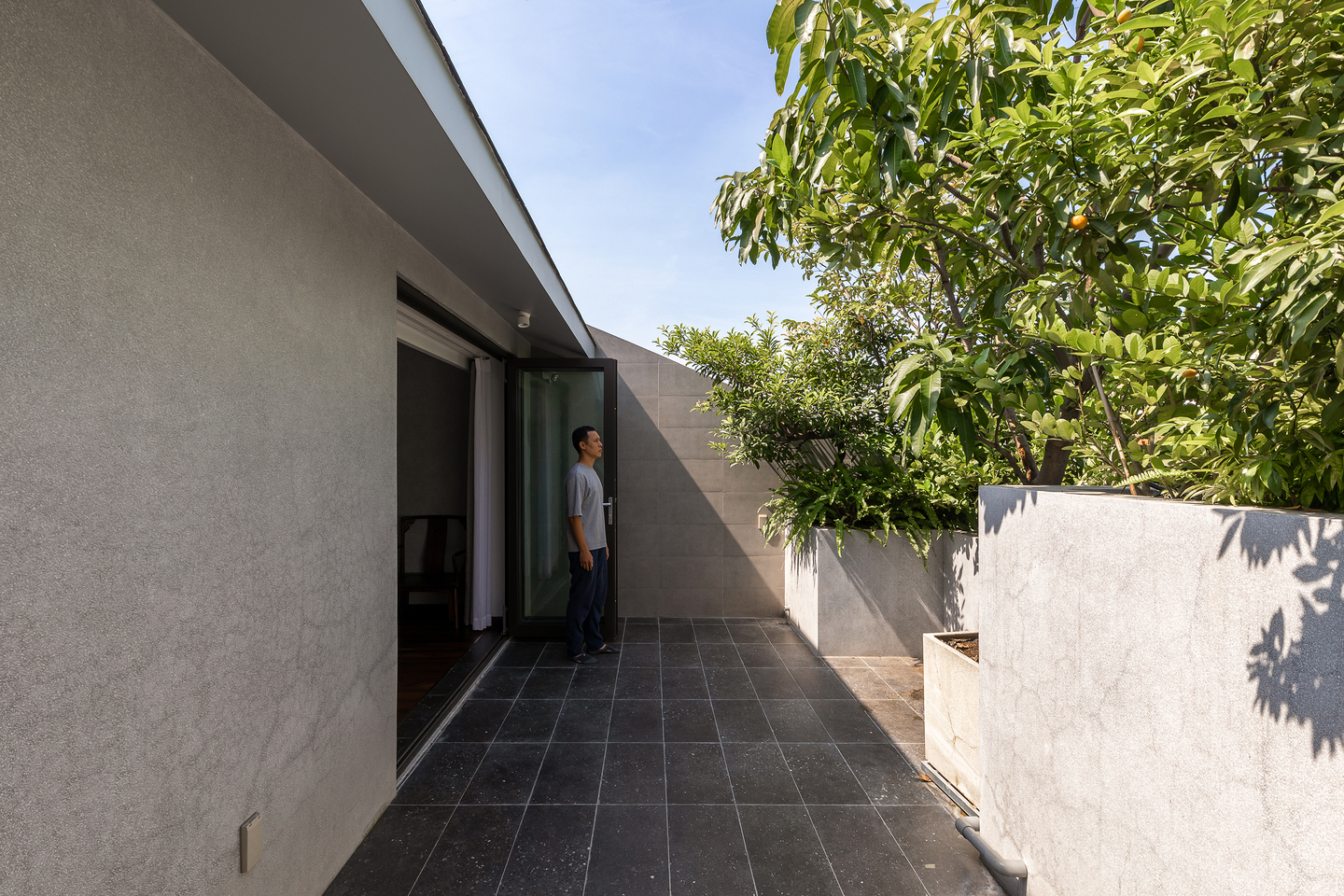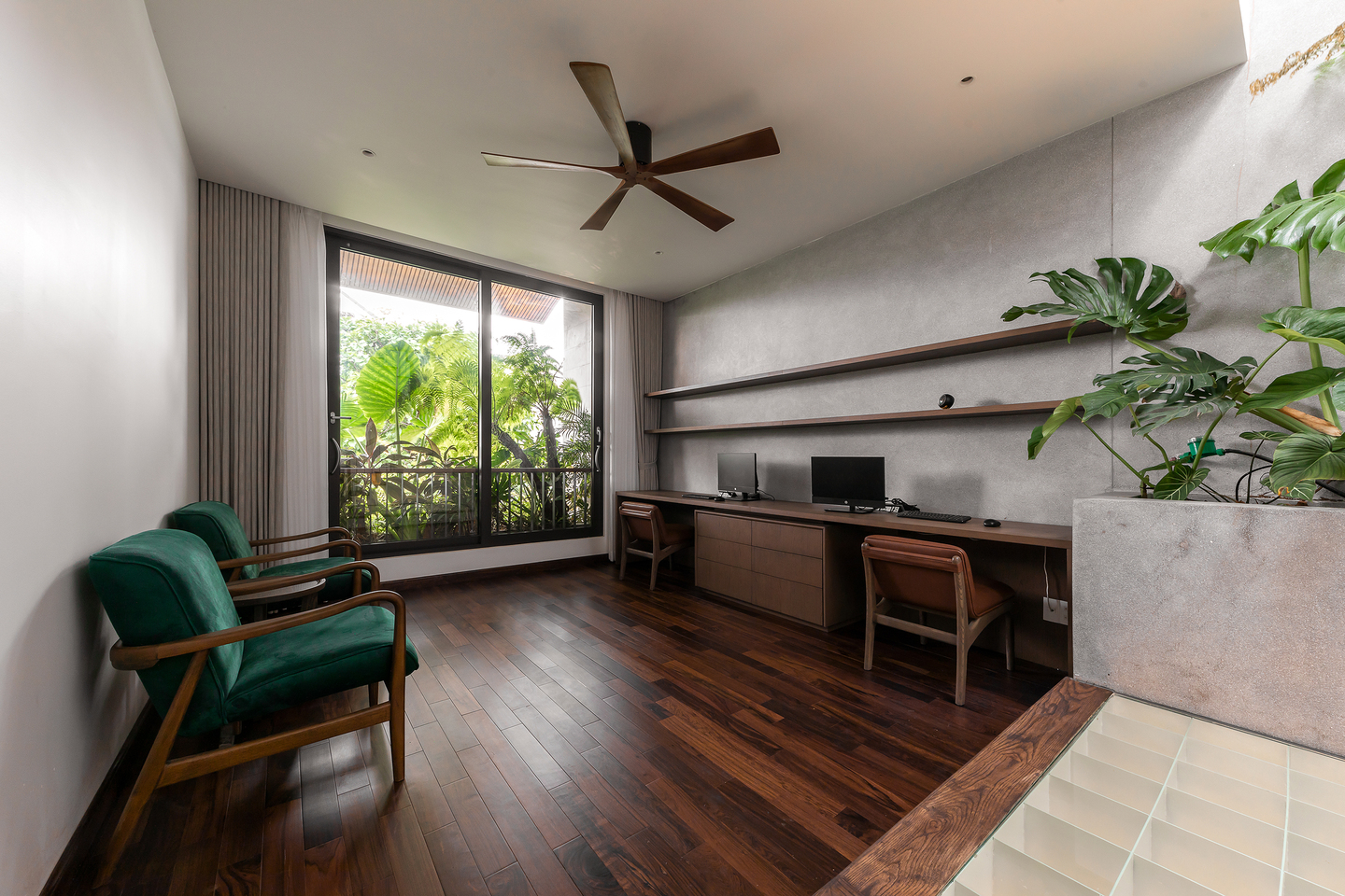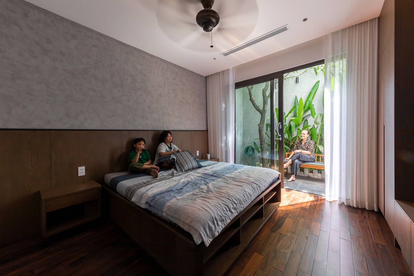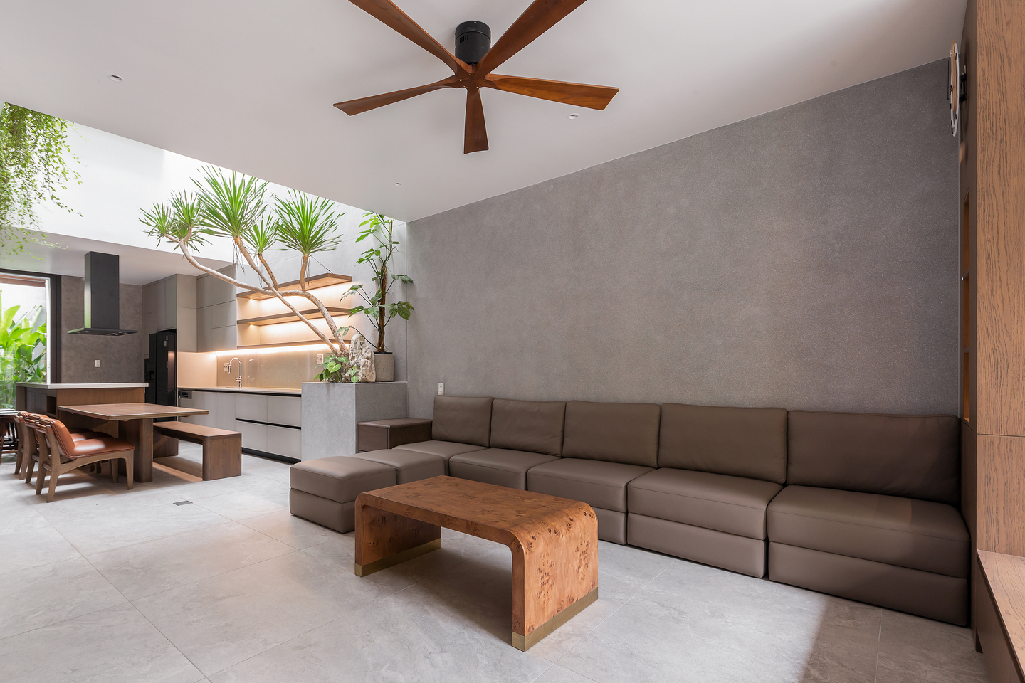 Các chất liệu mộc mạc, từ đá mài , gỗ , sơn giả bê tông…. những vật liệu mang tính mộc mạc và kết hợp với các mảng tường sơn trắng, ánh sáng , cây xanh cũng có sự năng động tươi sáng trung hòa cho bà và cháu cùng ở chung một ngôi nhà