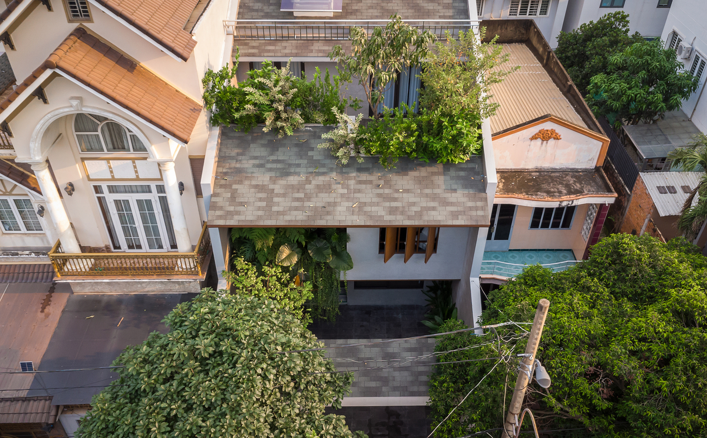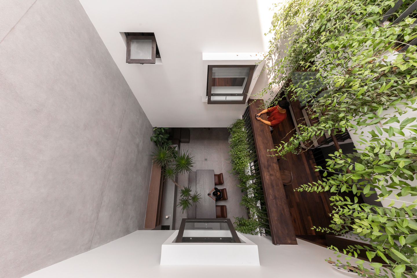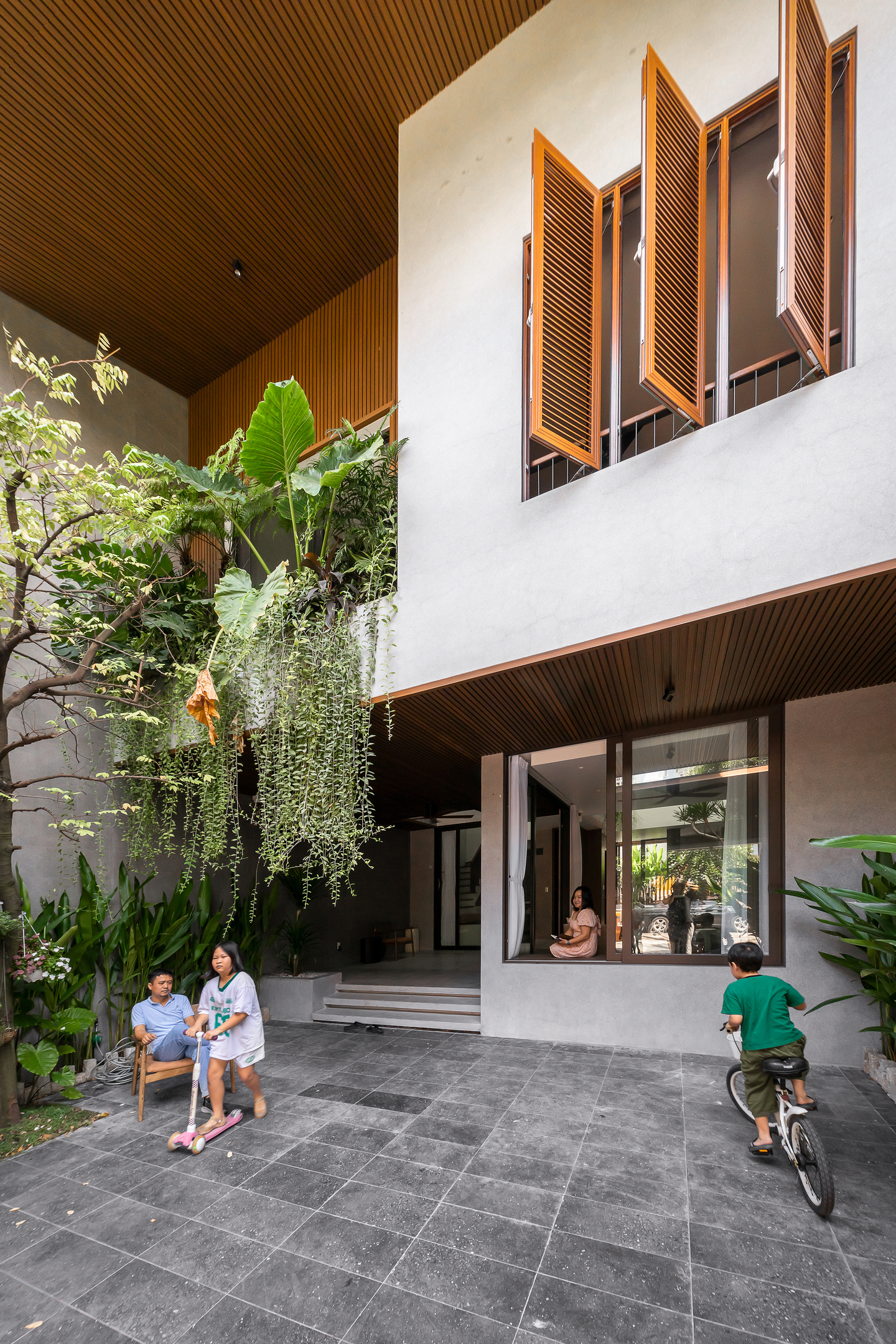 Khoảng sân được che mưa nắng bỡi 2 lớp mái , mái cổng phía dưới đưa vô và mái nhà phía trên lòi ra. 2 mái có cao độ khác nhau tạo ra khoảng hở để ánh sáng vào được khu vực sân để trồng cây, bên trong sân thì thoát khí ra tạo sự thông thoáng, và ngồi ở sân có thể gắm bầu trời không bị cản tầm nhìn.