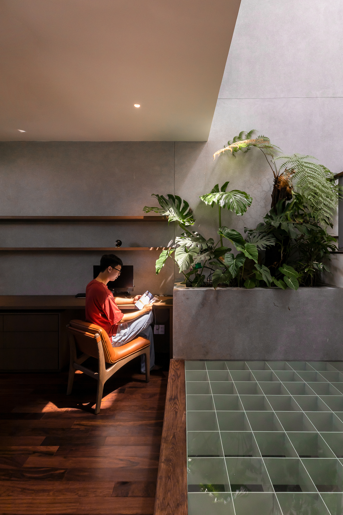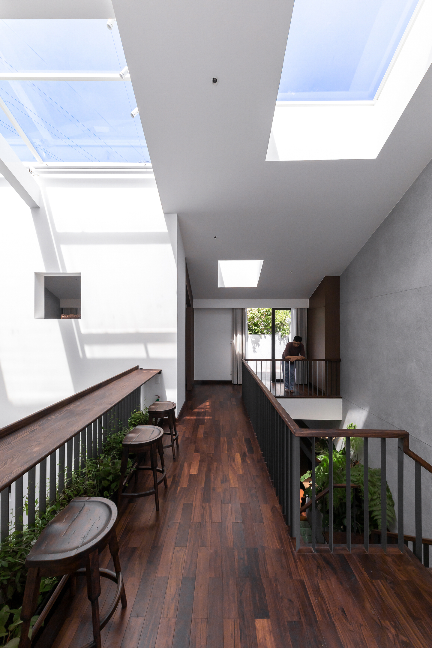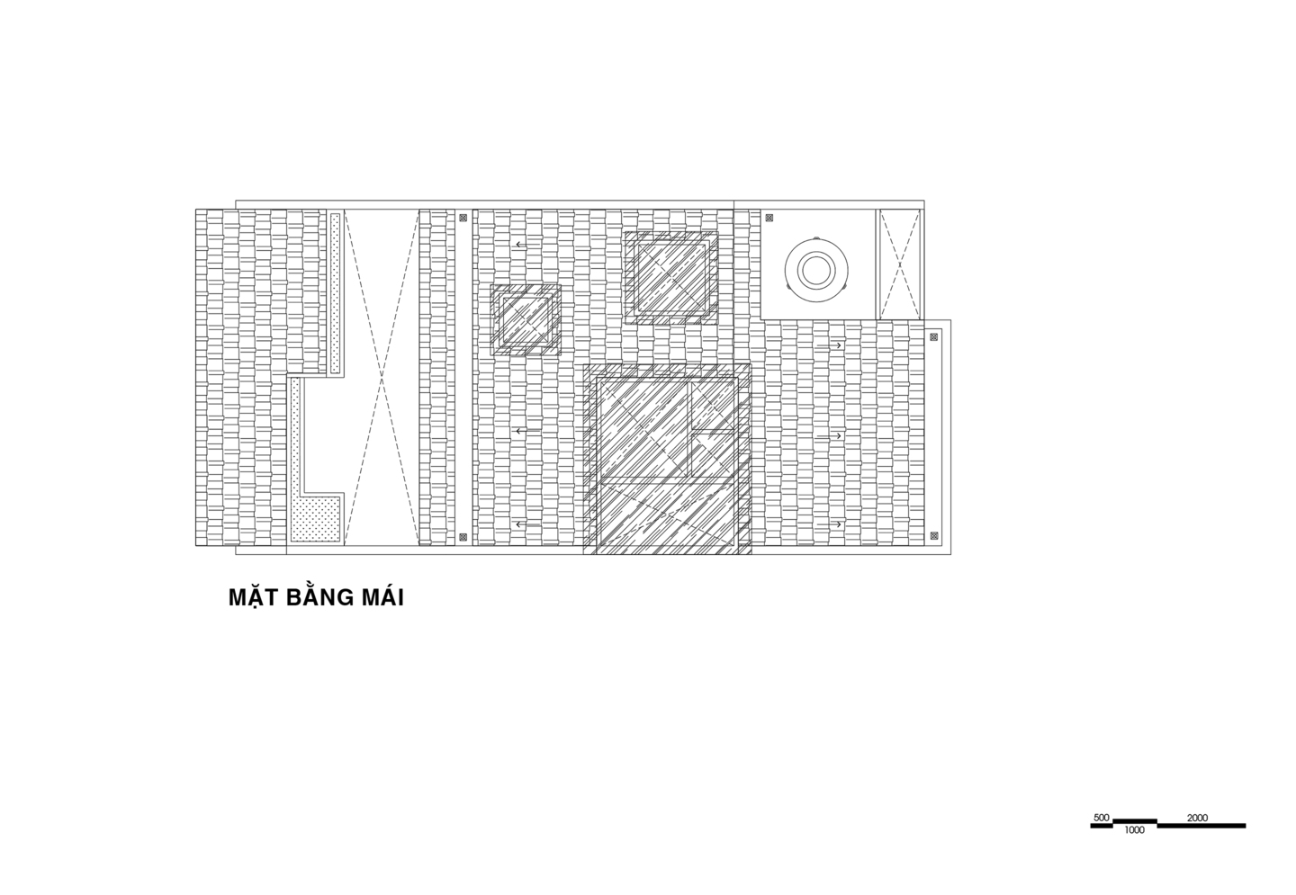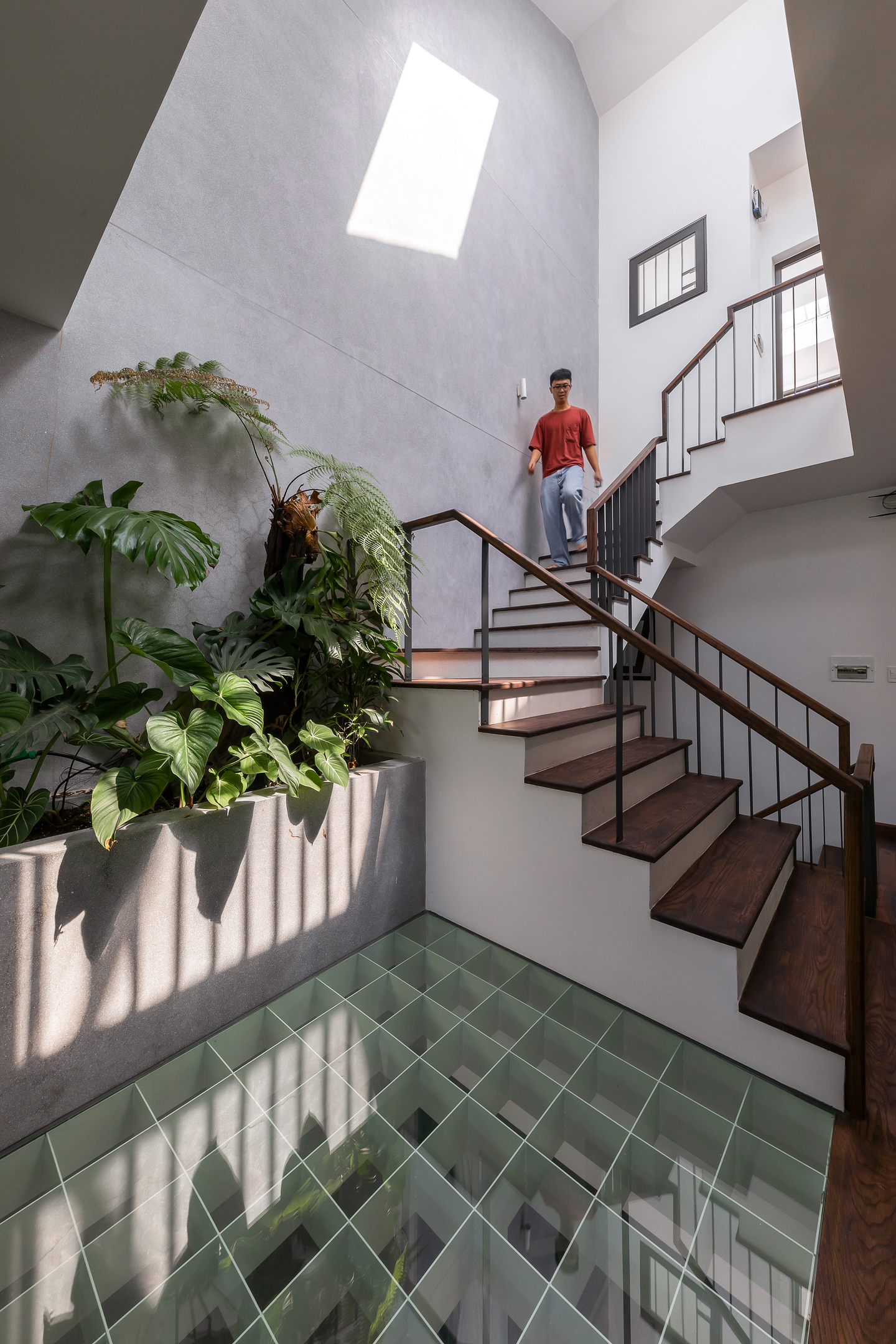 Phần mái được khoét nhiều lấy sáng ở các vị trí khác nhau để đưa ánh sáng điều vào các vị trí khác nhau của ngôi nhà, kết hợp với các chậu cây xanh tạo ra được sự mềm mại và xanh mát của không gian trên nền tường đá mài xám