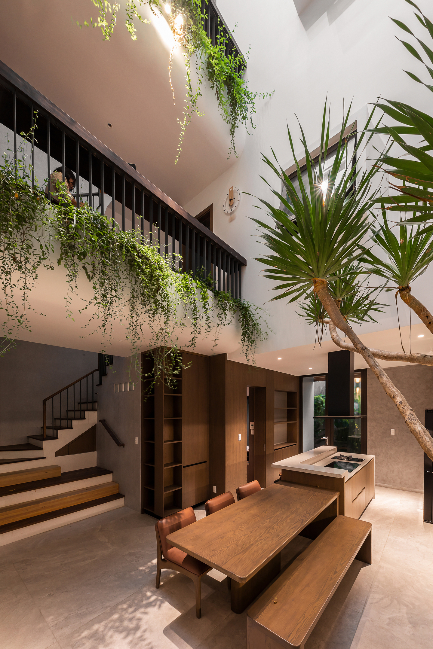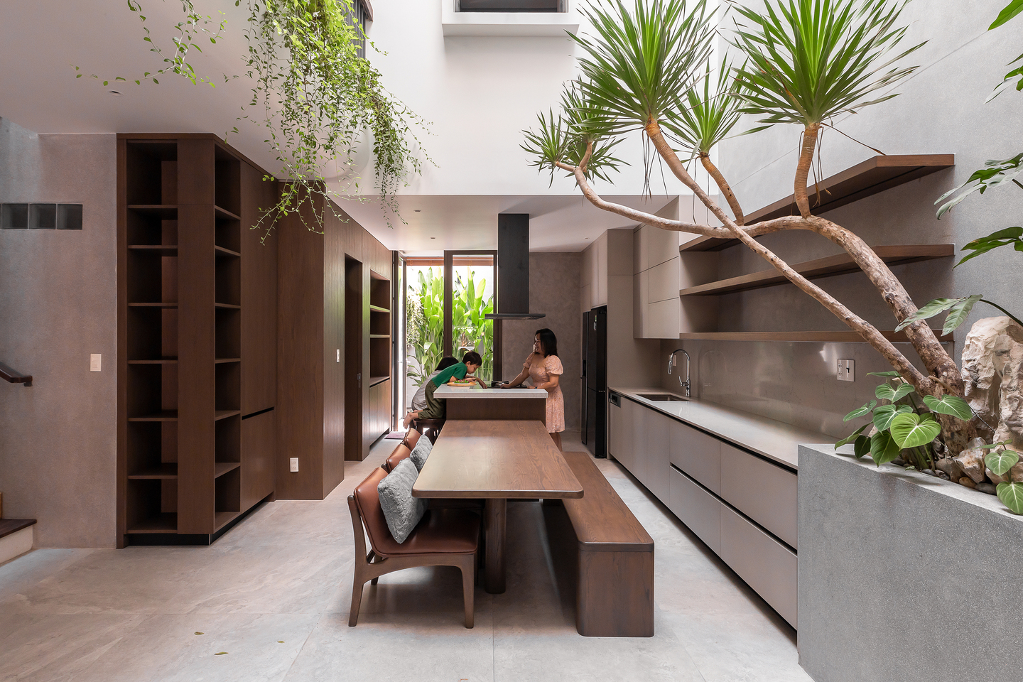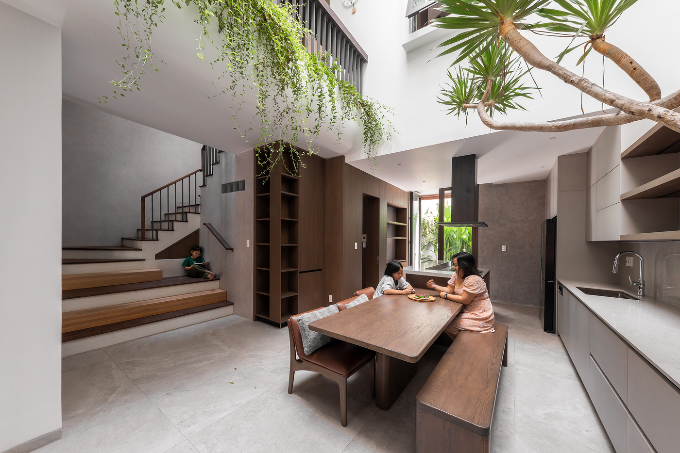 Khu vực bàn ăn ở vị trí trung tâm , và thông tầng lên tới mái. Vị trí mái được làm mái kính có rèm điều khiển tự động để điều tiết ánh sáng vào nhà, tạo ra không gian ăn một cách thư giãn thông thoáng, khoảng thông tầng này dùng để kết nối tầm nhìn các tầng với nhau, tạo ra sự ngần gũi giữa ba thế hệ cùng sống chung. và các ô thông tầng ở các sàn lớn nhỏ khác nhau giúp đưa ánh sáng và tầm nhìn xuống tới sảnh vào nhà , giúp sảnh nằm bên hông mà không bị tối. và thể quan sát được sảnh vào nhà từ vị trí tầng 3
