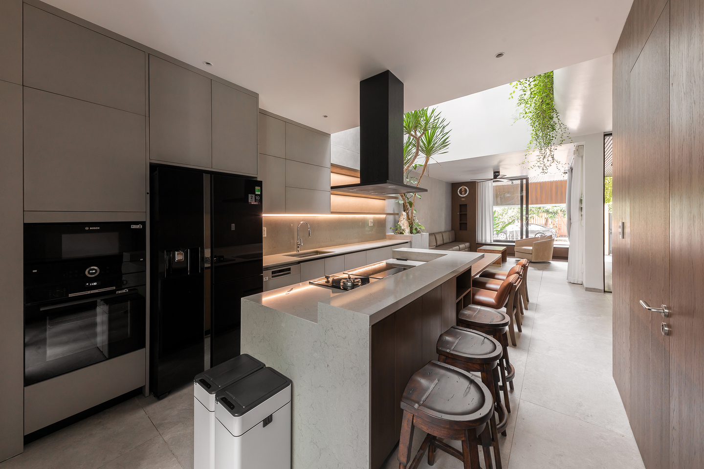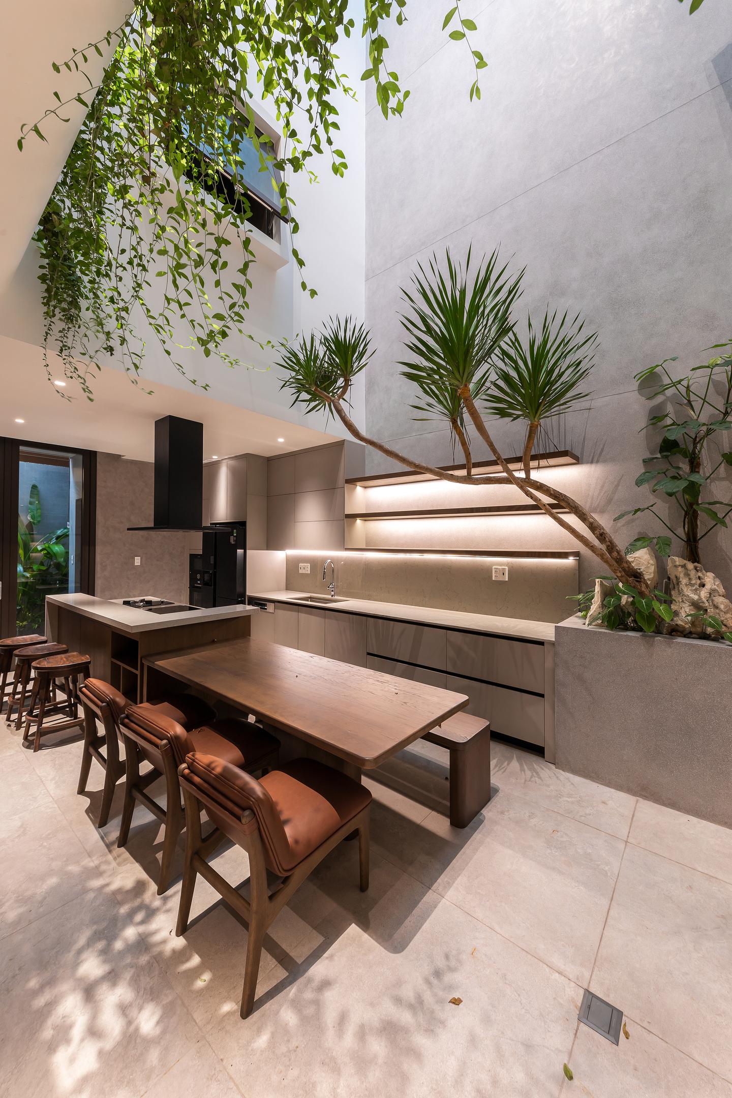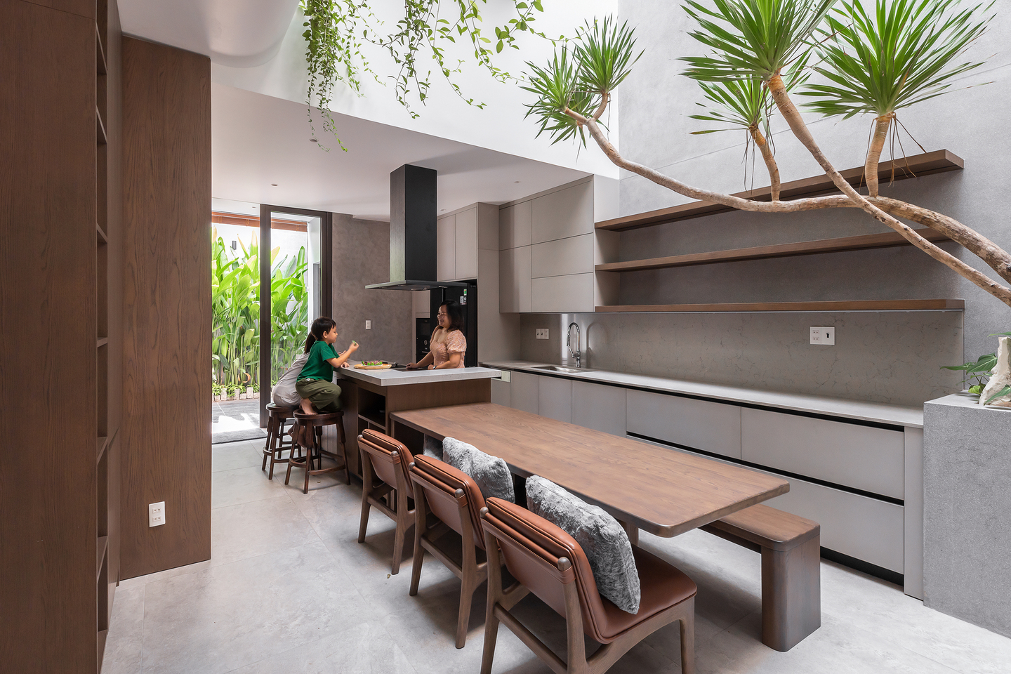 Khu vực bàn ăn ở vị trí trung tâm , và thông tầng lên tới mái. Vị trí mái được làm mái kính có rèm điều khiển tự động để điều tiết ánh sáng vào nhà, tạo ra không gian ăn một cách thư giãn thông thoáng, khoảng thông tầng này dùng để kết nối tầm nhìn các tầng với nhau, tạo ra sự ngần gũi giữa ba thế hệ cùng sống chung. và các ô thông tầng ở các sàn lớn nhỏ khác nhau giúp đưa ánh sáng và tầm nhìn xuống tới sảnh vào nhà , giúp sảnh nằm bên hông mà không bị tối. và thể quan sát được sảnh vào nhà từ vị trí tầng 3