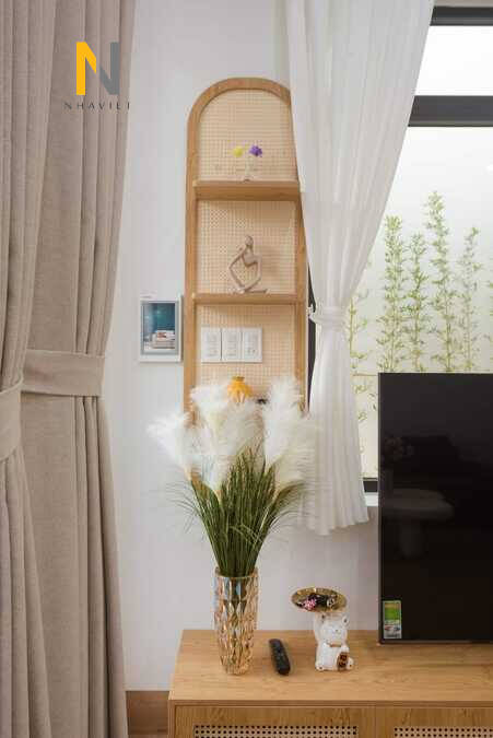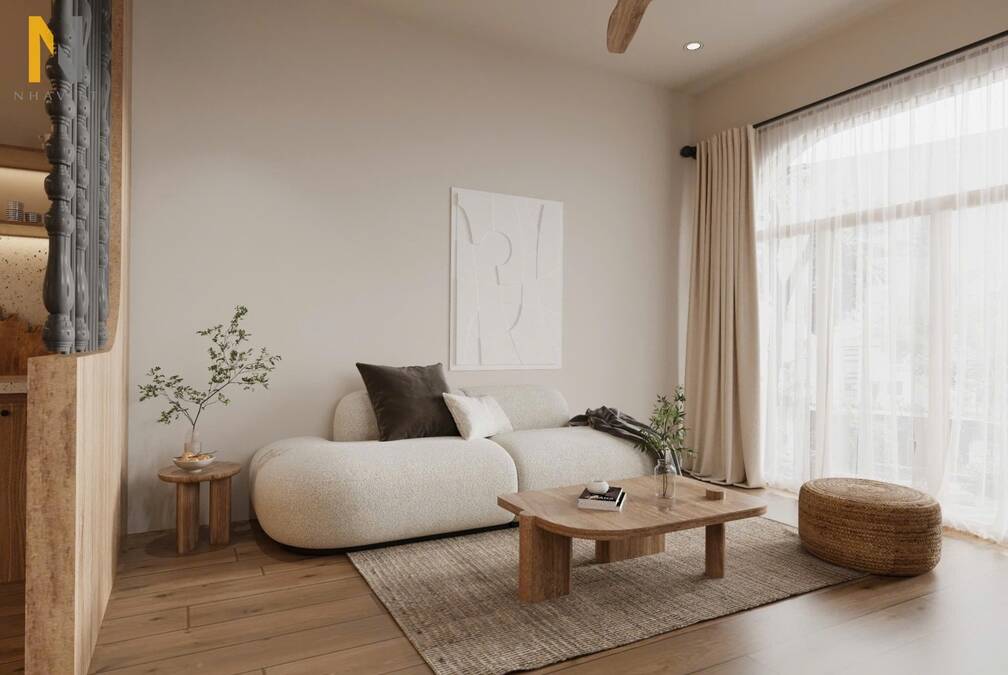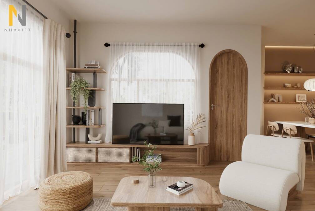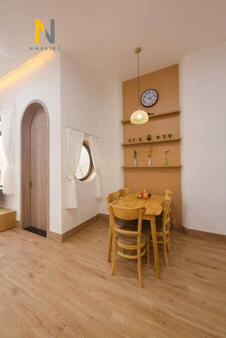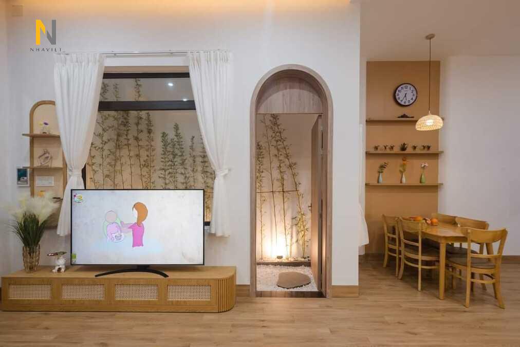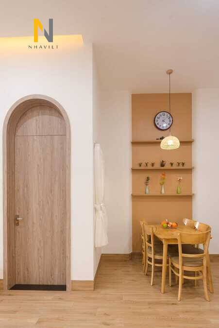 Nội thất của Nick’s House đi theo tinh thần tối giản hiện đại, sử dụng vật liệu gỗ sáng màu là chủ yếu. Các chi tiết như sàn gỗ, hệ tủ liền khối, cửa vòm, kệ trang trí được thiết kế đồng bộ, tinh giản bề mặt, tạo nên một không gian sống gọn gàng, ấm cúng và không vô cảm.