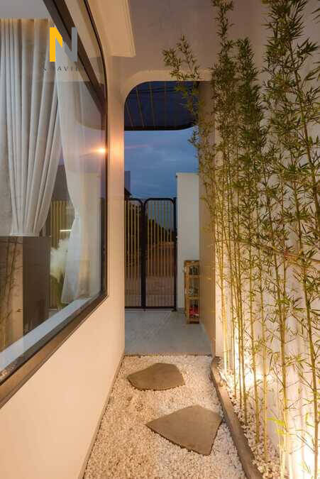 Nick’s House sử dụng gam màu chủ đạo trắng và be nhằm mở rộng thị giác, tăng độ sáng tự nhiên và mang đến cảm giác tinh khiết, nhẹ nhàng. Bên cạnh đó, các điểm nhấn đen trên cửa kính khung thép cùng hệ lam gỗ tông vàng nhạt giúp tạo chiều sâu và sắc thái ấm áp cho tổng thể ngôi nhà.