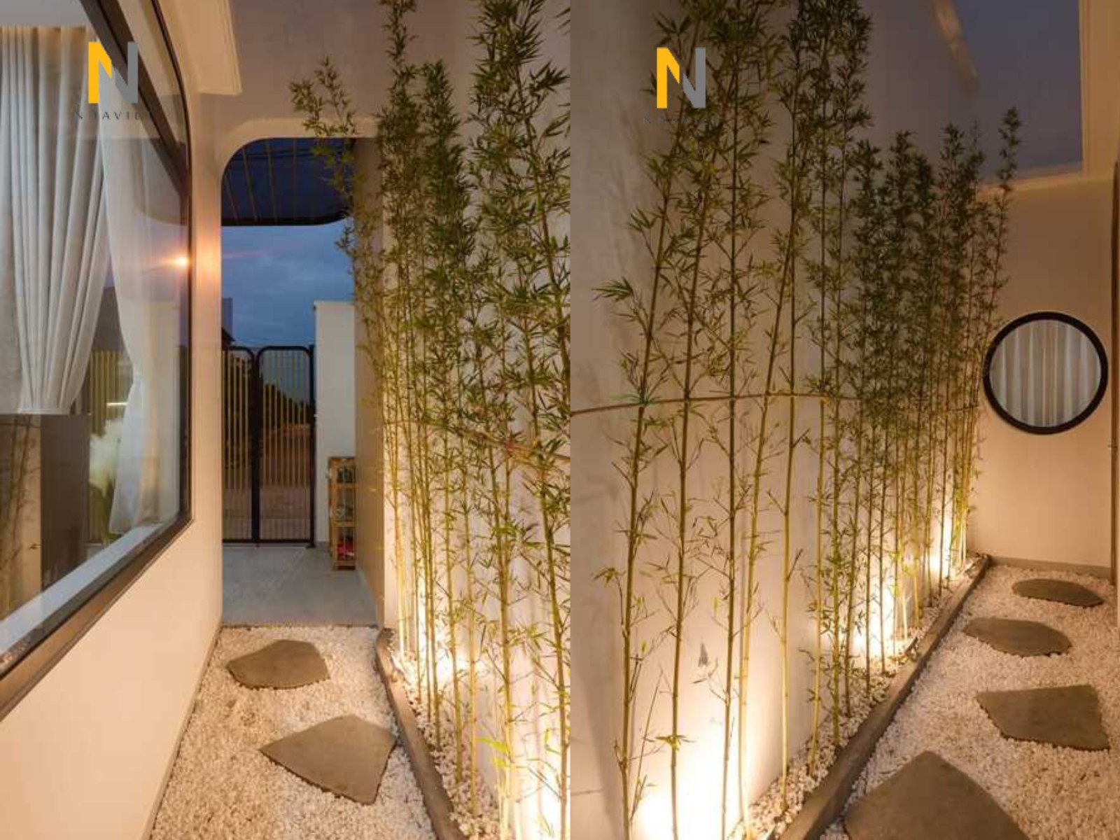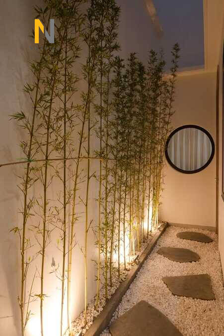 Dù diện tích hạn chế, công trình vẫn tạo được những “khoảng thở” đắt giá nhờ cách tổ chức giếng trời và sân hông nhỏ, giúp lấy sáng, thông gió tự nhiên. Mảng xanh được bố trí xen kẽ ở các điểm nút không gian như bếp, phòng khách, ban công và sân hông, đóng vai trò cải thiện vi khí hậu và mang lại cảm giác thư giãn.