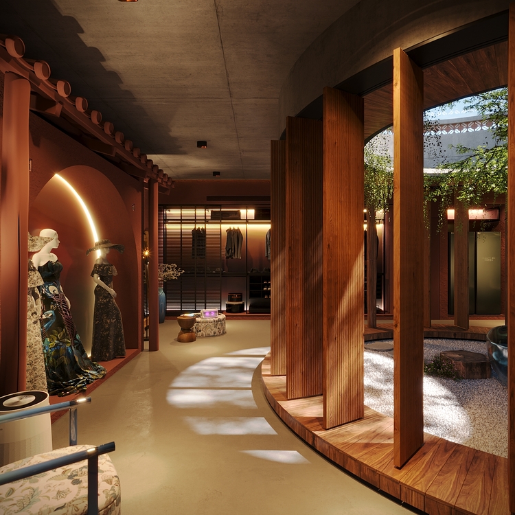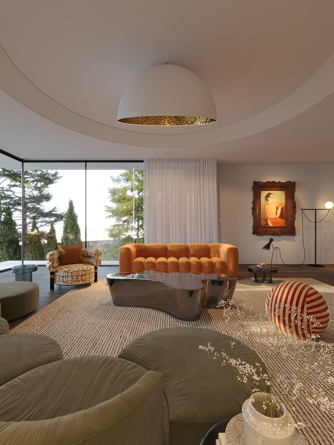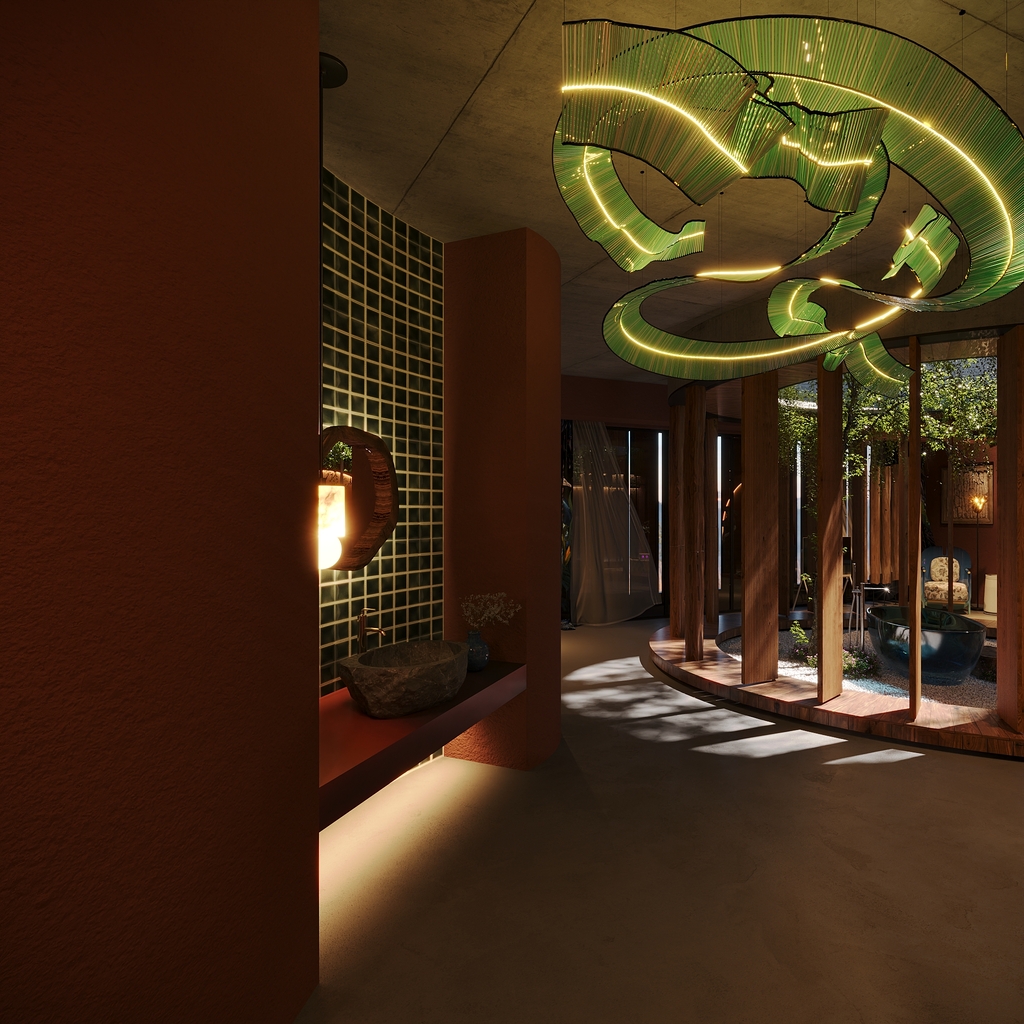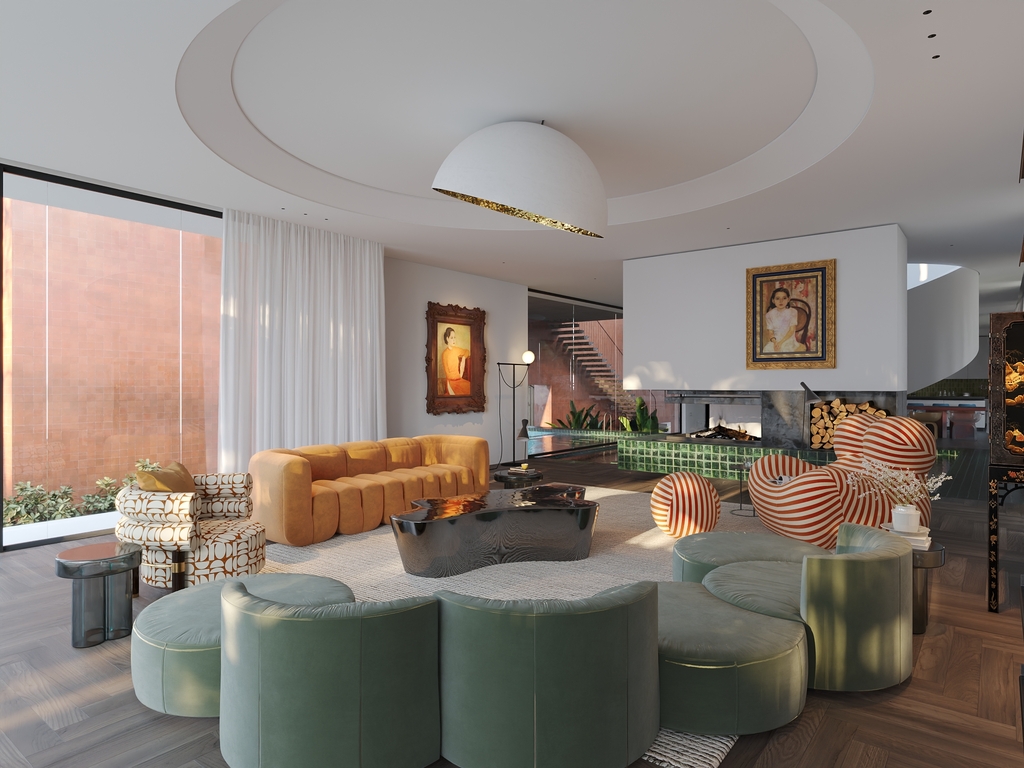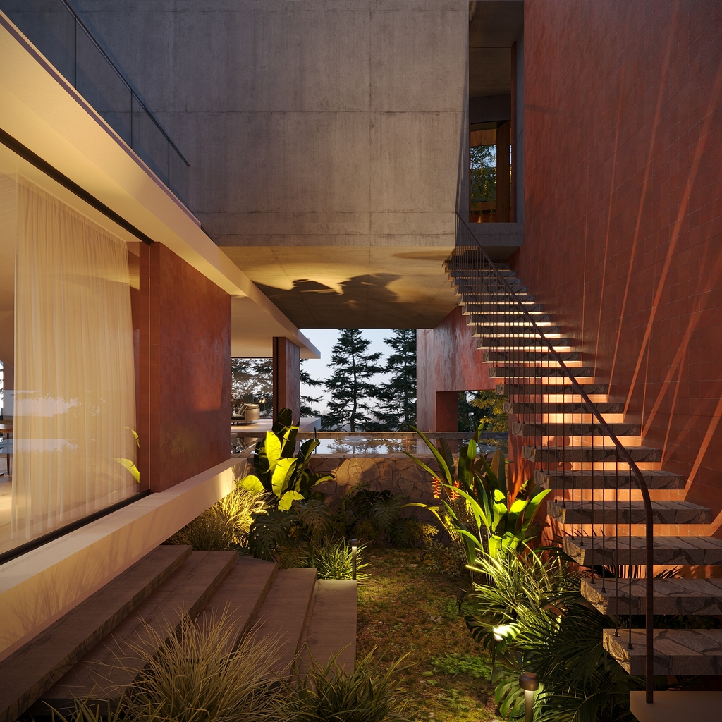 Không gian nội thất được thiết kế theo hướng ấm cúng và gần gũi, kết hợp giữa tông màu đất nung, gỗ tự nhiên và bê tông thô. Cấu trúc không gian mở cùng những đường cong mềm mại giúp tăng cảm giác thư giãn. Ánh sáng tự nhiên, cây xanh và hệ thống chiếu sáng nhân tạo được bố trí tinh tế, tạo nên một không gian sống sang trọng, hài hòa và giàu cảm xúc. Tổng thể Villa NoName là minh chứng cho một tư duy kiến trúc nương theo thiên nhiên, nơi công trình trở thành một phần của cảnh quan, mang lại giá trị thẩm mỹ và bền vững lâu dài.