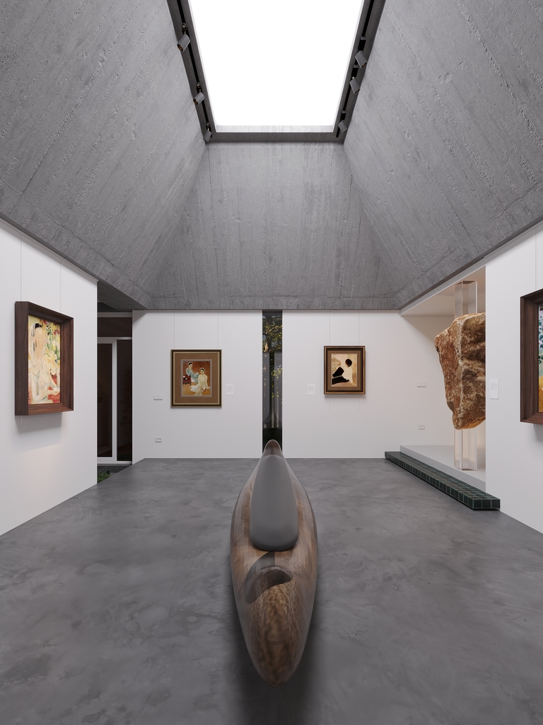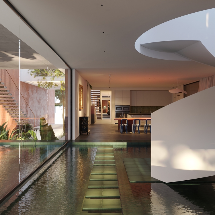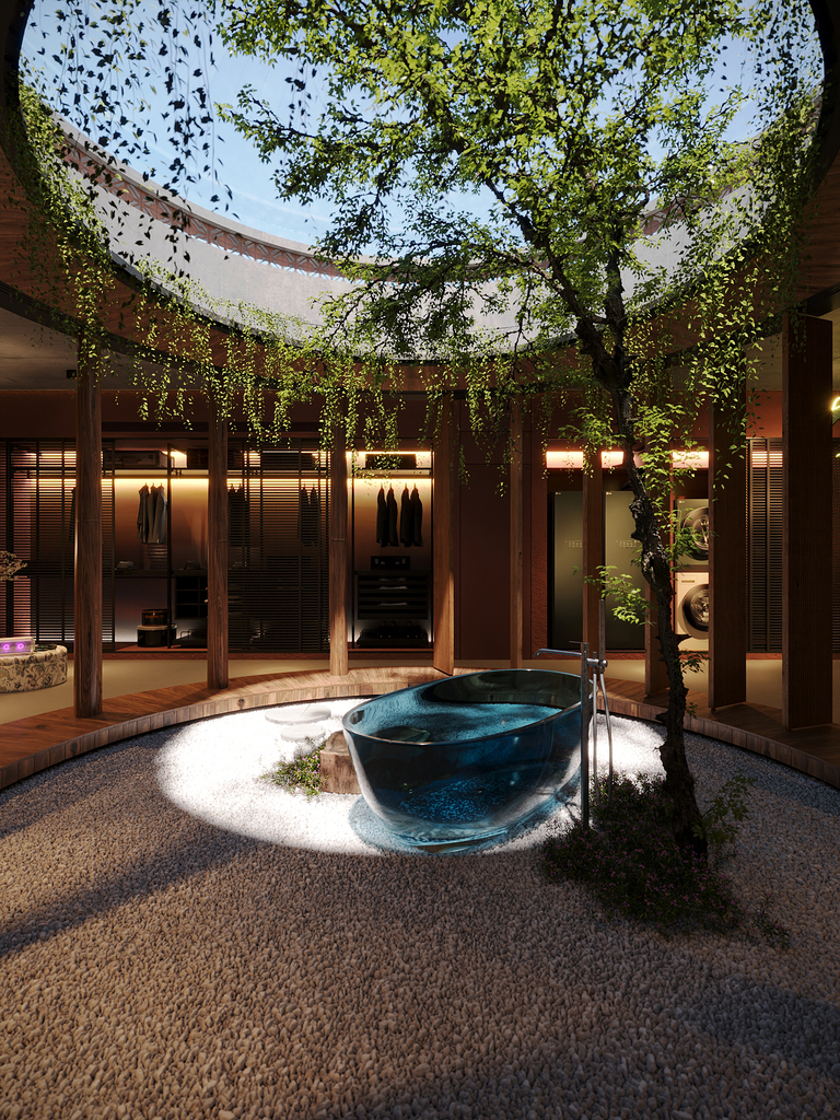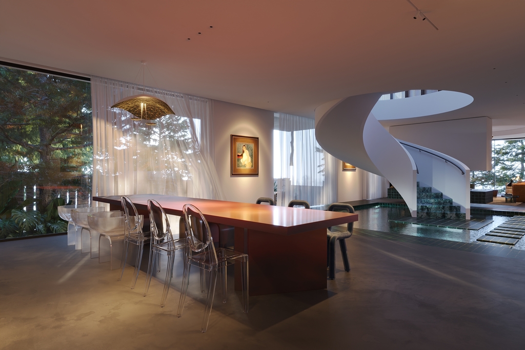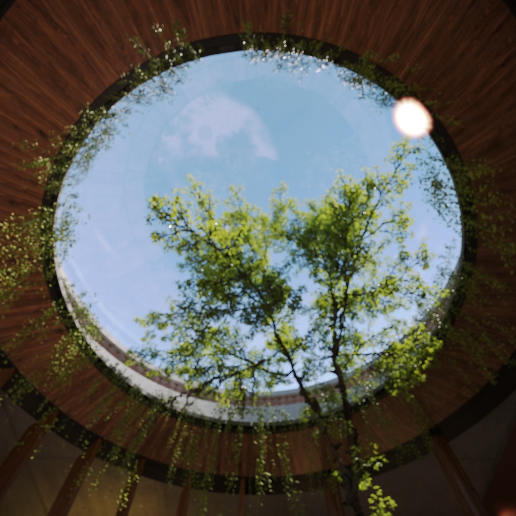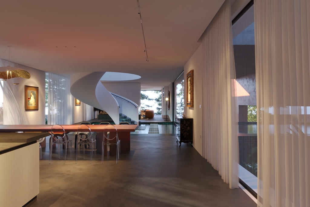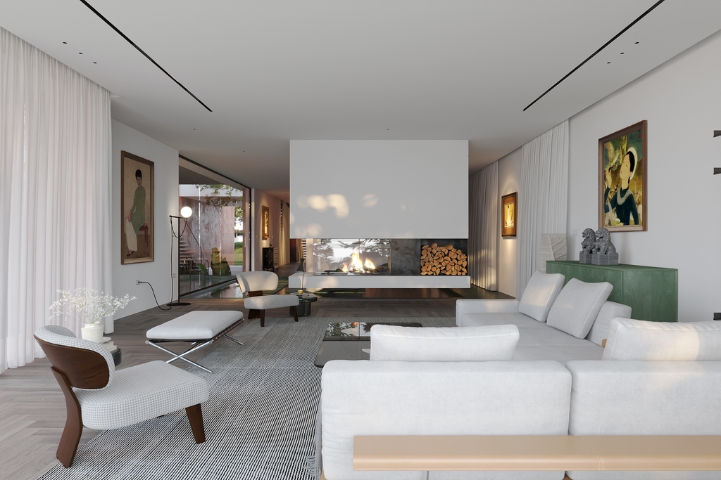 Trọng tâm của dự án không đơn thuần là việc tạo ra một ngôi nhà, mà là kiến tạo một không gian sống gắn bó chặt chẽ với thiên nhiên. Các không gian sinh hoạt được mở rộng tầm nhìn ra hồ và cảnh quan xung quanh, mang lại cảm giác thư thái, yên bình và “ngâm mình” trong thiên nhiên. Giếng trời hình tròn đóng vai trò như một điểm kết nối trực tiếp giữa không gian nội thất và bầu trời, giúp tăng cường ánh sáng tự nhiên, thông gió và tạo nên sự cân bằng giữa kiến trúc và môi trường.