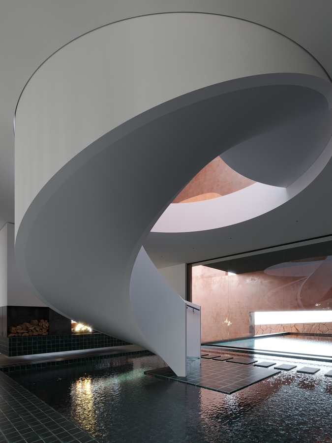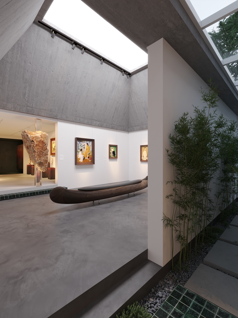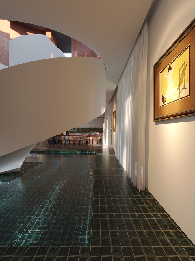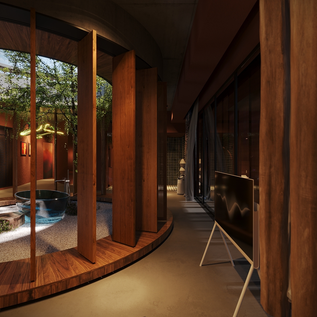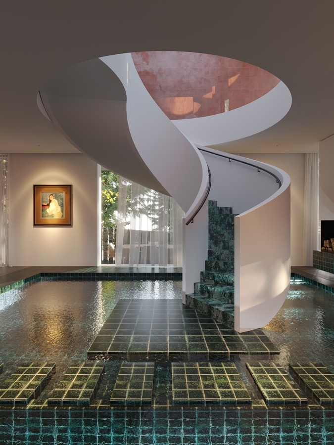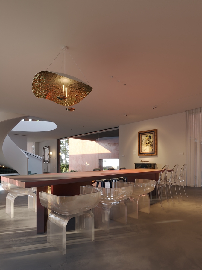 Trọng tâm của dự án không đơn thuần là việc tạo ra một ngôi nhà, mà là kiến tạo một không gian sống gắn bó chặt chẽ với thiên nhiên. Các không gian sinh hoạt được mở rộng tầm nhìn ra hồ và cảnh quan xung quanh, mang lại cảm giác thư thái, yên bình và “ngâm mình” trong thiên nhiên. Giếng trời hình tròn đóng vai trò như một điểm kết nối trực tiếp giữa không gian nội thất và bầu trời, giúp tăng cường ánh sáng tự nhiên, thông gió và tạo nên sự cân bằng giữa kiến trúc và môi trường.