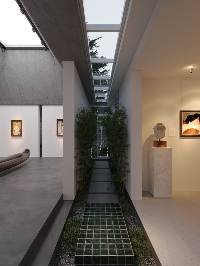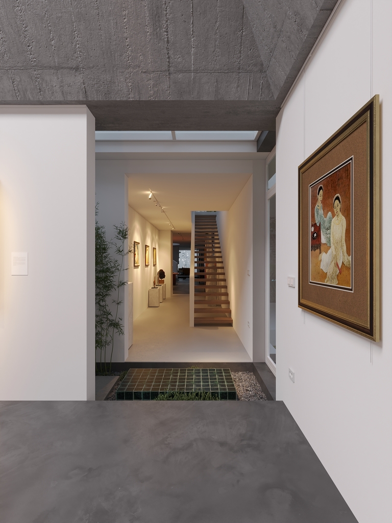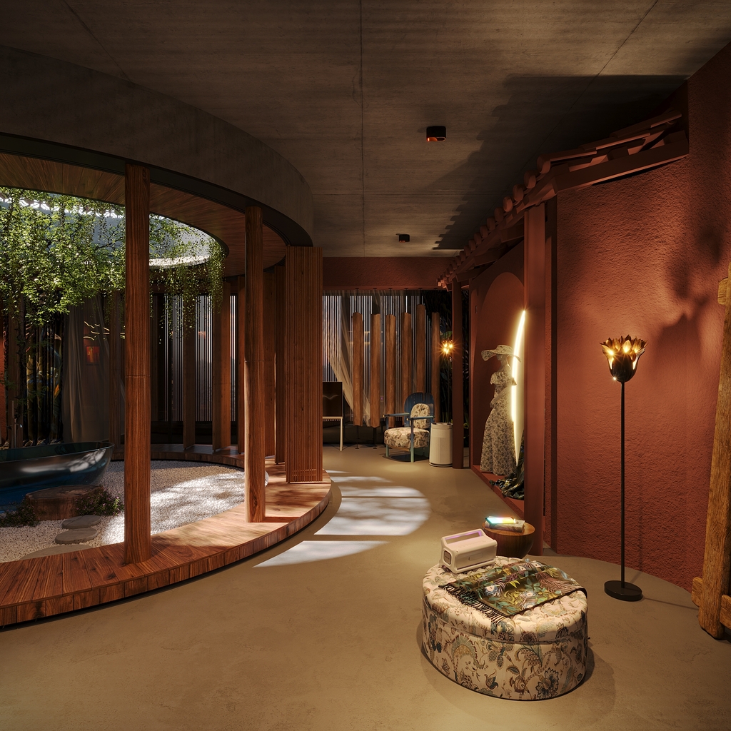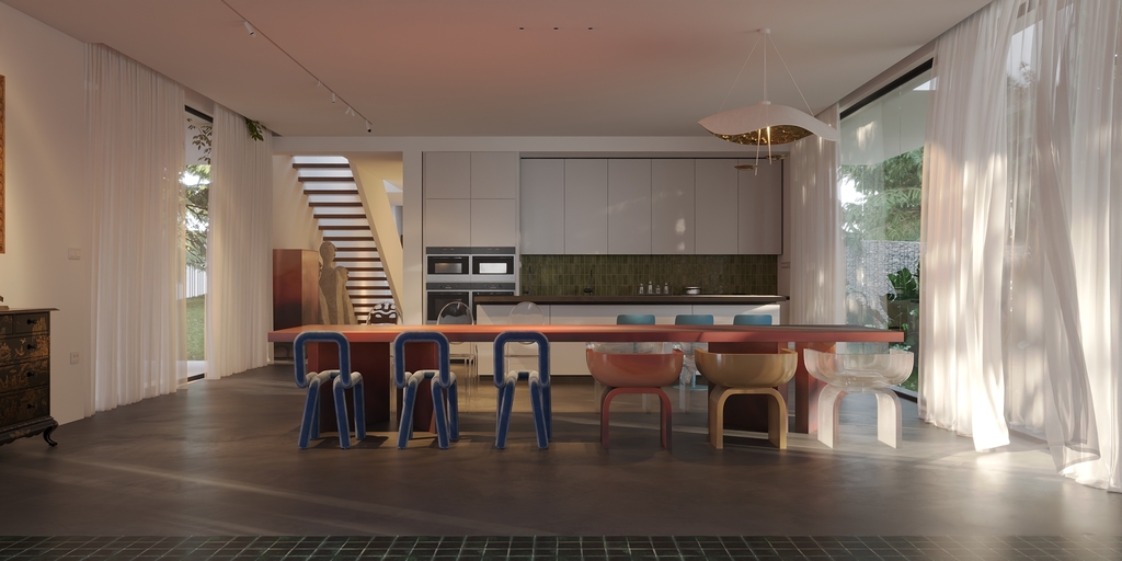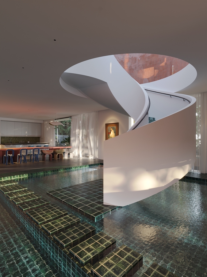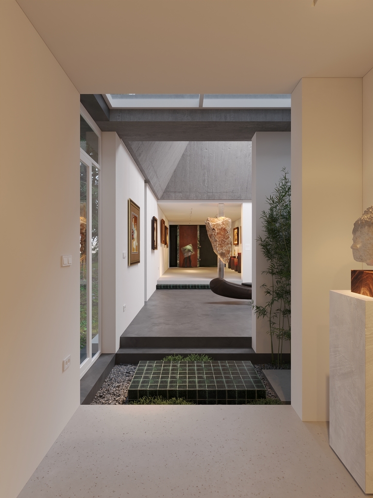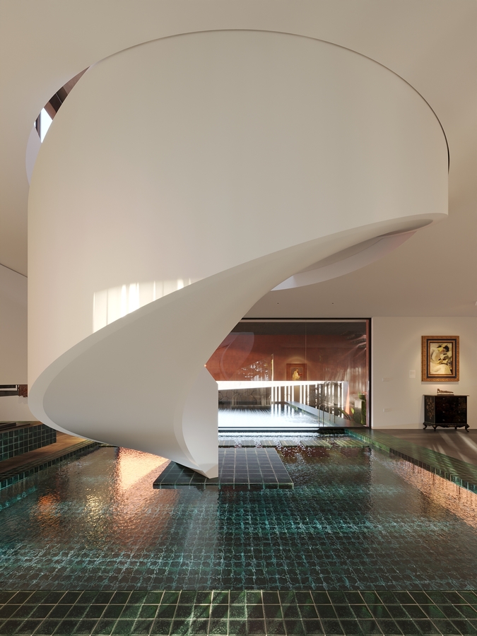 Trọng tâm của dự án không đơn thuần là việc tạo ra một ngôi nhà, mà là kiến tạo một không gian sống gắn bó chặt chẽ với thiên nhiên. Các không gian sinh hoạt được mở rộng tầm nhìn ra hồ và cảnh quan xung quanh, mang lại cảm giác thư thái, yên bình và “ngâm mình” trong thiên nhiên. Giếng trời hình tròn đóng vai trò như một điểm kết nối trực tiếp giữa không gian nội thất và bầu trời, giúp tăng cường ánh sáng tự nhiên, thông gió và tạo nên sự cân bằng giữa kiến trúc và môi trường.