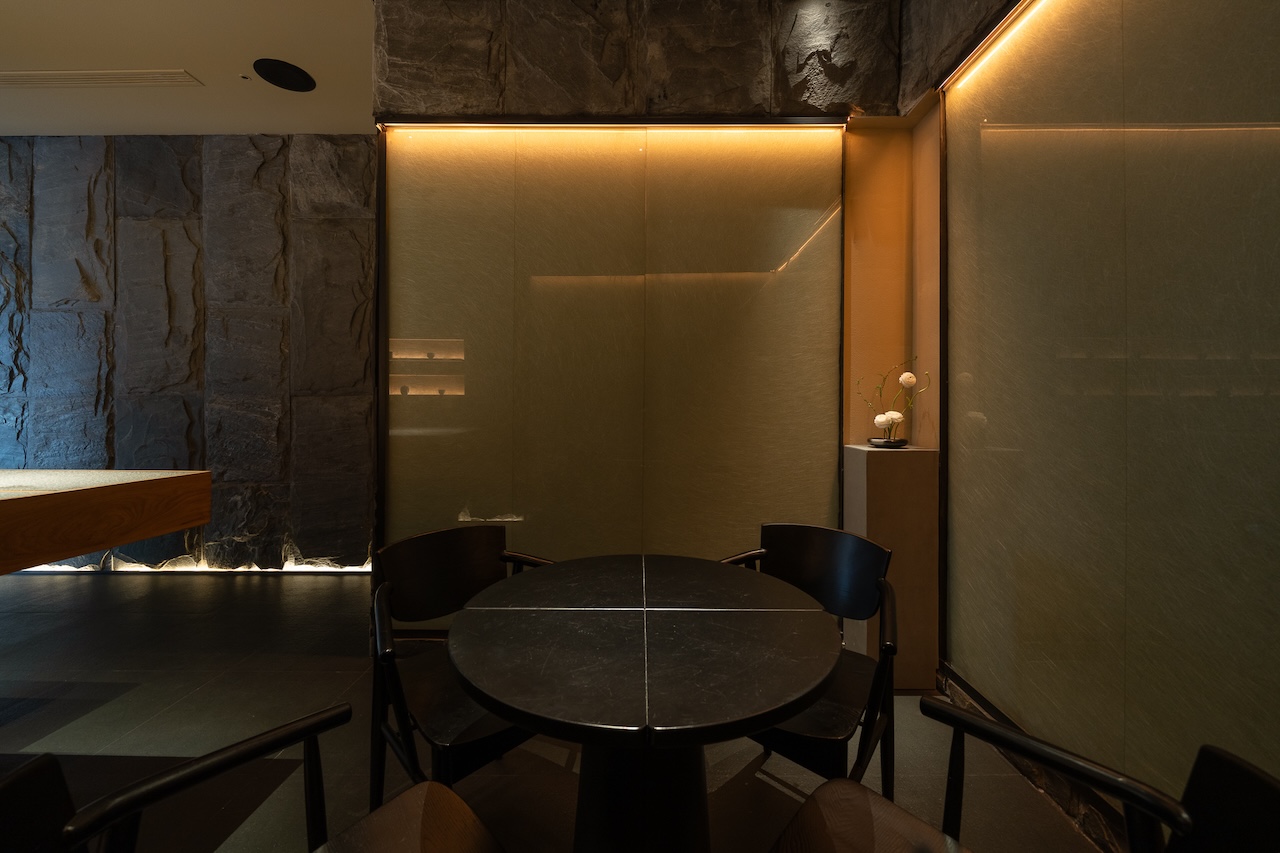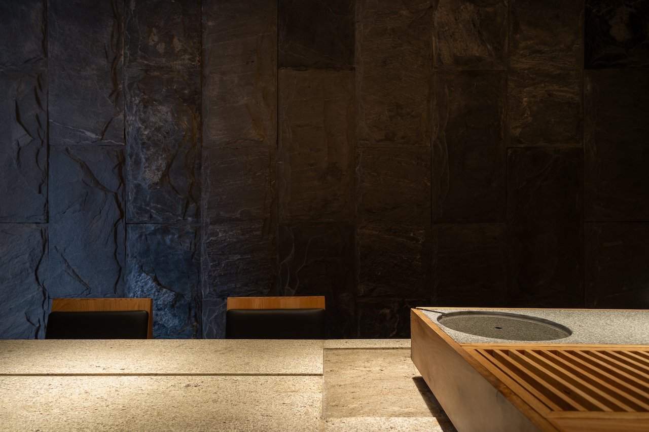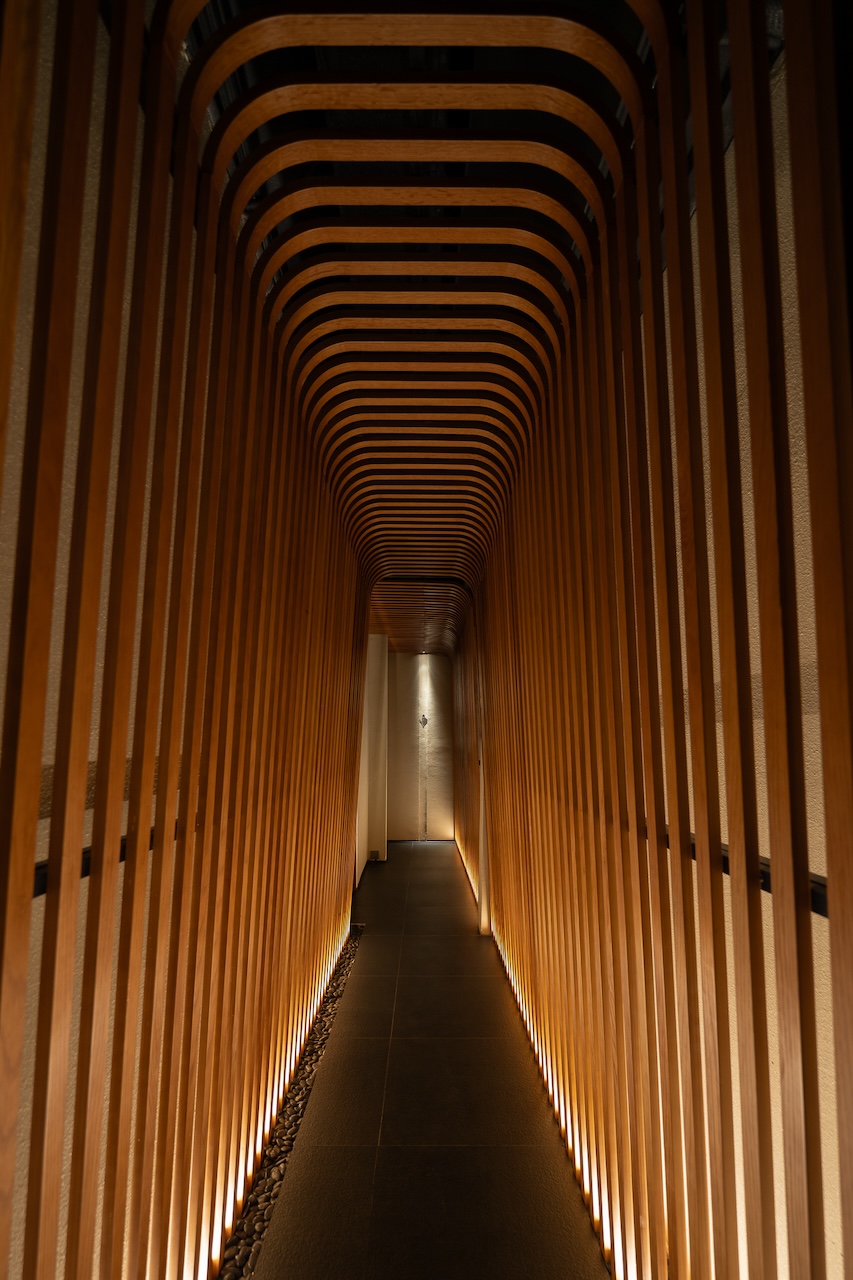 Không gian Omakase tầng 02 ẩn sau những hallway nhỏ với ánh sáng dịu nhẹ, tương phản với những mảng tối. Khu vực quầy chính được focus với tất cả những nguồn sáng gián tiếp và trực tiếp, đóng vai trò là “sân khấu chính” nơi buổi thưởng thức được diễn ra. Bao trùm không gian xung quanh là những mảng bức rèm nước chuyển động liên tục, tái tạo âm thanh và cảm giác của những cơn mưa tuôn bên hiên nhà Engawa.