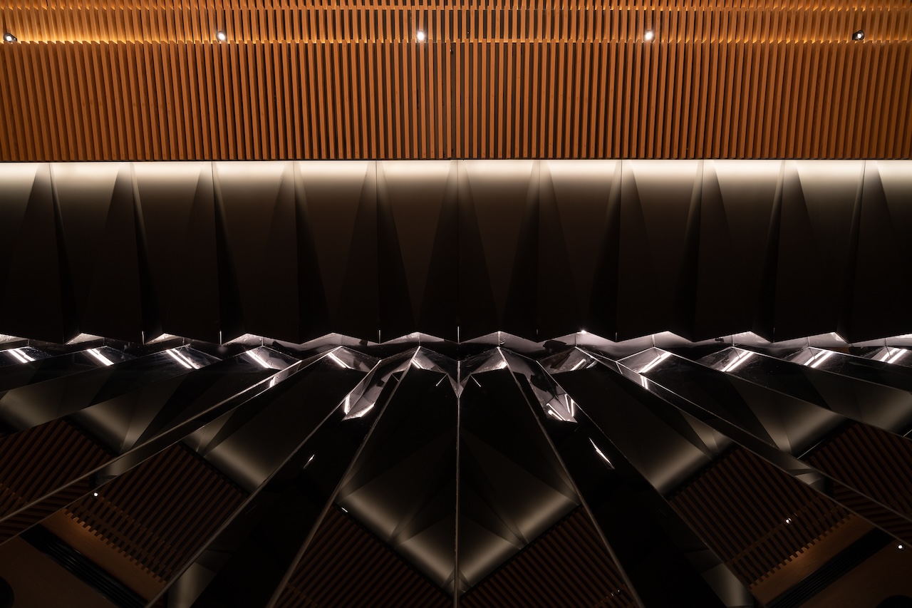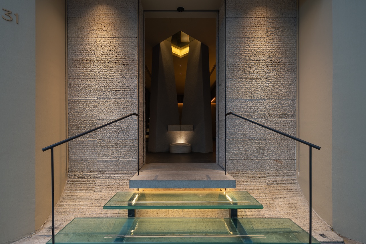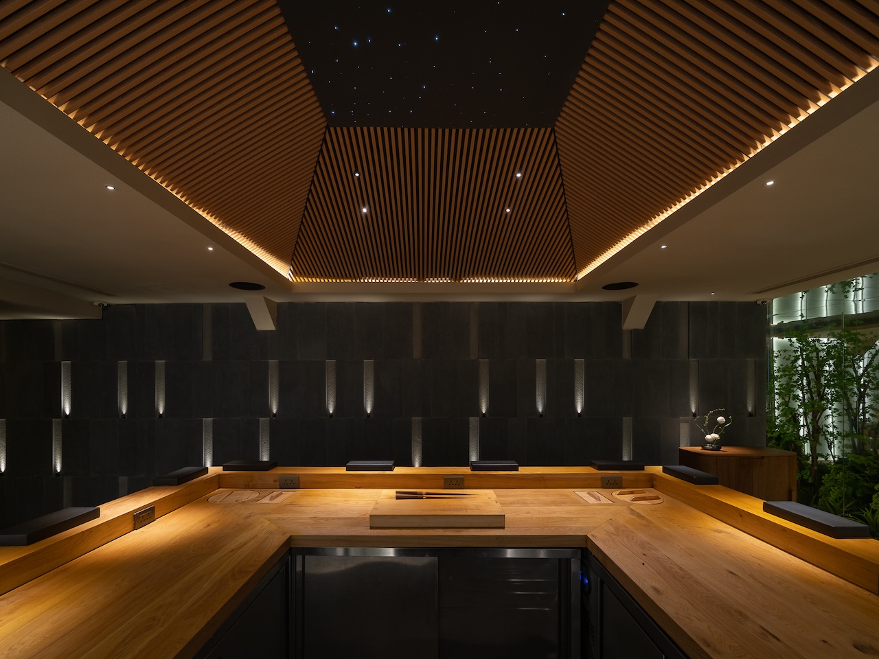 Không gian Omakase tầng 02 ẩn sau những hallway nhỏ với ánh sáng dịu nhẹ, tương phản với những mảng tối. Khu vực quầy chính được focus với tất cả những nguồn sáng gián tiếp và trực tiếp, đóng vai trò là “sân khấu chính” nơi buổi thưởng thức được diễn ra. Bao trùm không gian xung quanh là những mảng bức rèm nước chuyển động liên tục, tái tạo âm thanh và cảm giác của những cơn mưa tuôn bên hiên nhà Engawa.