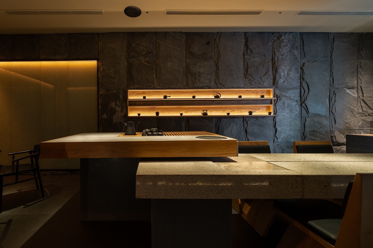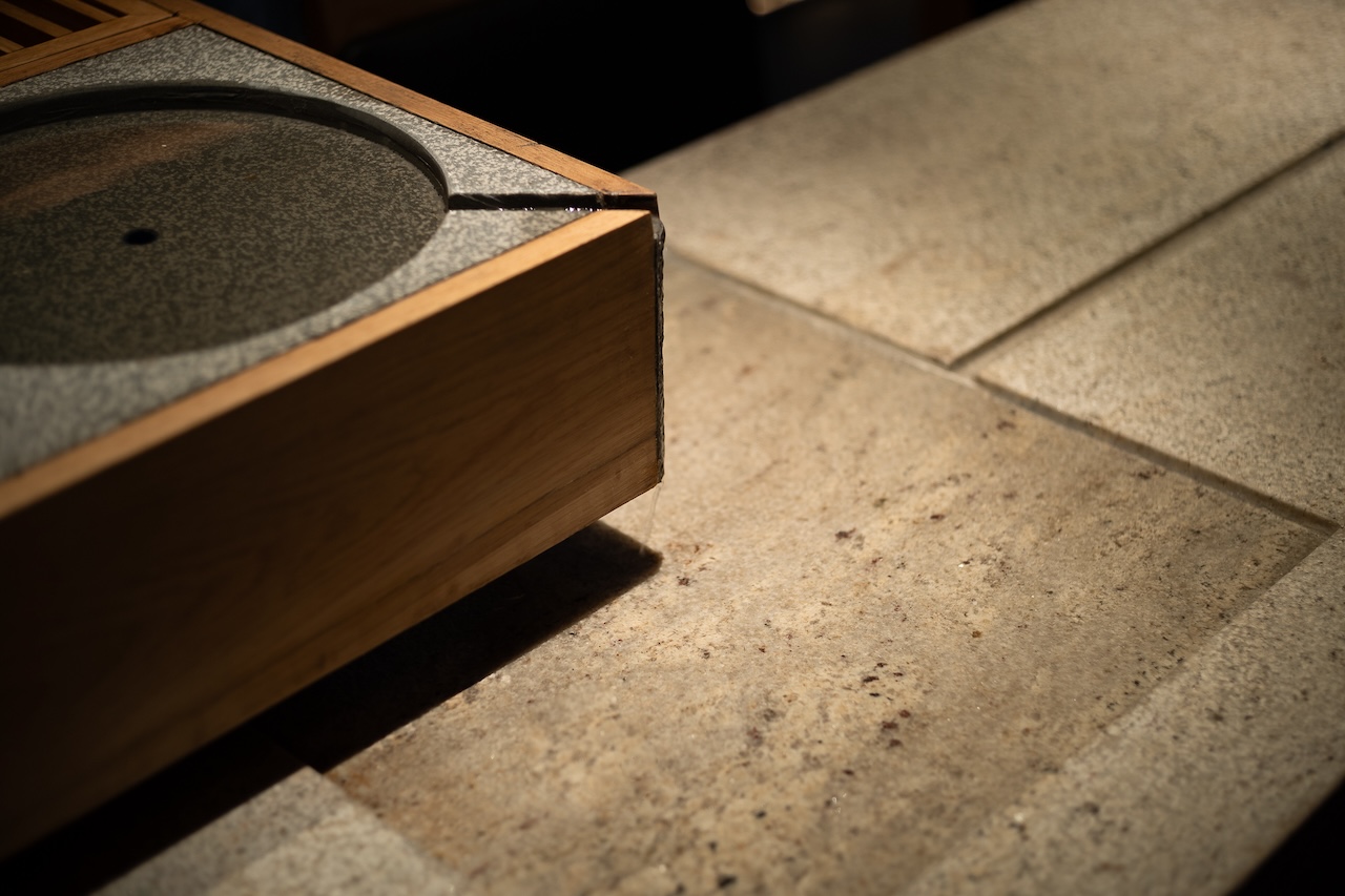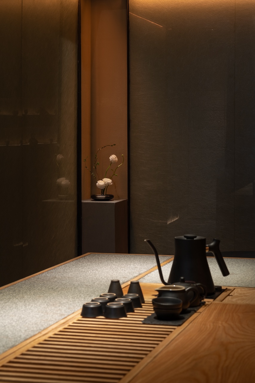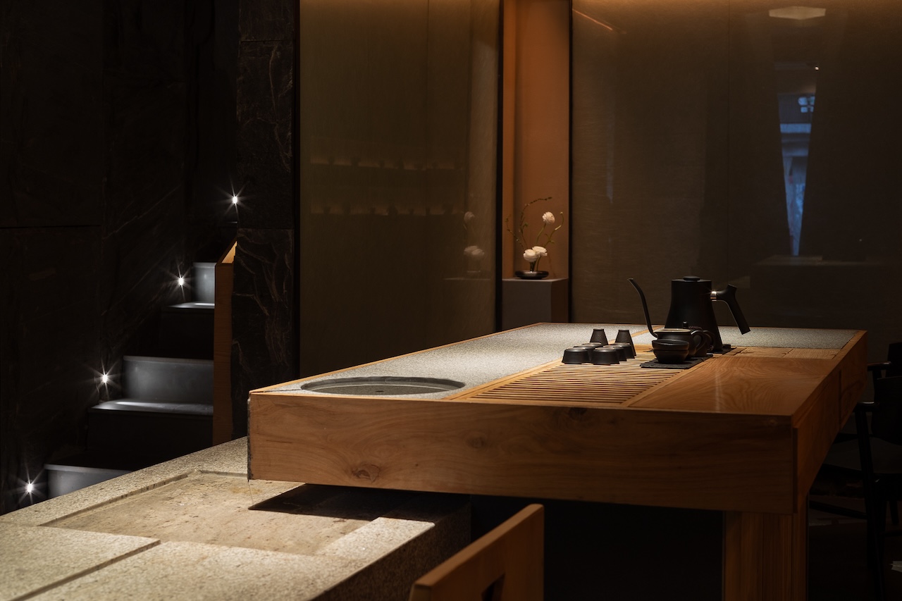 Không gian tầng trệt dành cho Tea Lounge và trải nghiệm mà chúng tôi muốn mang lại là những nghi thức đầu tiên của một buổi trà đạo. Bước trên “con suối” gợi lại hình tượng dòng nước chảy ra từ khe đá vào chiếc giếng Tsukubai. Tiếng nước chảy và ánh sáng được dim tối nhẹ cùng mùi hương dễ chịu sẽ giúp calming người thực khách để chuẩn bị cho những trải nghiệm tiếp theo.