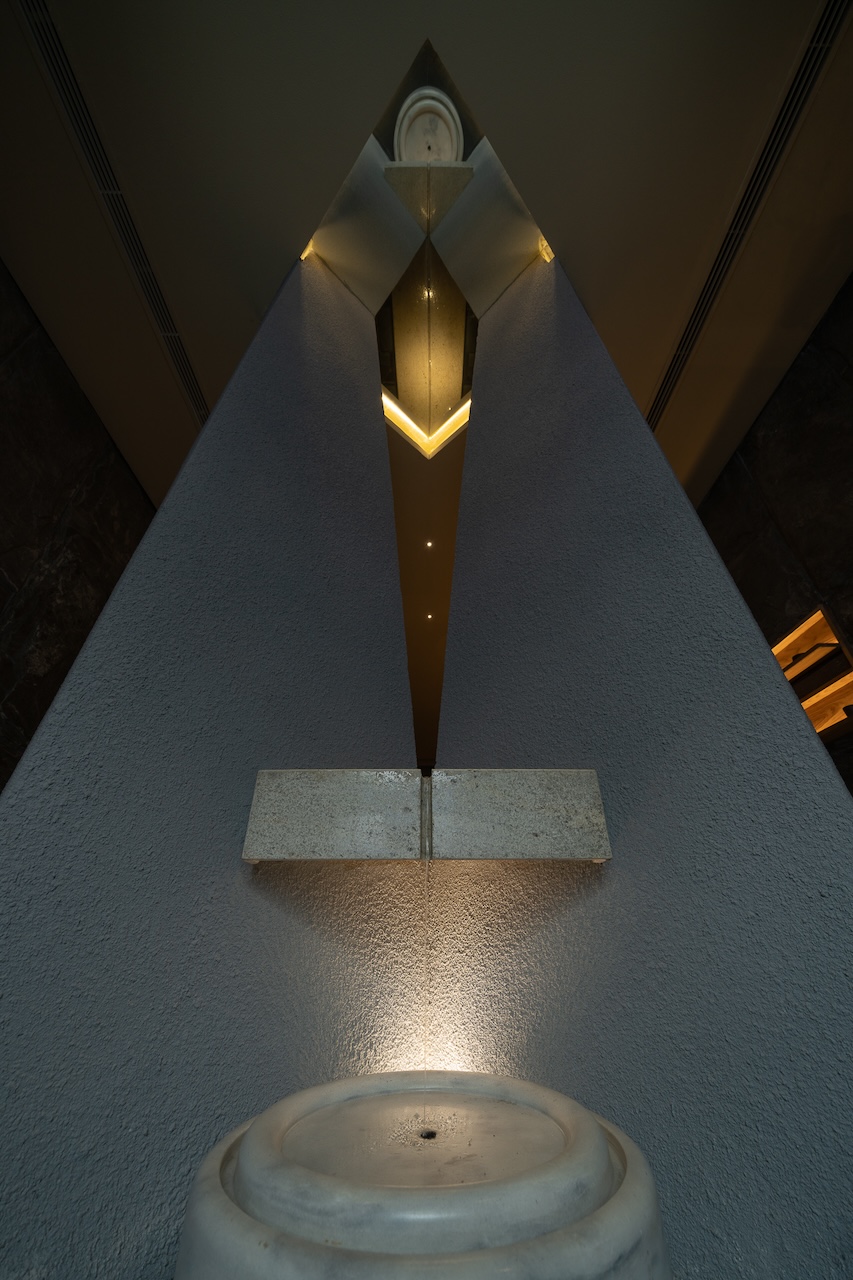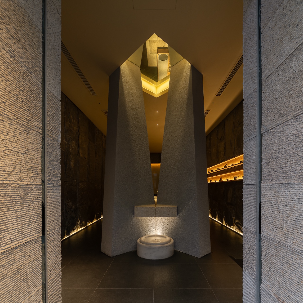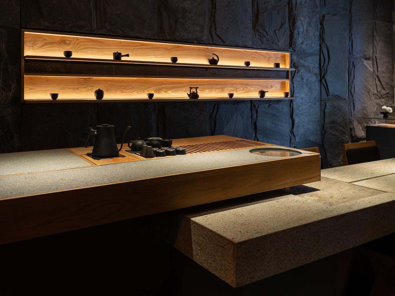 Không gian tầng trệt dành cho Tea Lounge và trải nghiệm mà chúng tôi muốn mang lại là những nghi thức đầu tiên của một buổi trà đạo. Bước trên “con suối” gợi lại hình tượng dòng nước chảy ra từ khe đá vào chiếc giếng Tsukubai. Tiếng nước chảy và ánh sáng được dim tối nhẹ cùng mùi hương dễ chịu sẽ giúp calming người thực khách để chuẩn bị cho những trải nghiệm tiếp theo.