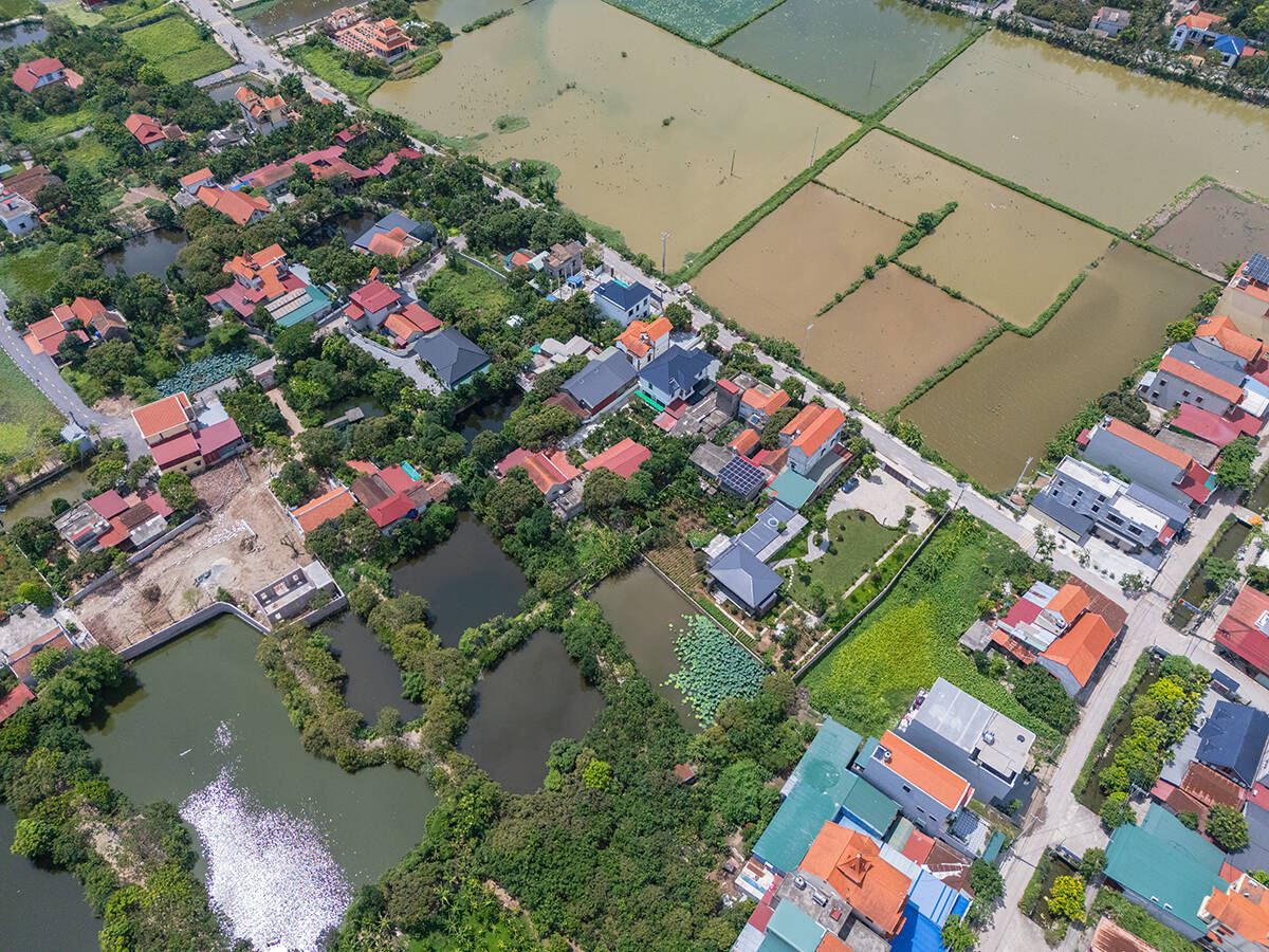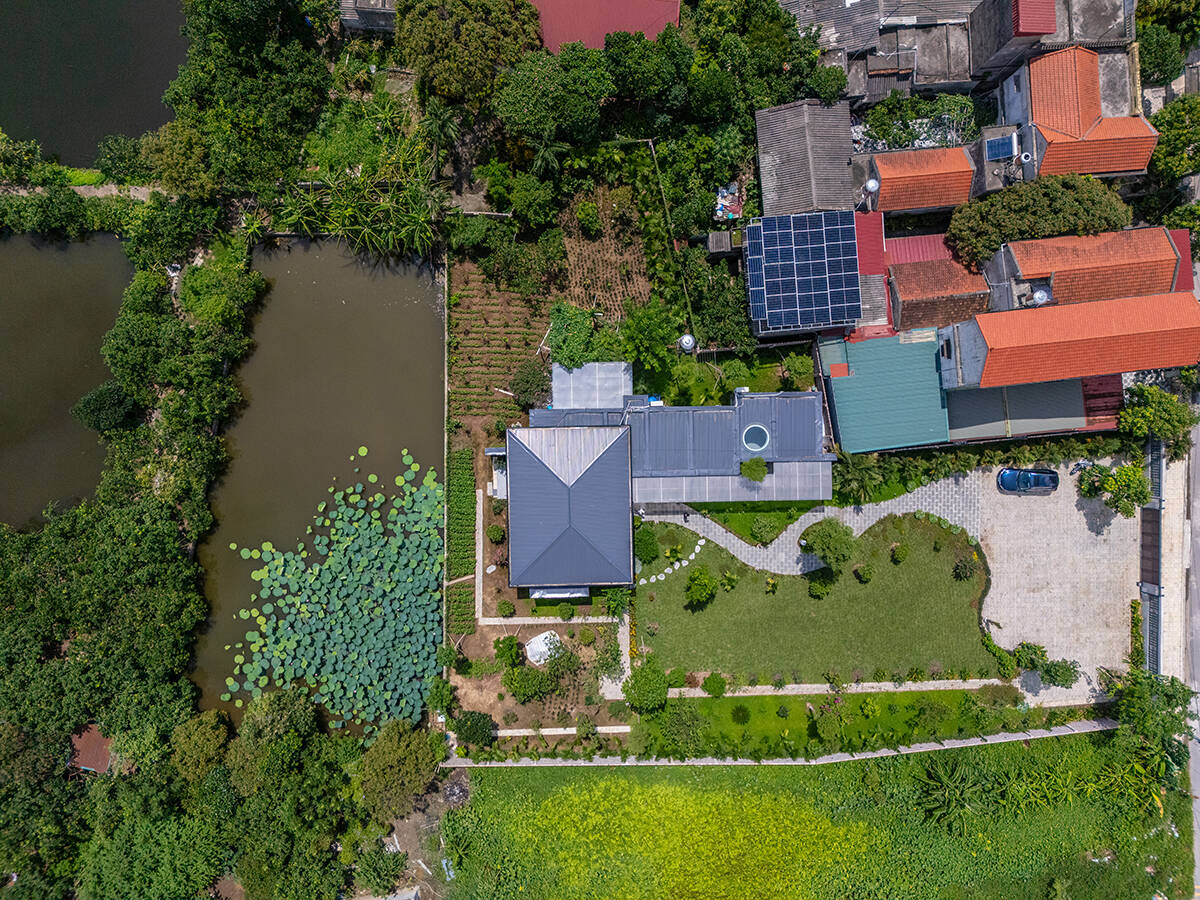 Công trình được hình thành từ nhu cầu tìm về một không gian nghỉ dưỡng yên tĩnh của gia đình trẻ sống tại đô thị. Thay vì tách rời hoàn toàn khỏi bối cảnh xung quanh, ngôi nhà hòa nhập vào đời sống vùng quê Bắc Bộ, nơi cảnh quan tự nhiên: vườn cây, mặt nước, đầm sen trở thành một phần không thể tách rời của tổ chức không gian ở.