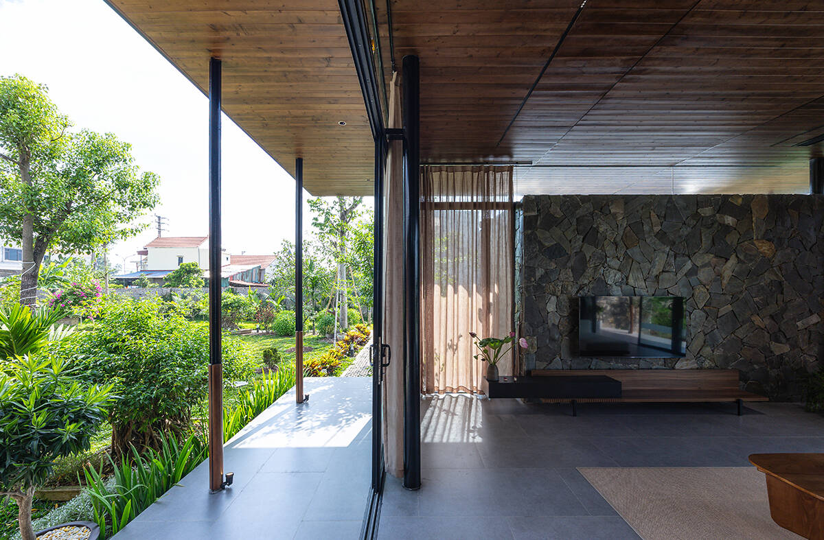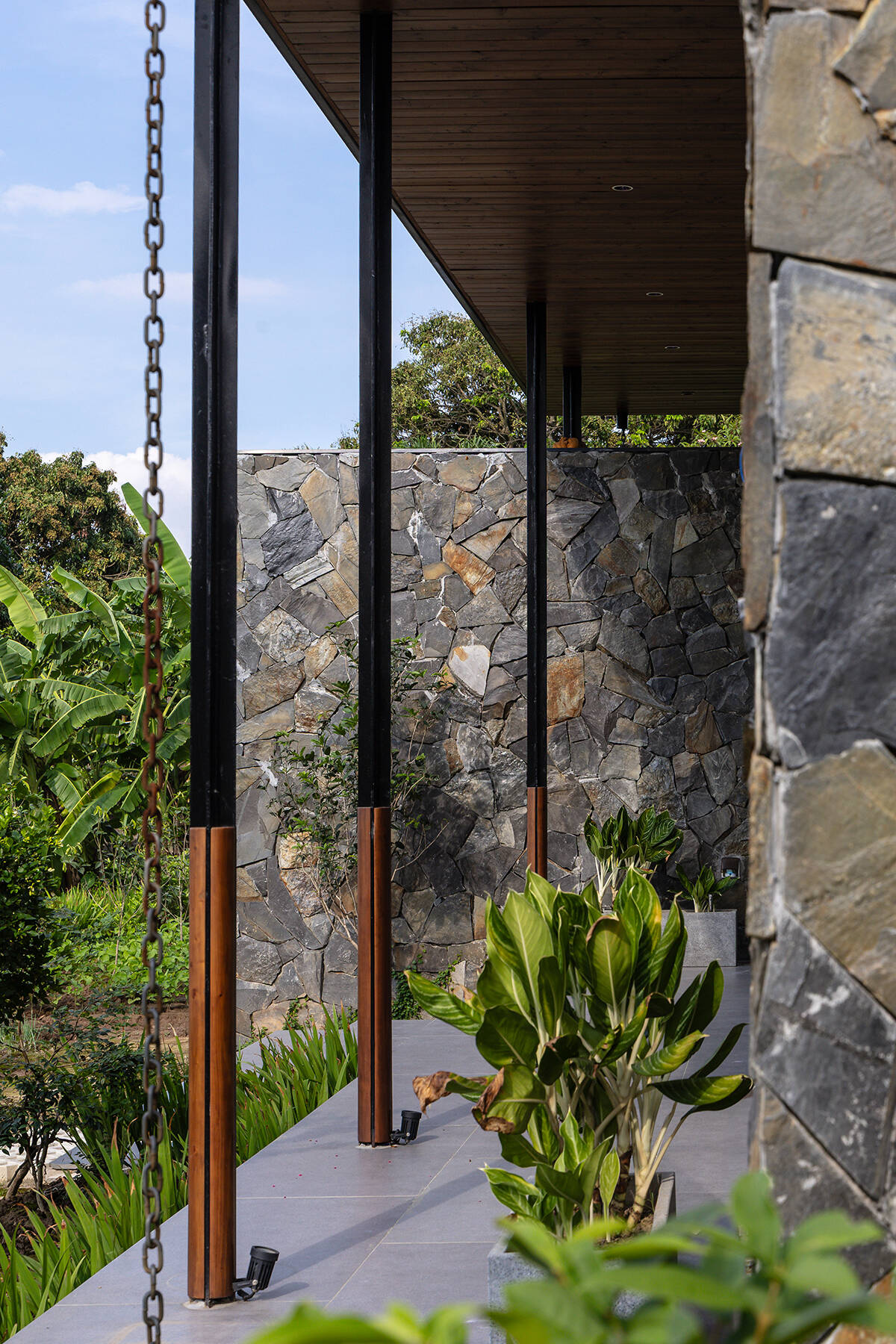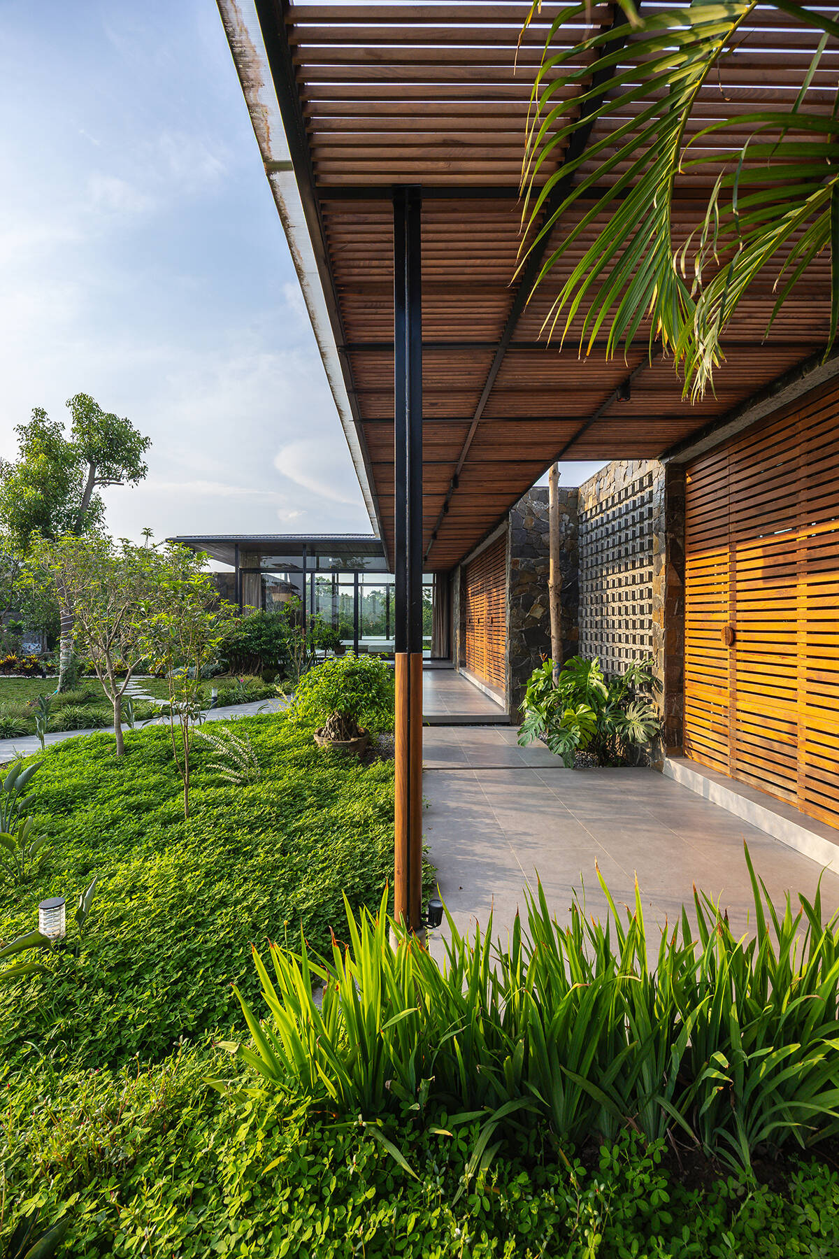 Các lớp không gian đệm được khai thác rõ nét, đặc biệt là hệ mái hiên rộng chạy dọc công trình. Mái hiên vừa là giải pháp che nắng, giảm bức xạ trực tiếp, vừa tạo ra vùng sinh hoạt trung gian giữa trong và ngoài. Tại đây, các hoạt động đời sống như nghỉ ngơi, trò chuyện, hay đơn giản là ngồi quan sát thiên nhiên diễn ra một cách tự nhiên, không bị giới hạn bởi tường bao kín.