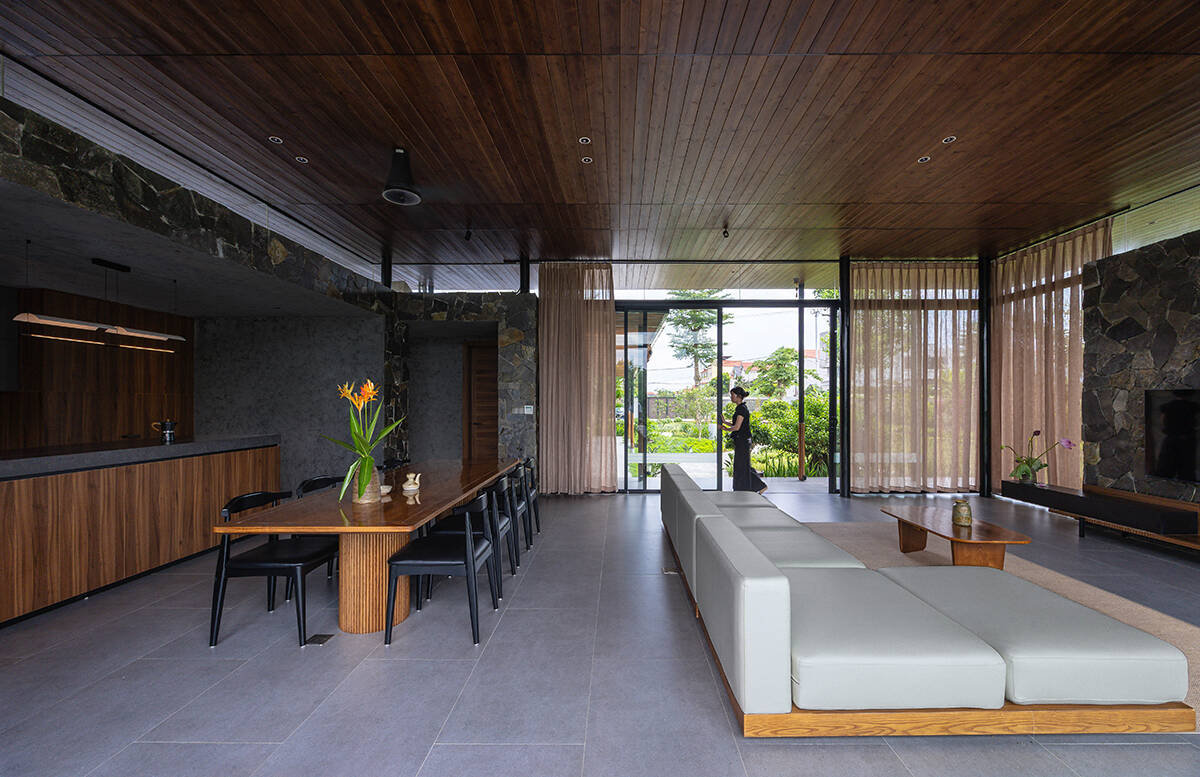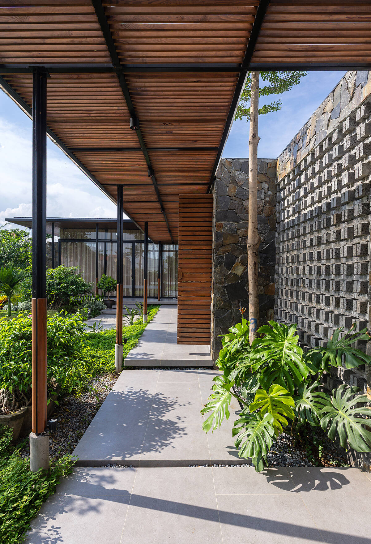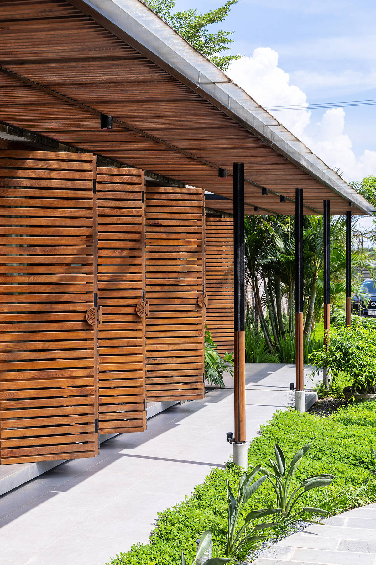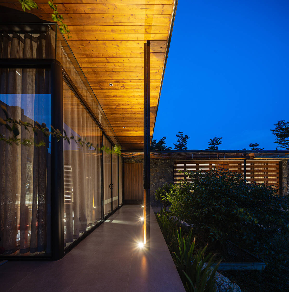 Các lớp không gian đệm được khai thác rõ nét, đặc biệt là hệ mái hiên rộng chạy dọc công trình. Mái hiên vừa là giải pháp che nắng, giảm bức xạ trực tiếp, vừa tạo ra vùng sinh hoạt trung gian giữa trong và ngoài. Tại đây, các hoạt động đời sống như nghỉ ngơi, trò chuyện, hay đơn giản là ngồi quan sát thiên nhiên diễn ra một cách tự nhiên, không bị giới hạn bởi tường bao kín.