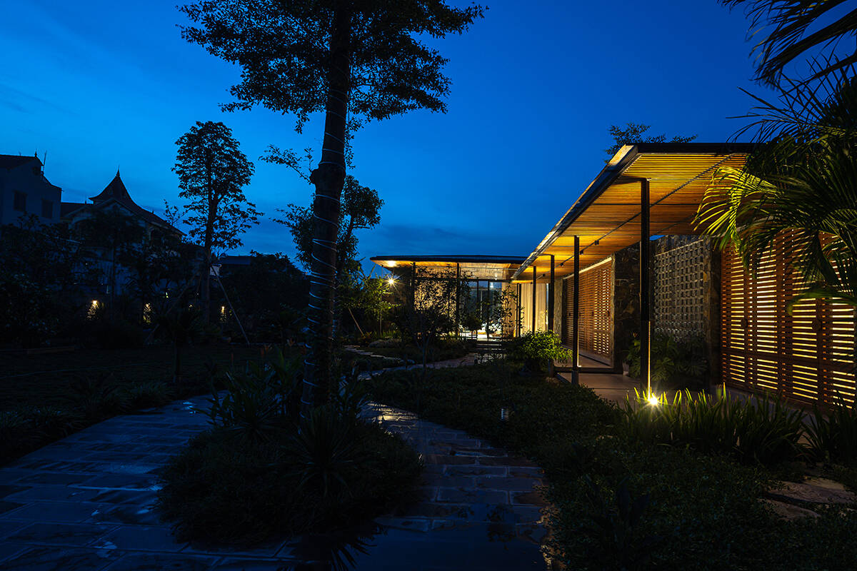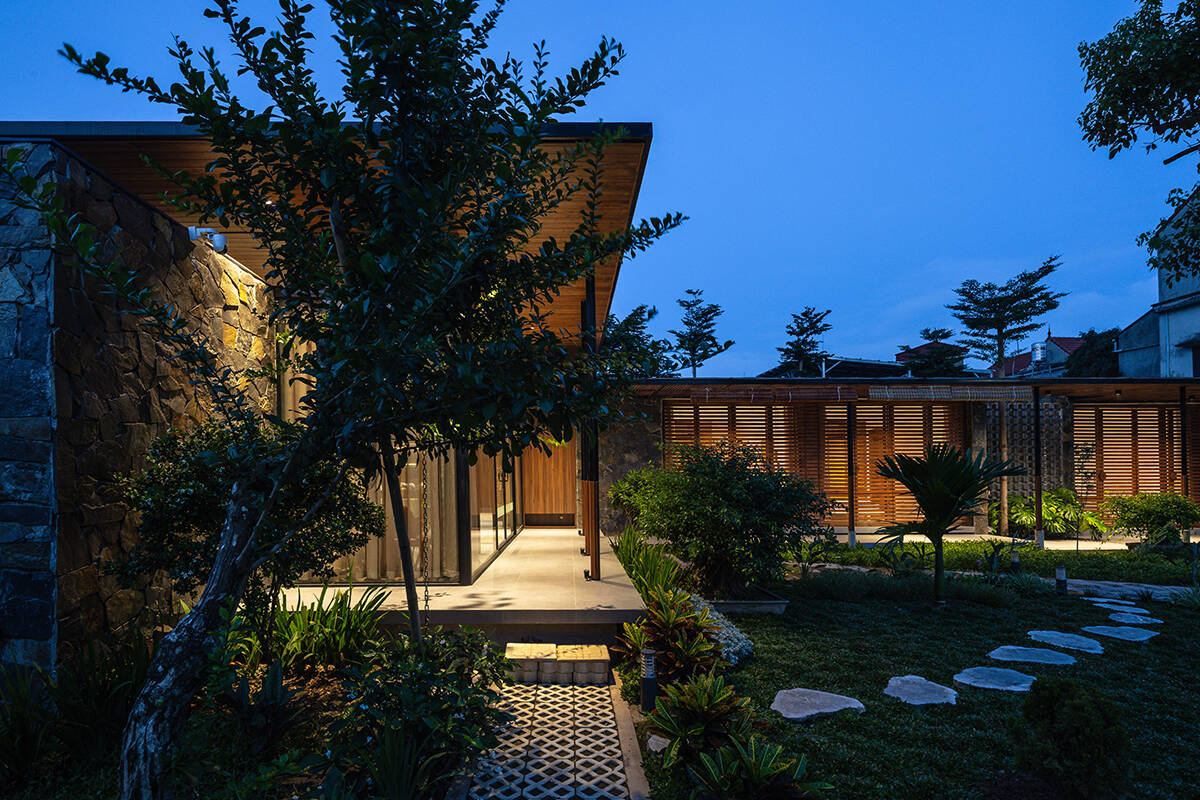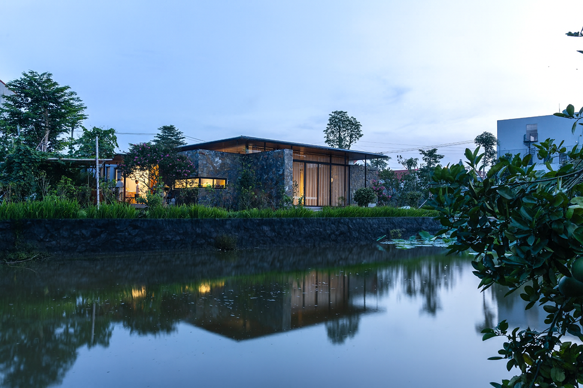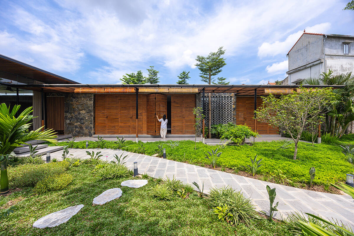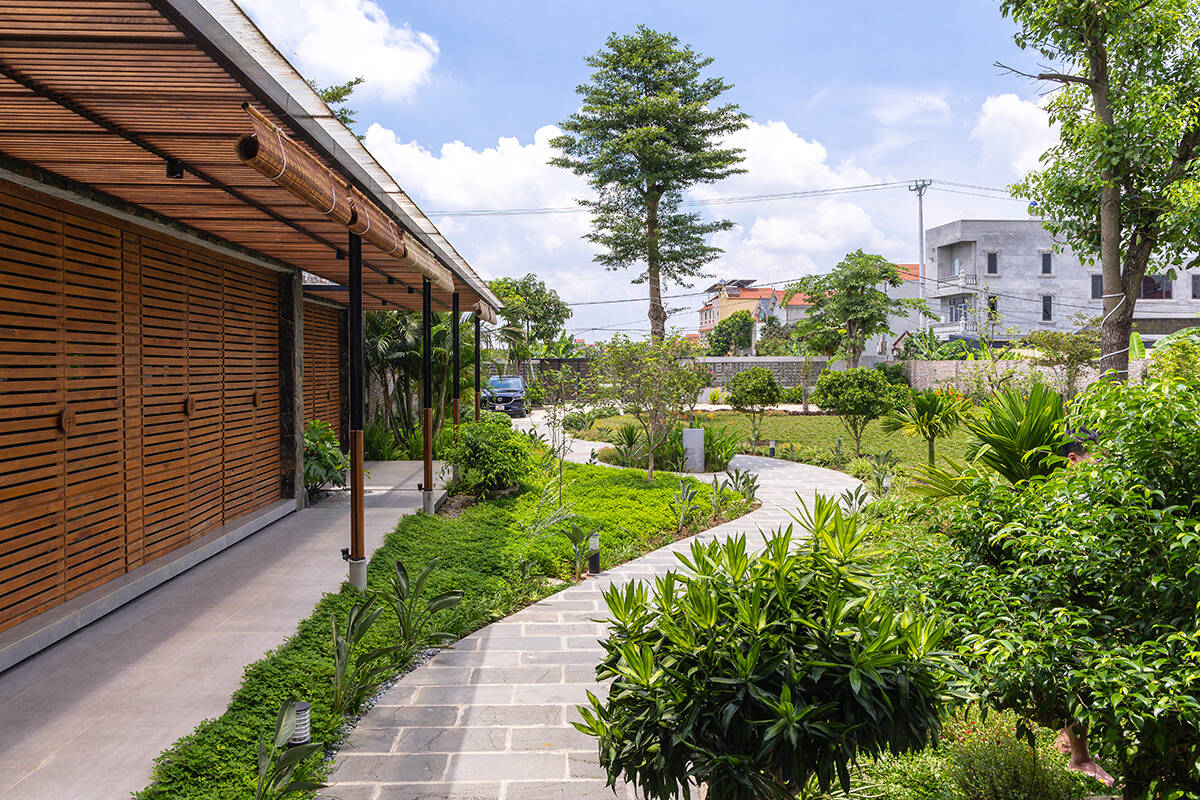 Hệ cây xanh được bố trí liên tục từ sân trước đến vườn sau, kết hợp cùng mặt nước điều tiết vi khí hậu, giảm nhiệt và tăng độ ẩm. Sự hiện diện của đầm sen không chỉ mang ý nghĩa cảnh quan mà còn đóng vai trò như một “khoảng thở” sinh thái, giúp công trình hòa nhịp tốt với môi trường xung quanh.
