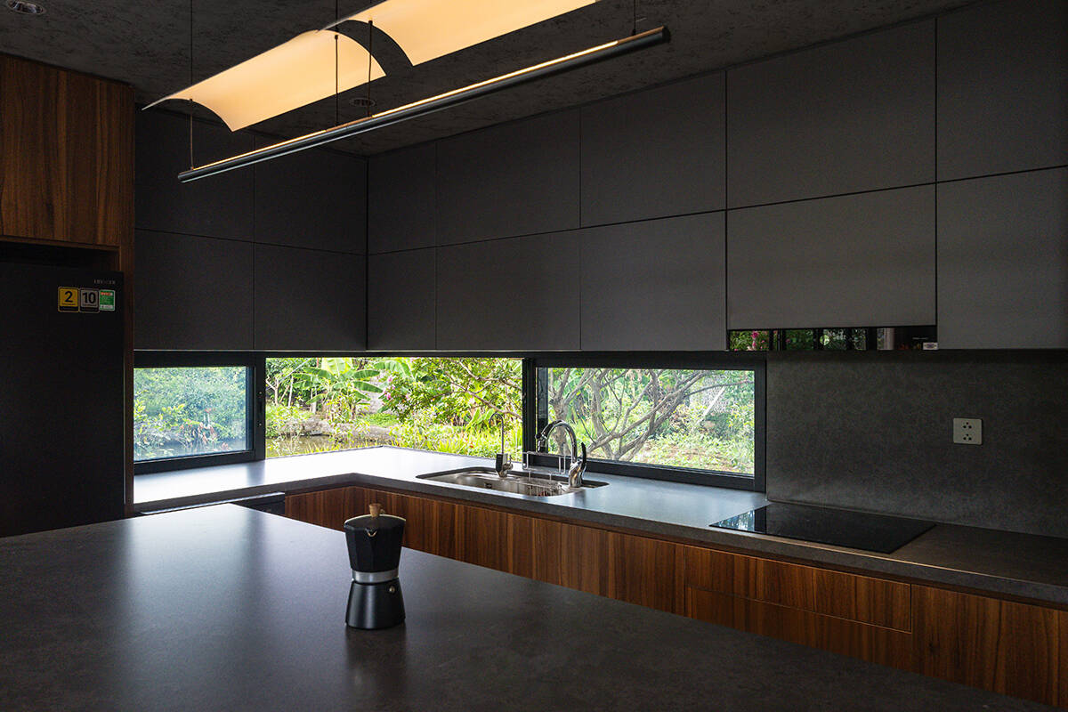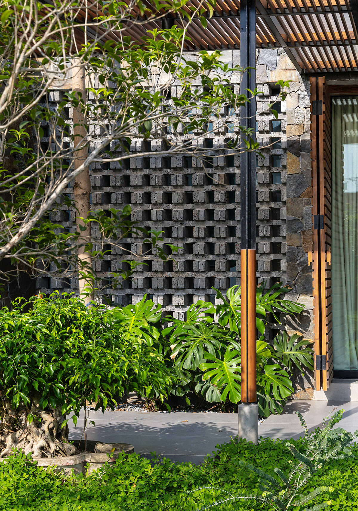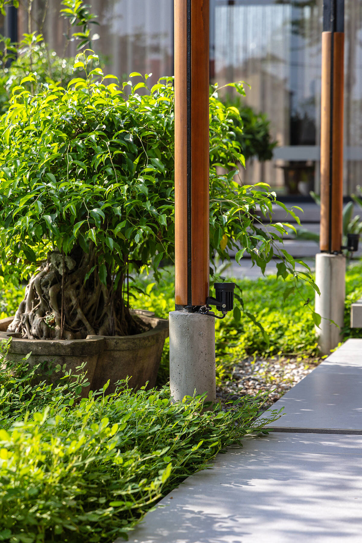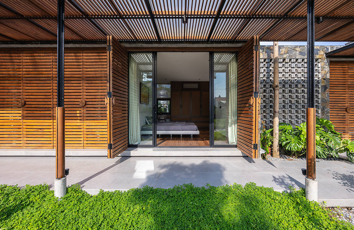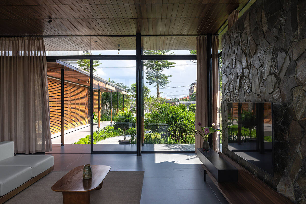 Hệ cây xanh được bố trí liên tục từ sân trước đến vườn sau, kết hợp cùng mặt nước điều tiết vi khí hậu, giảm nhiệt và tăng độ ẩm. Sự hiện diện của đầm sen không chỉ mang ý nghĩa cảnh quan mà còn đóng vai trò như một “khoảng thở” sinh thái, giúp công trình hòa nhịp tốt với môi trường xung quanh.