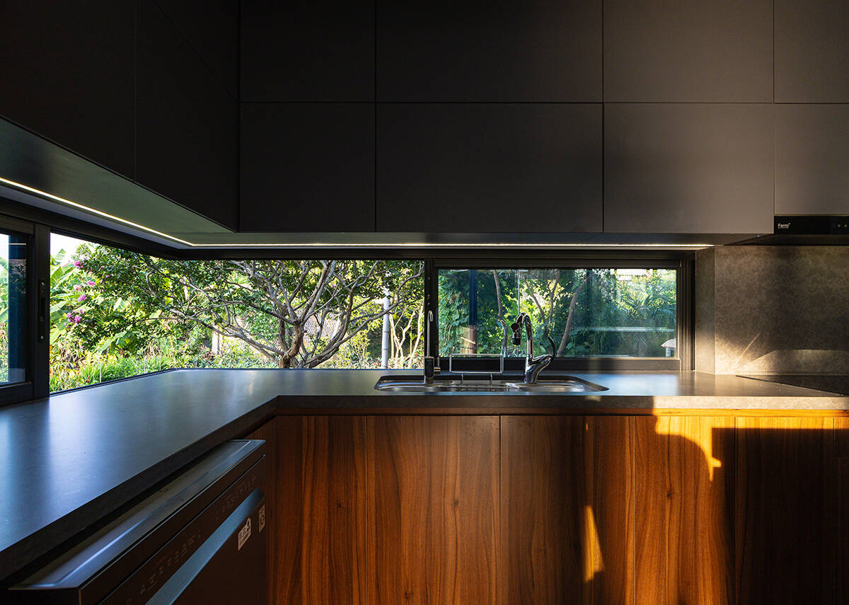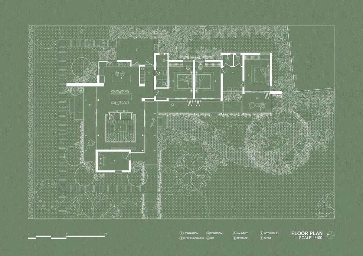 Toàn bộ công năng được bố trí trên một mặt bằng trải dài, với tỷ lệ vừa phải theo vóc dáng người. Cách tổ chức này giúp giảm chiều cao công trình, tăng tính kết nối giữa các không gian sinh hoạt và tạo điều kiện thuận lợi cho việc sử dụng của nhiều thế hệ trong gia đình.