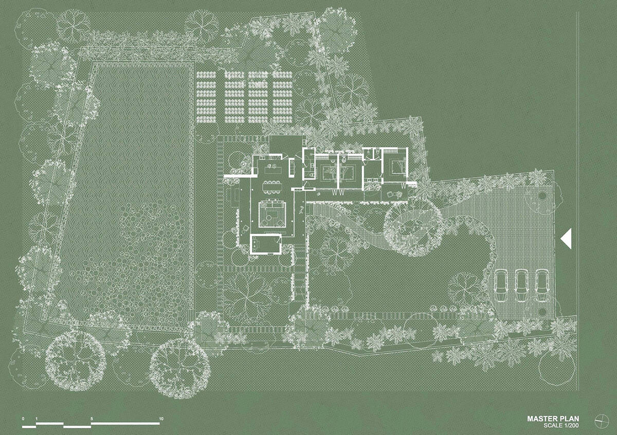 Công trình gồm hai khối chính, bám theo hình thái khu đất thon dài, hẹp ngang và kéo sâu về phía sau. Trục không gian được phát triển tuần tự từ cổng vào, sân vườn, khối nhà ở tới khu vườn sau và đầm sen riêng. Chuỗi không gian này tạo nên một hành trình trải nghiệm có chiều sâu, trong đó cảnh quan đóng vai trò dẫn dắt và làm mềm các ranh giới kiến trúc.