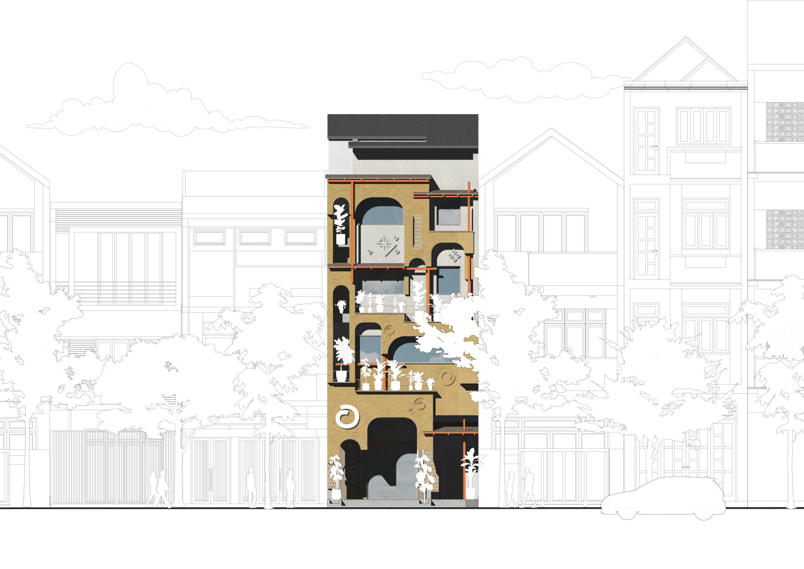 Với cách tiếp cận này, kiến trúc không áp đặt lên không gian, mà chỉ là một sự điều chỉnh tinh tế để tôn lên những giá trị vốn có. Khu vườn vẫn là khu vườn, nhưng giờ đây, nó không chỉ thuộc về ngôi nhà cũ mà còn trở thành một phần của không gian cộng đồng—một sự chuyển tiếp tự nhiên giữa con người và cảnh quan, giữa cũ và mới, giữa hiện trạng và những cơ hội của tương lai.