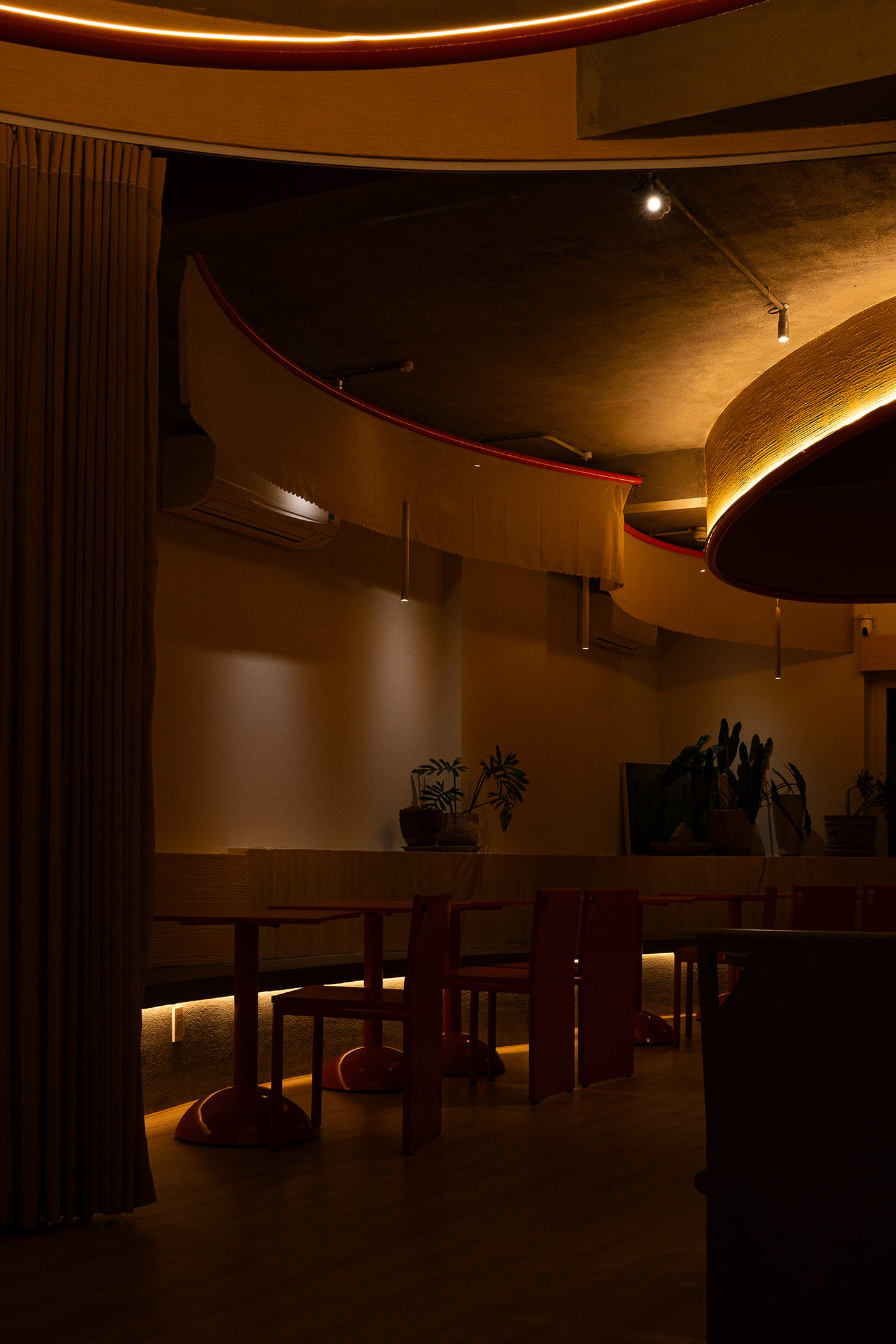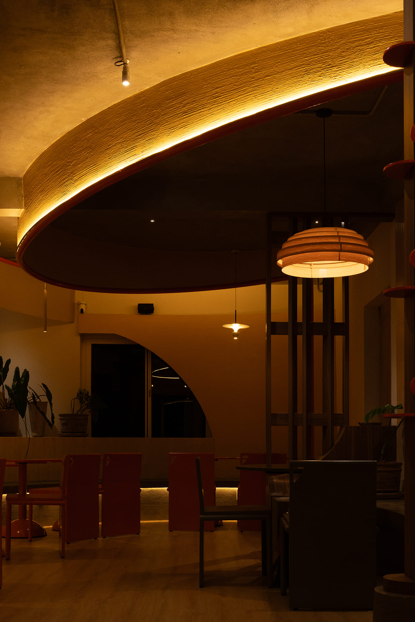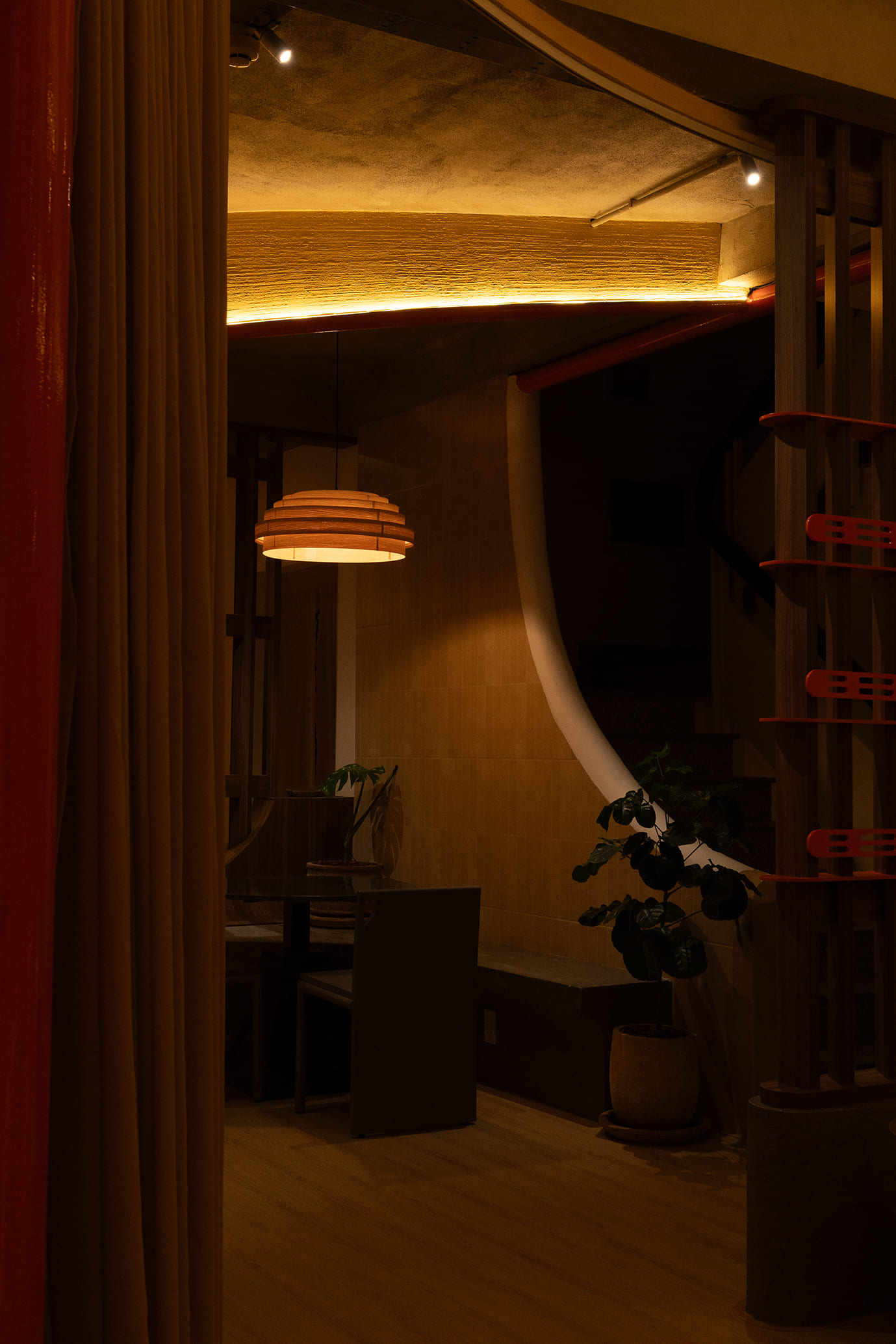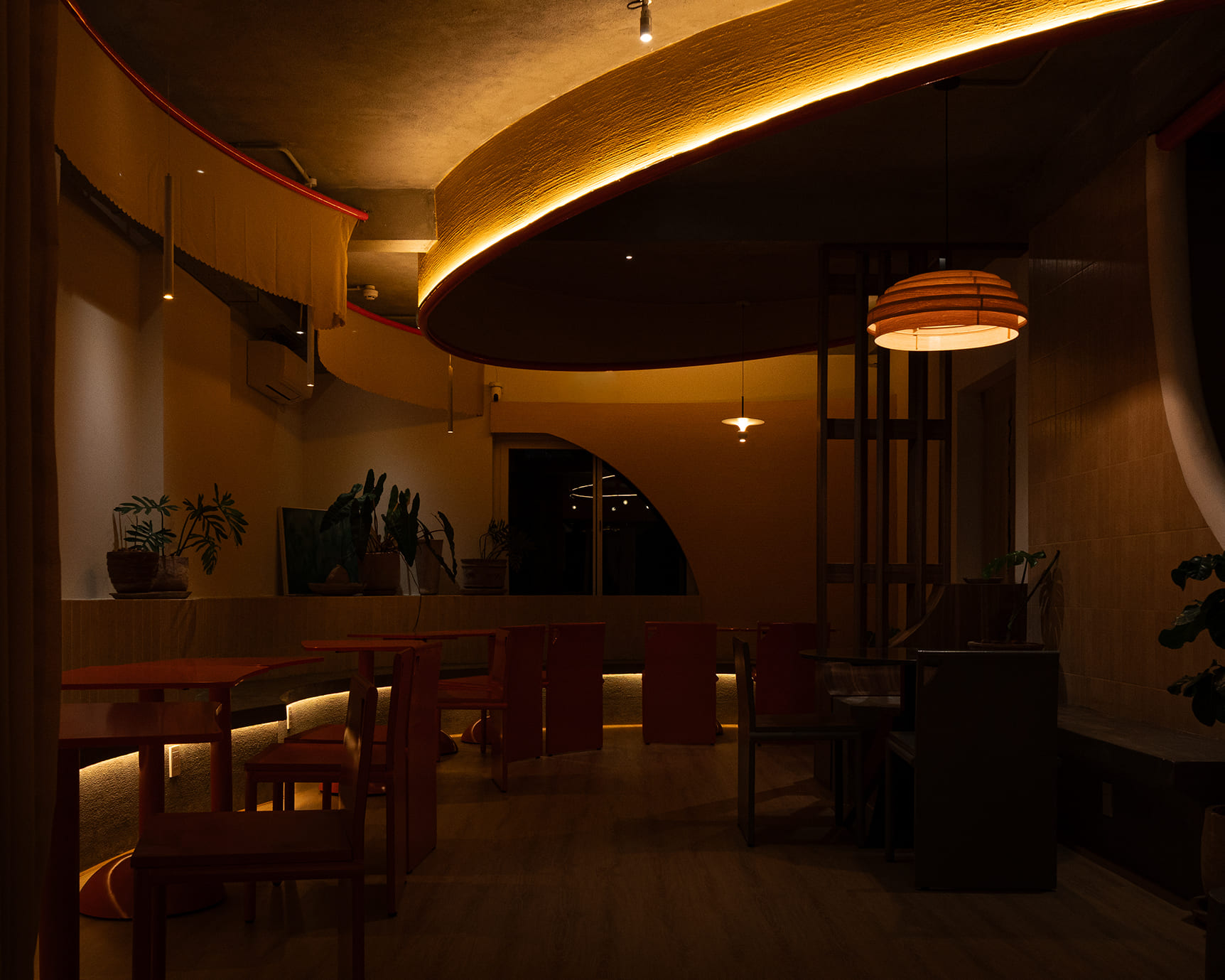 Những vách ngăn ước lệ được sử dụng để phân định không gian một cách mềm mại, tạo ra sự chuyển tiếp linh hoạt thay vì những ranh giới cứng nhắc. Chúng định hình các vùng chức năng một cách tự nhiên, đảm bảo tính riêng tư nhưng vẫn giữ được sự kết nối với khu vườn. Cùng một khoảng xanh, nhưng giờ đây, cả hai không gian—ngôi nhà và quán cà phê—đều có thể cộng hưởng, cùng chia sẻ giá trị của nó theo một cách mới.