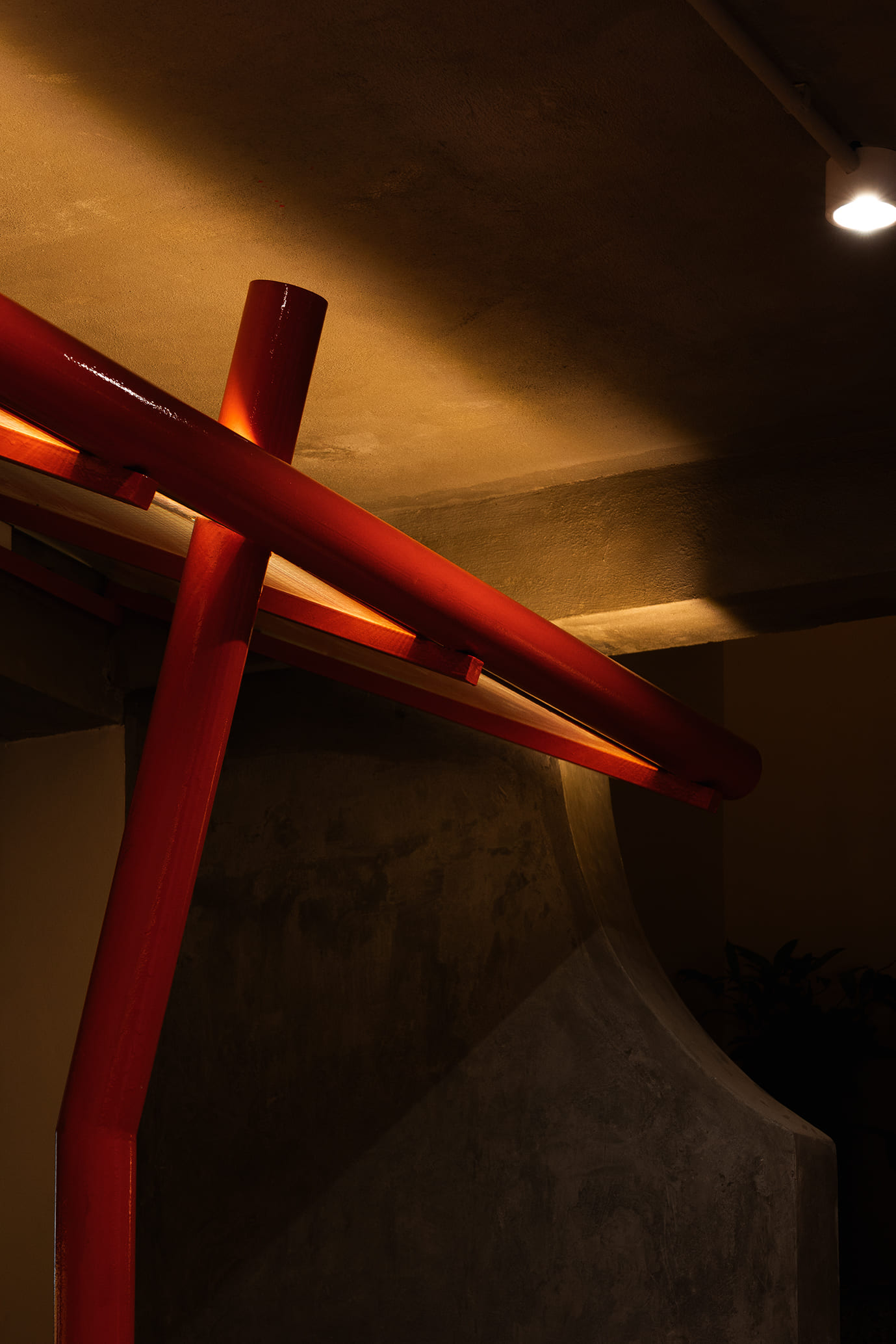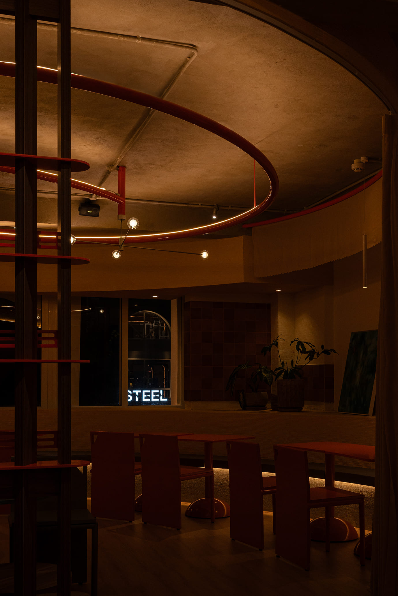 Hệ kết cấu được thiết kế theo nguyên tắc tối giản nhưng hiệu quả. Cột, mái, sê-nô đều được tinh chỉnh để mỗi yếu tố đều có vai trò rõ ràng, không có chi tiết nào dư thừa. Về vật liệu, chúng tôi chọn những giải pháp nhẹ, có tính tương tác cao với cảnh quan. Hệ mái che được thiết kế như một lớp phủ mỏng, gợn lên như một áng mây, tạo bóng râm nhưng không che khuất hoàn toàn ánh sáng tự nhiên. Vách ngăn được “may thủ công” từ sắt tấm 3mm để gỉ tự nhiên, chấn cạnh để tăng độ cứng, mang đến một chất cảm gần gũi như những thân gỗ cũ. Mặt dựng bằng lưới thép giúp giảm khối tích công trình, đồng thời tạo nên sự hòa quyện giữa kiến trúc và cây xanh.
