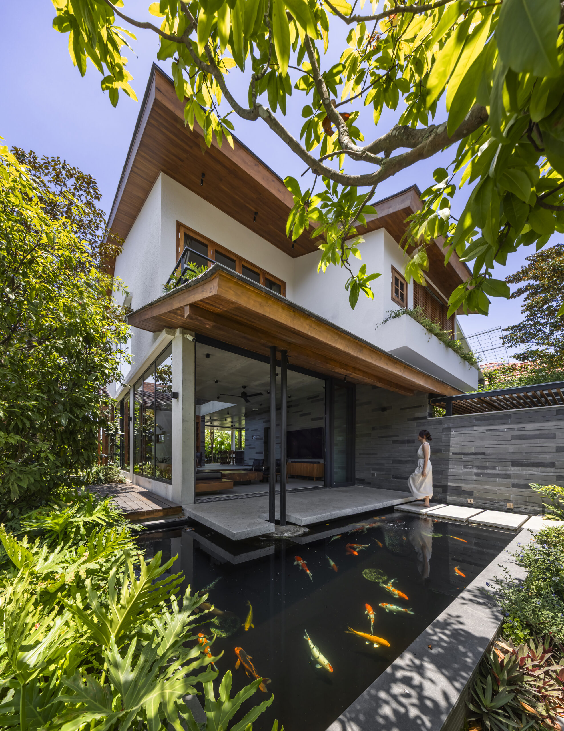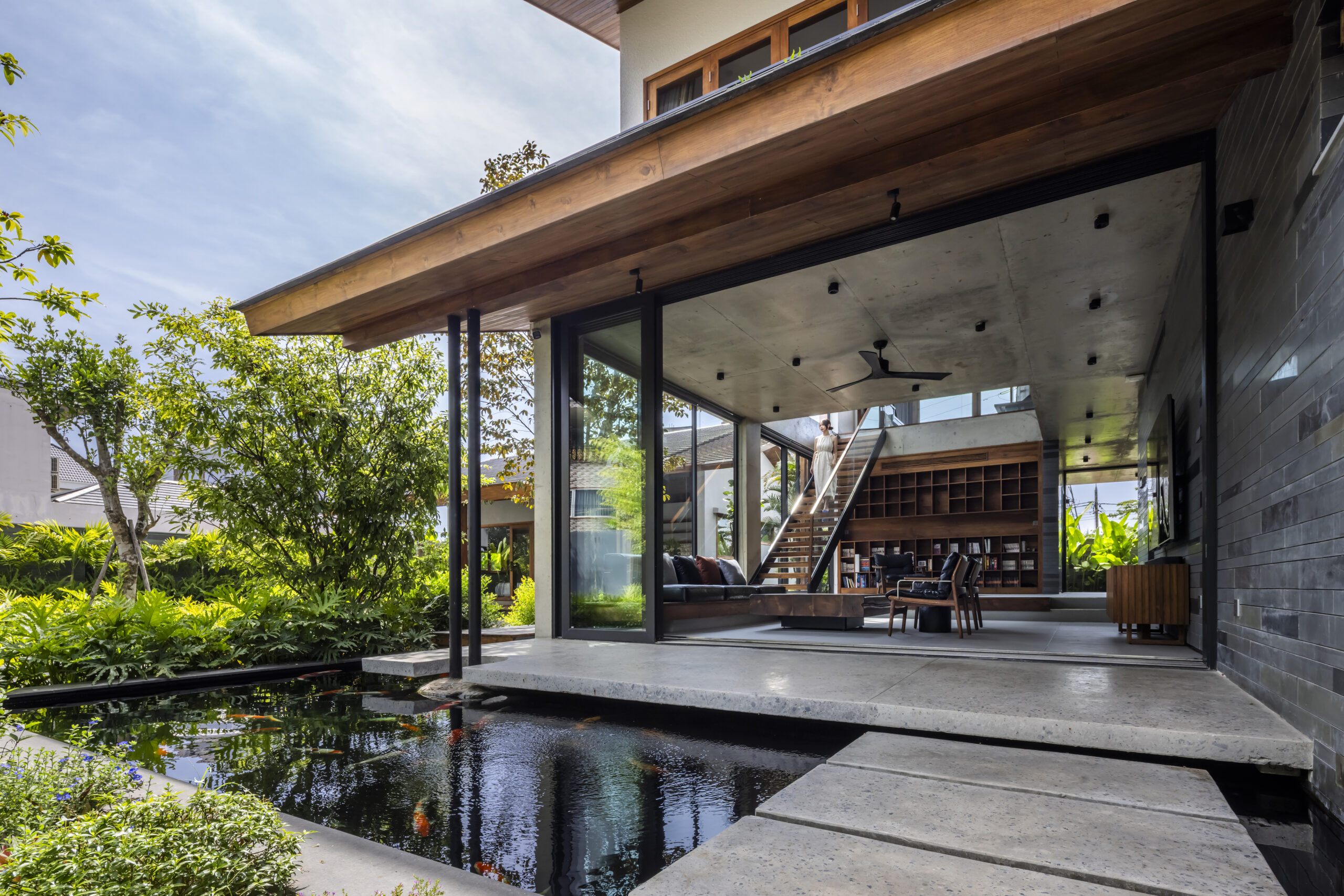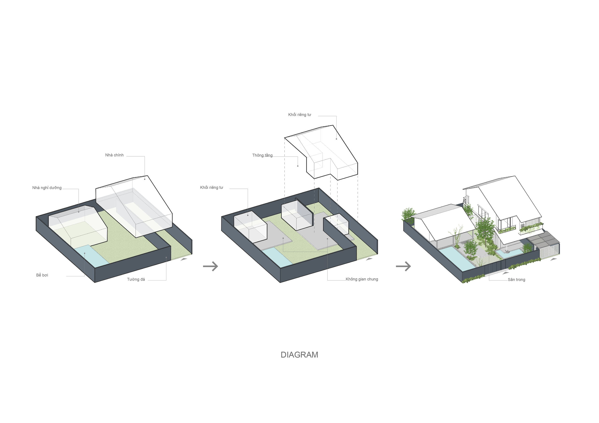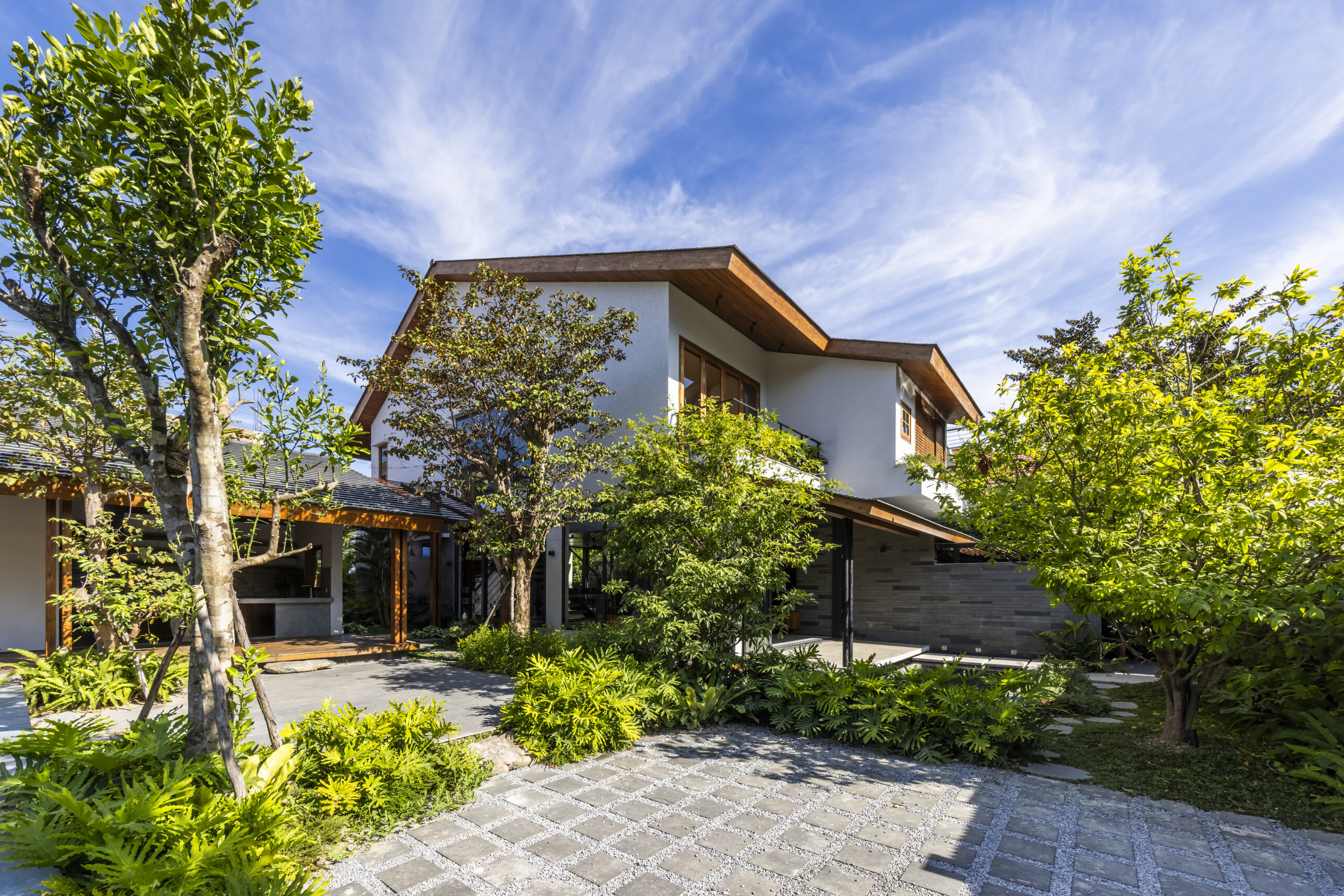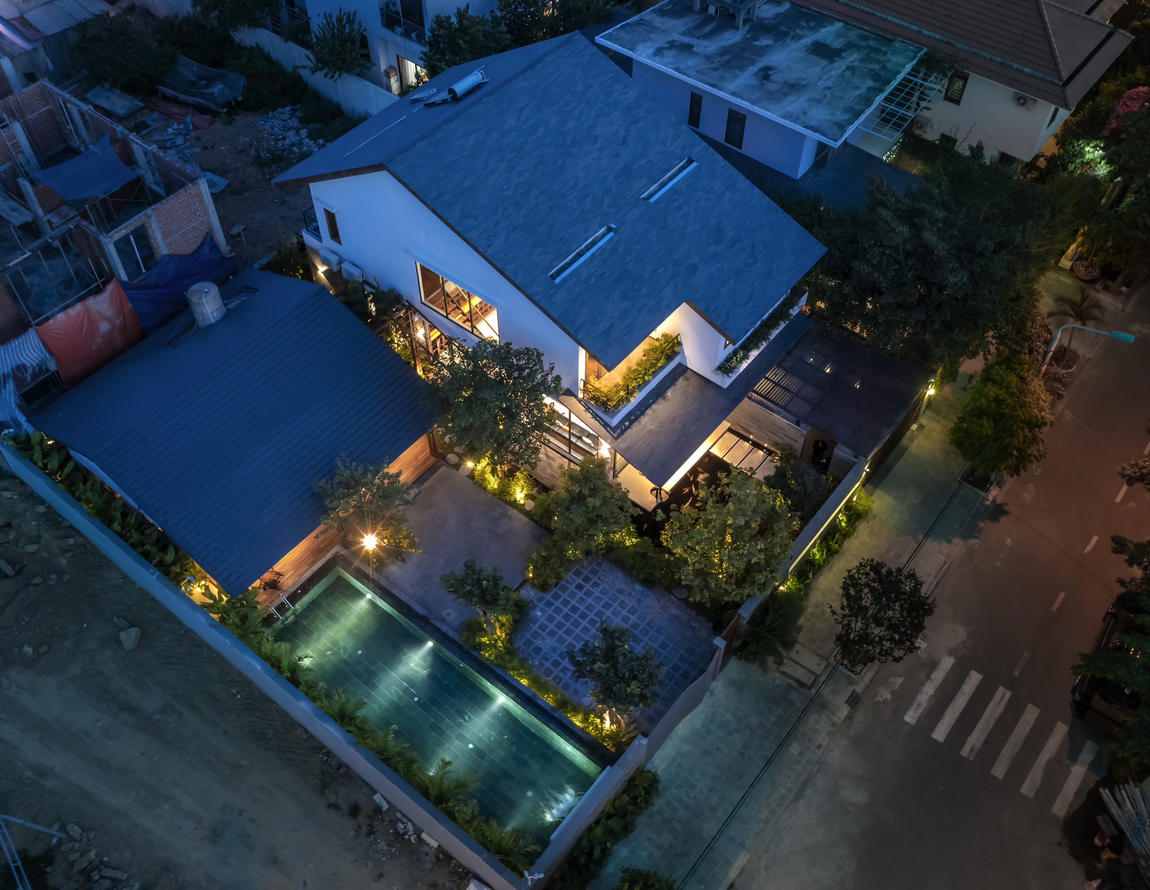 Tổng thể công trình gồm: khối nhà chính cao hai tầng – nơi diễn ra các sinh hoạt thường nhật  của gia đình – và một khối nhà phụ mang tính chất nghỉ dưỡng. Với mật độ xây dựng khoảng  47%, phần lớn diện tích khu đất được dành cho không gian sân vườn và các hoạt động ngoài
