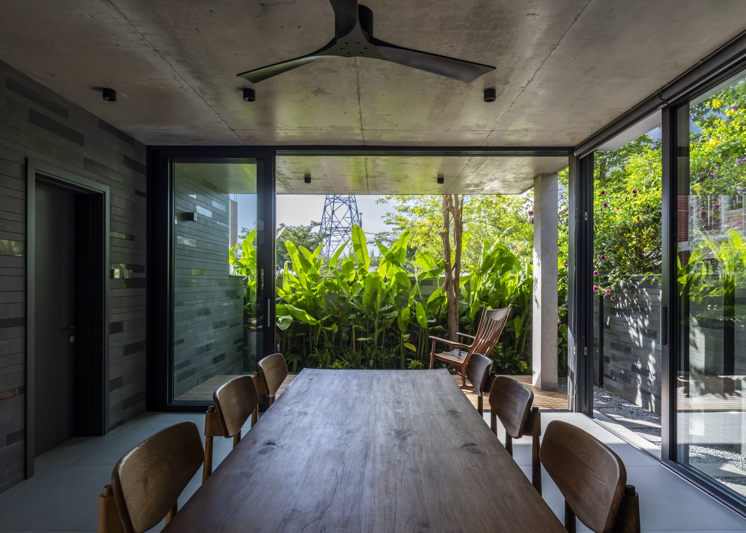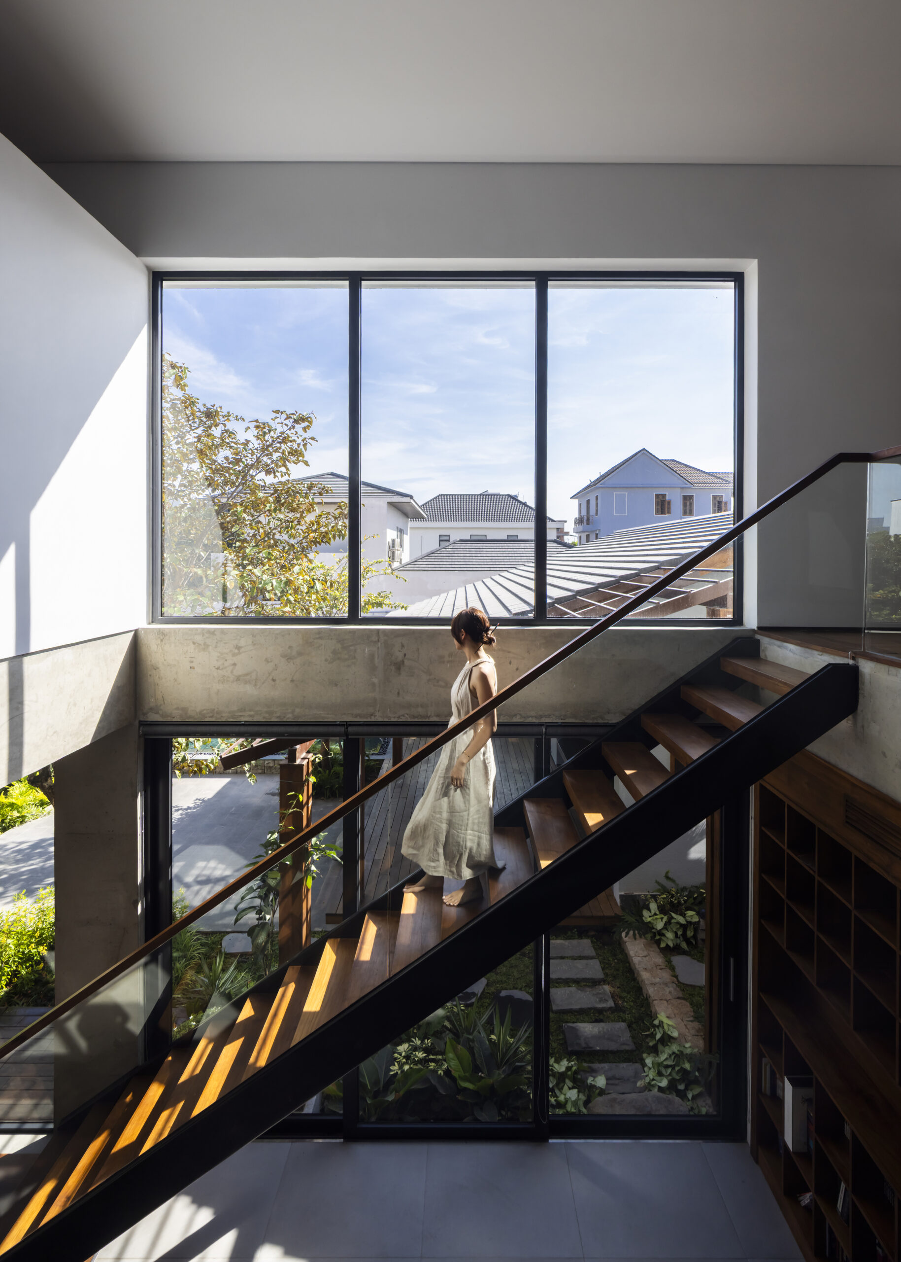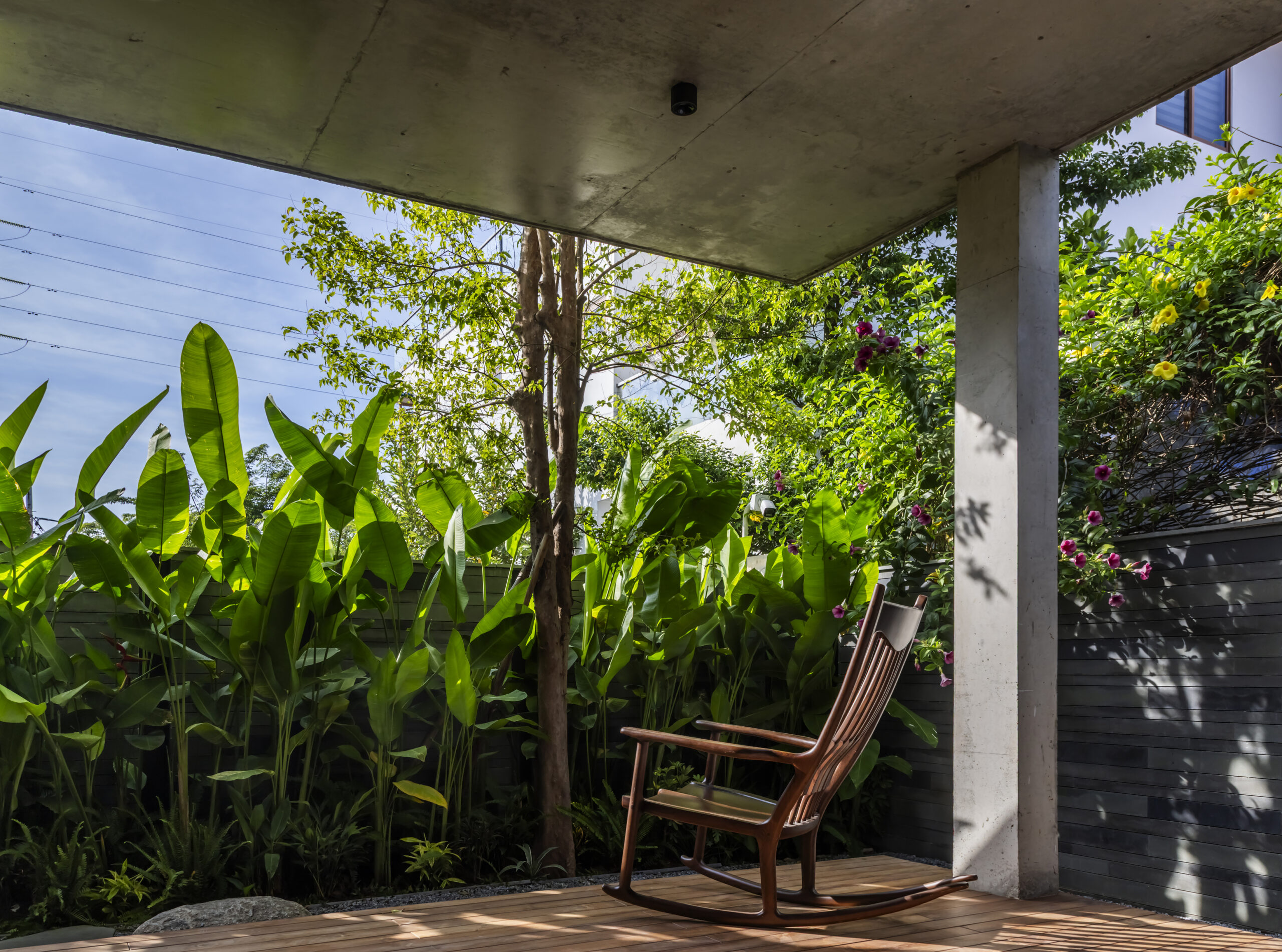 thần, ngôi nhà được thiết kế với mặt đứng tương đối khép kín, đồng thời mở ra một khu vườn  lớn ở bên trong, tạo nên một không gian sống xanh mát, yên bình giữa lòng đô thị nén.