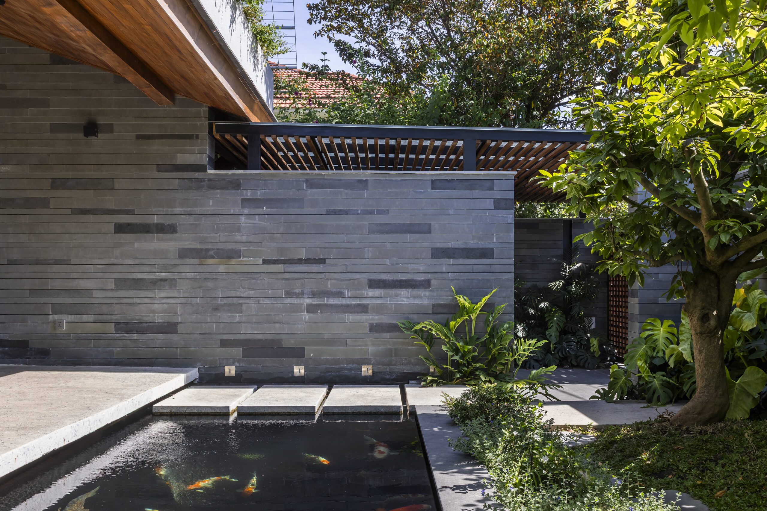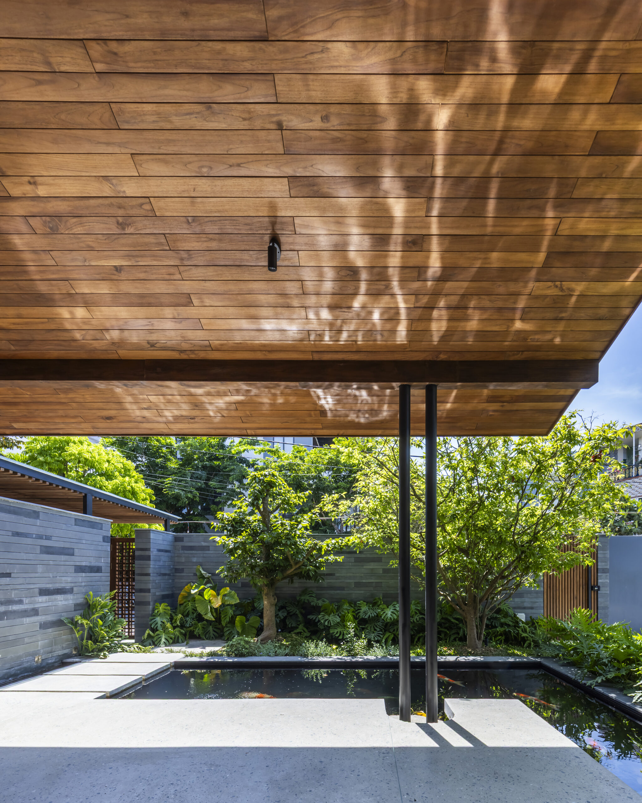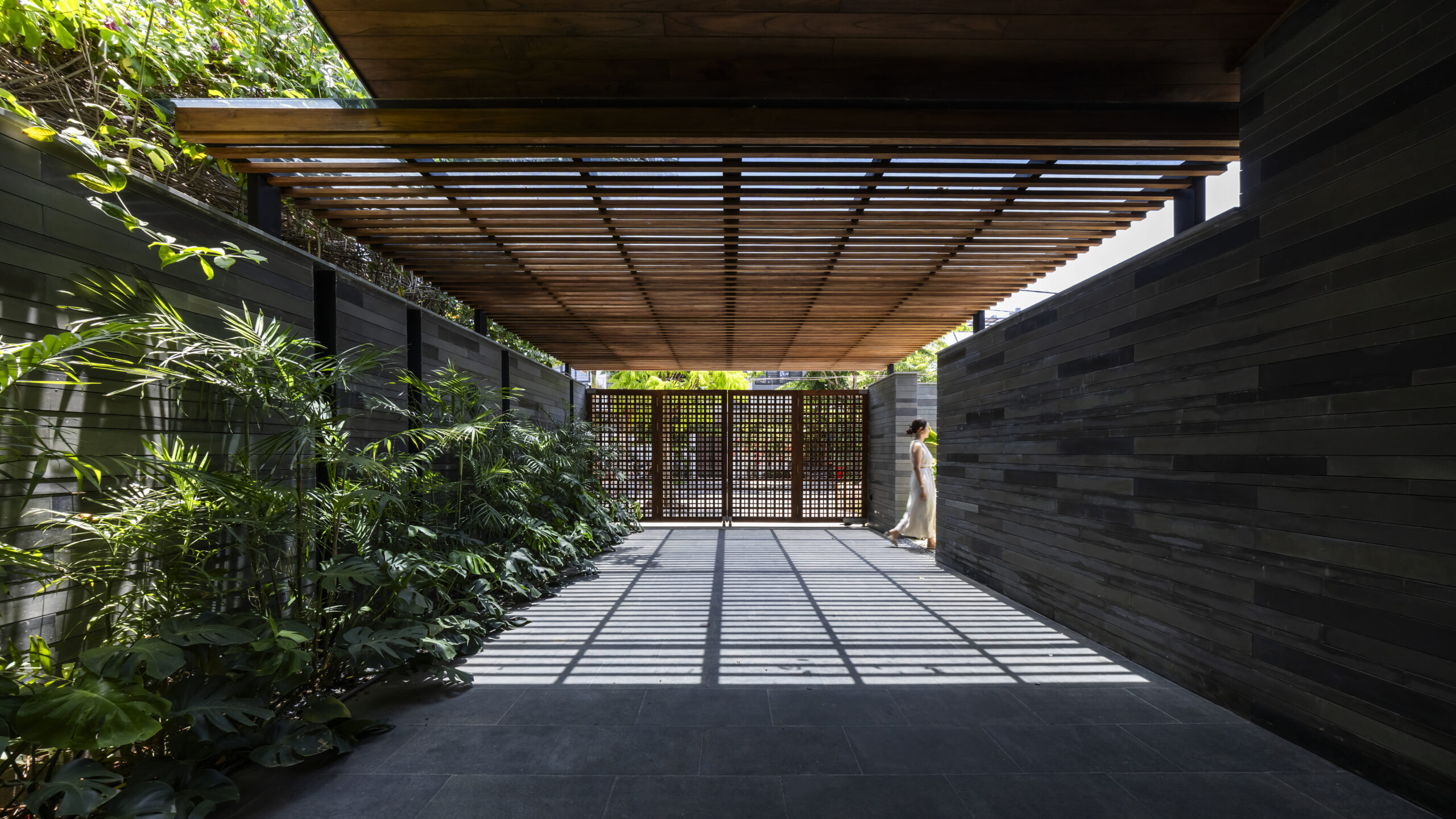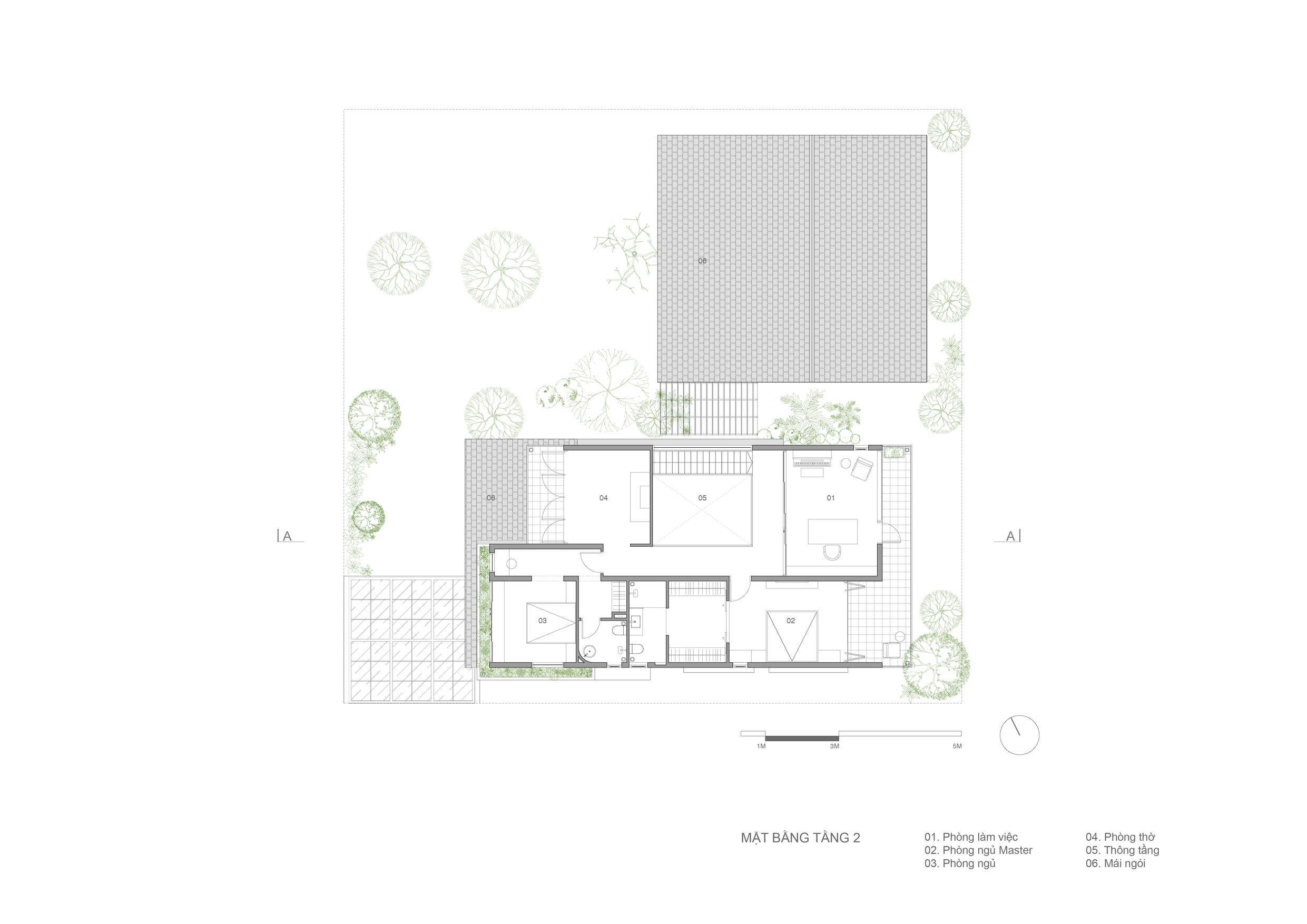 thần, ngôi nhà được thiết kế với mặt đứng tương đối khép kín, đồng thời mở ra một khu vườn  lớn ở bên trong, tạo nên một không gian sống xanh mát, yên bình giữa lòng đô thị nén.