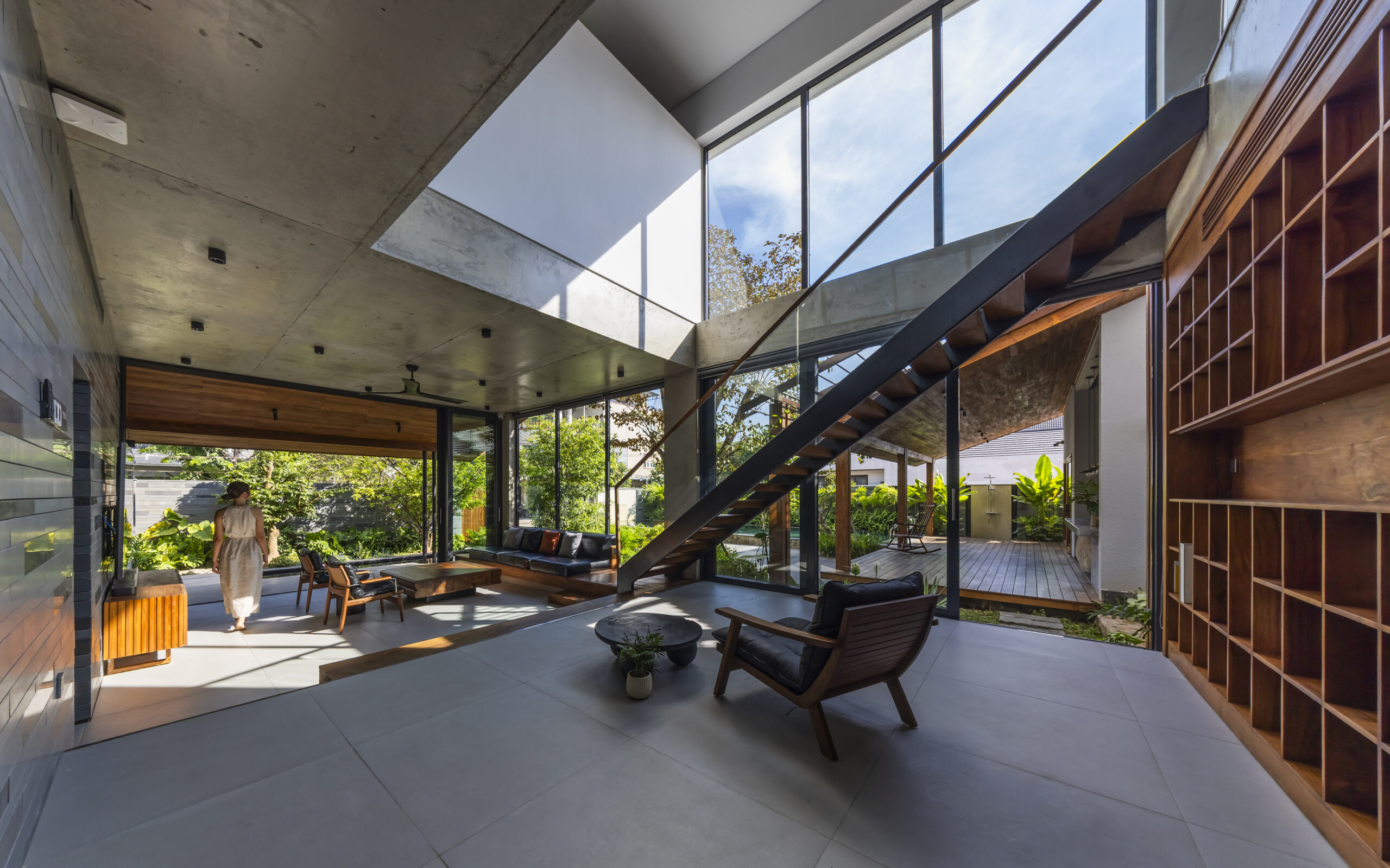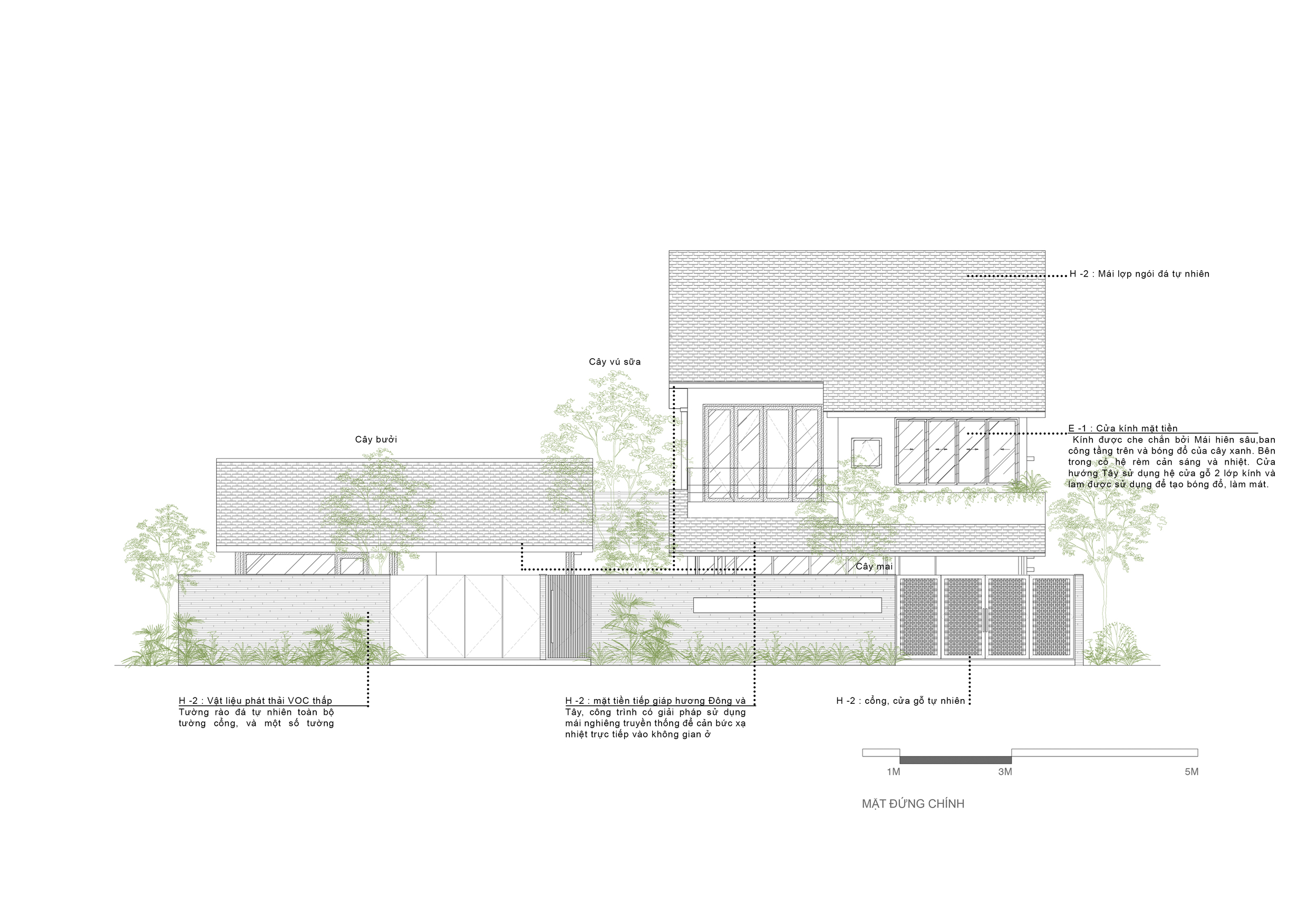 Với mặt tiền hướng Tây Bắc – nơi chịu bức xạ mặt trời mạnh vào buổi trưa và chiều – công  trình được xử lý bằng hệ mái nghiêng kết hợp với khoảng hiên sâu, tạo nên lớp không gian  đệm hiệu quả giữa trong nhà và ngoài trời. Giải pháp này giúp cản nắng, che mưa và giảm  nhiệt cho không gian bên trong. Tại khối nhà chính, không gian sinh hoạt chung được tổ  chức thành một không gian mở kết nối chéo giữa vườn trước và vườn sau, kết hợp khoảng  thông tầng trung tâm qua đó tăng cường đối lưu không khí và đón gió mát từ hướng Đông  Nam. Hầu hết các phòng riêng tư đều có cửa sổ hướng ra sân vườn, đảm bảo điều kiện chiếu  sáng và thông gió tự nhiên.