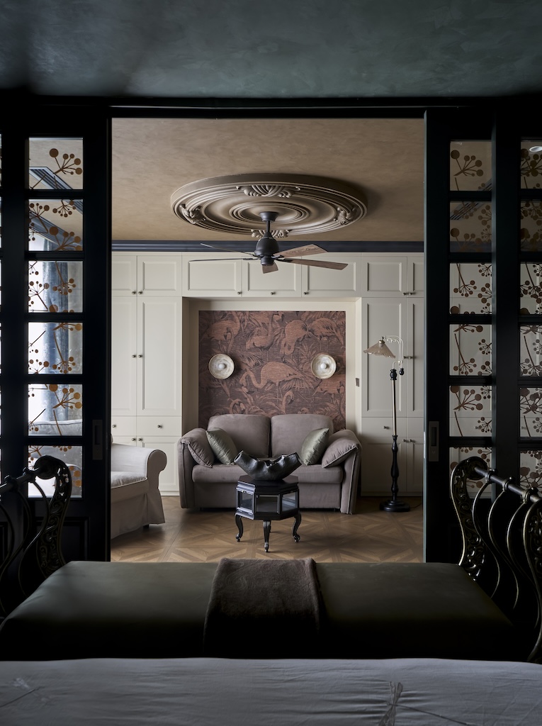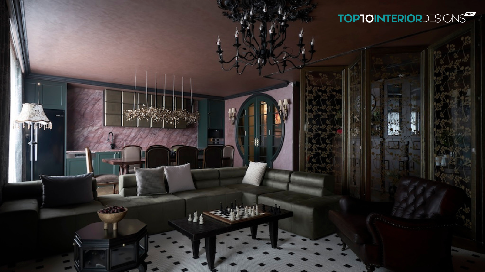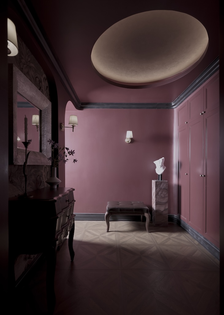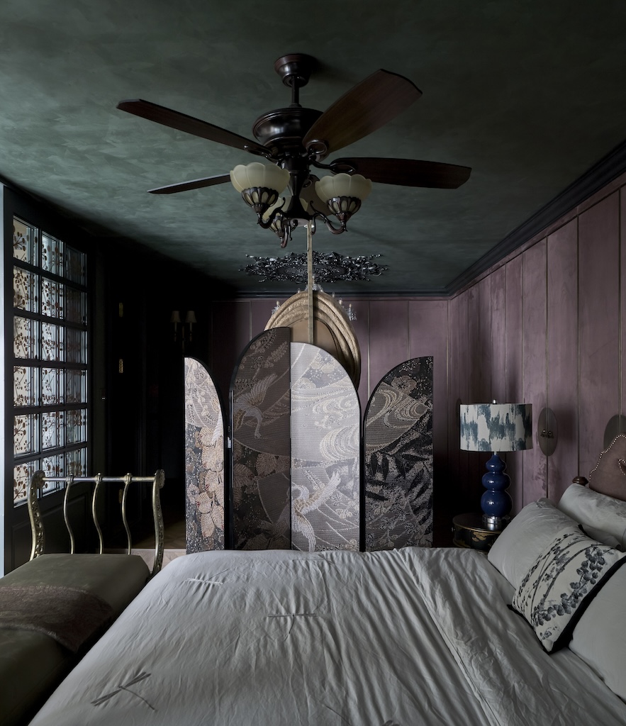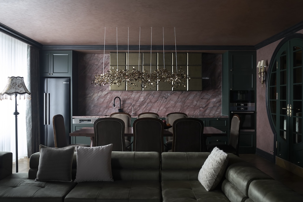 Sức hút của căn hộ nằm ở sự bạo dạn trong cách phối trộn chất liệu. Đó là trần nhà màu xanh rêu trầm mát, những bức tường đỏ thẫm đầy tính tự sự, kết hợp cùng sàn gỗ sồi ấm áp và vách kính ánh vàng phản chiếu ban mai. Mỗi chi tiết đều mang tính độc bản, từ những bức tranh sơn mài được vẽ riêng cho gia chủ, đến trần vòm phòng khách được những thợ thủ công kiên nhẫn vẽ tay suốt nhiều ngày, mang theo cả sức nặng của thời gian và tâm huyết.
