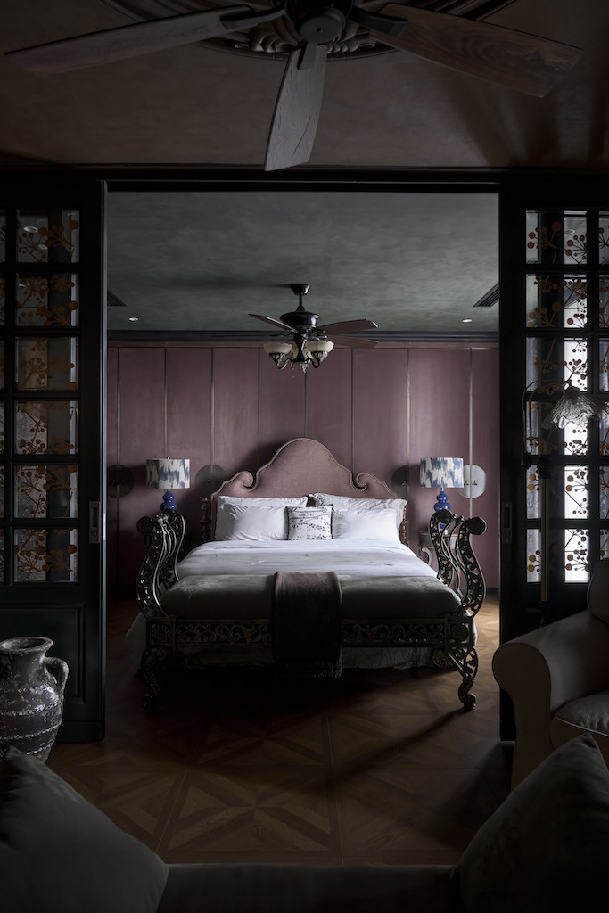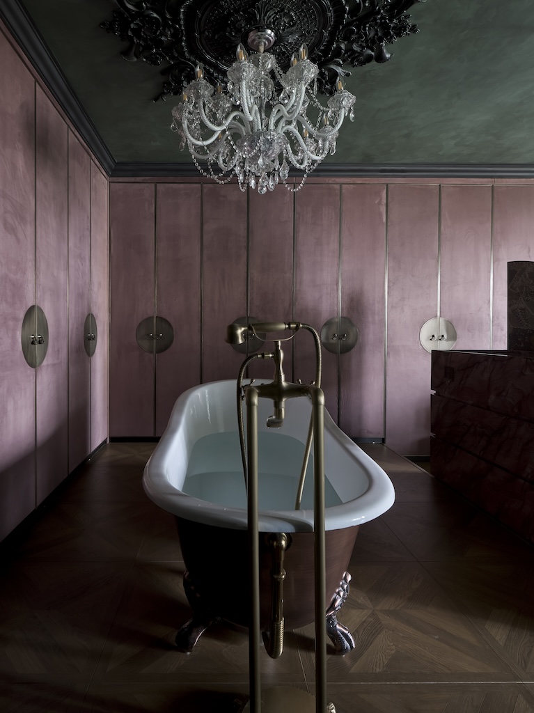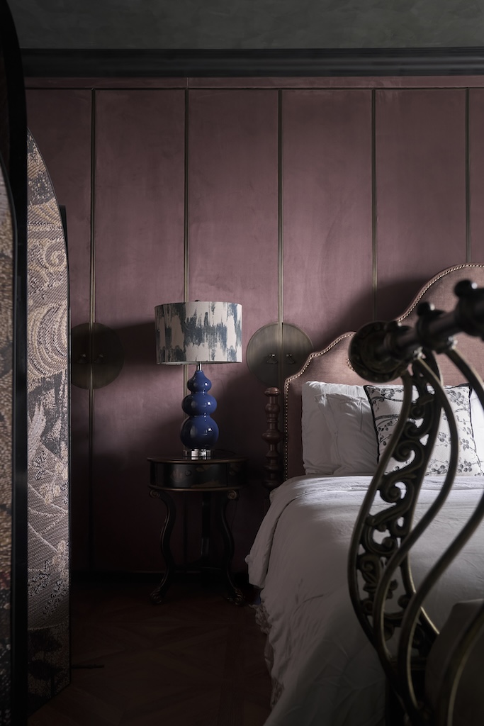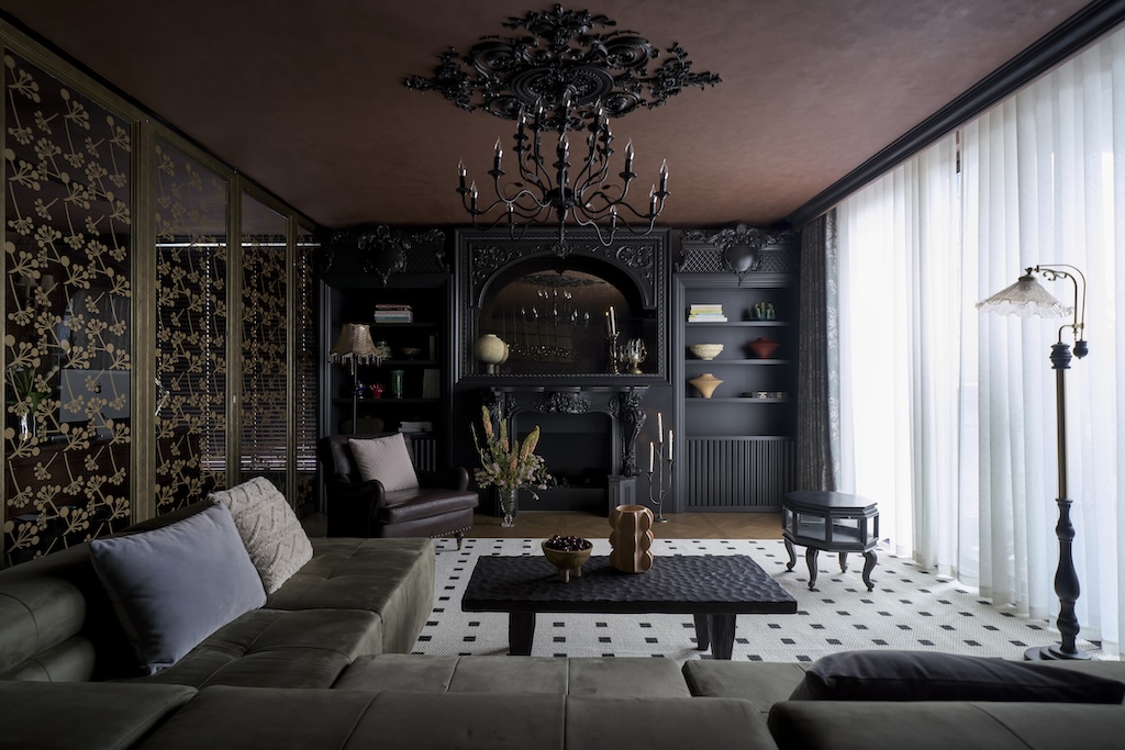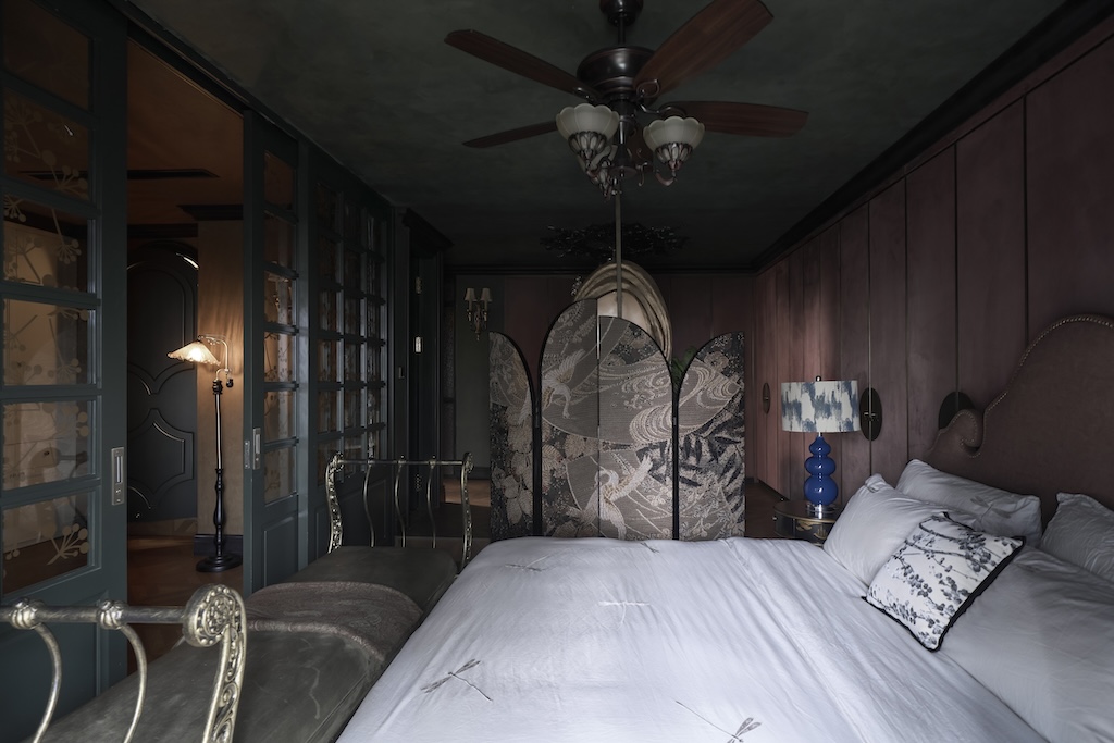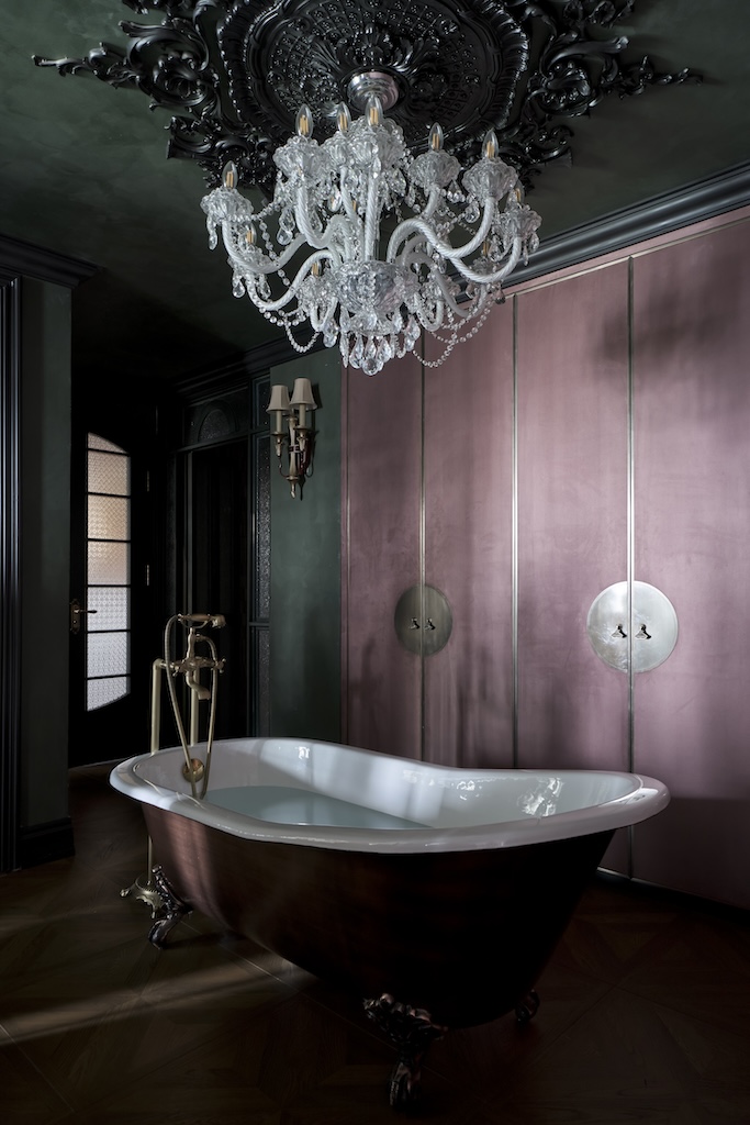 Sức hút của căn hộ nằm ở sự bạo dạn trong cách phối trộn chất liệu. Đó là trần nhà màu xanh rêu trầm mát, những bức tường đỏ thẫm đầy tính tự sự, kết hợp cùng sàn gỗ sồi ấm áp và vách kính ánh vàng phản chiếu ban mai. Mỗi chi tiết đều mang tính độc bản, từ những bức tranh sơn mài được vẽ riêng cho gia chủ, đến trần vòm phòng khách được những thợ thủ công kiên nhẫn vẽ tay suốt nhiều ngày, mang theo cả sức nặng của thời gian và tâm huyết.