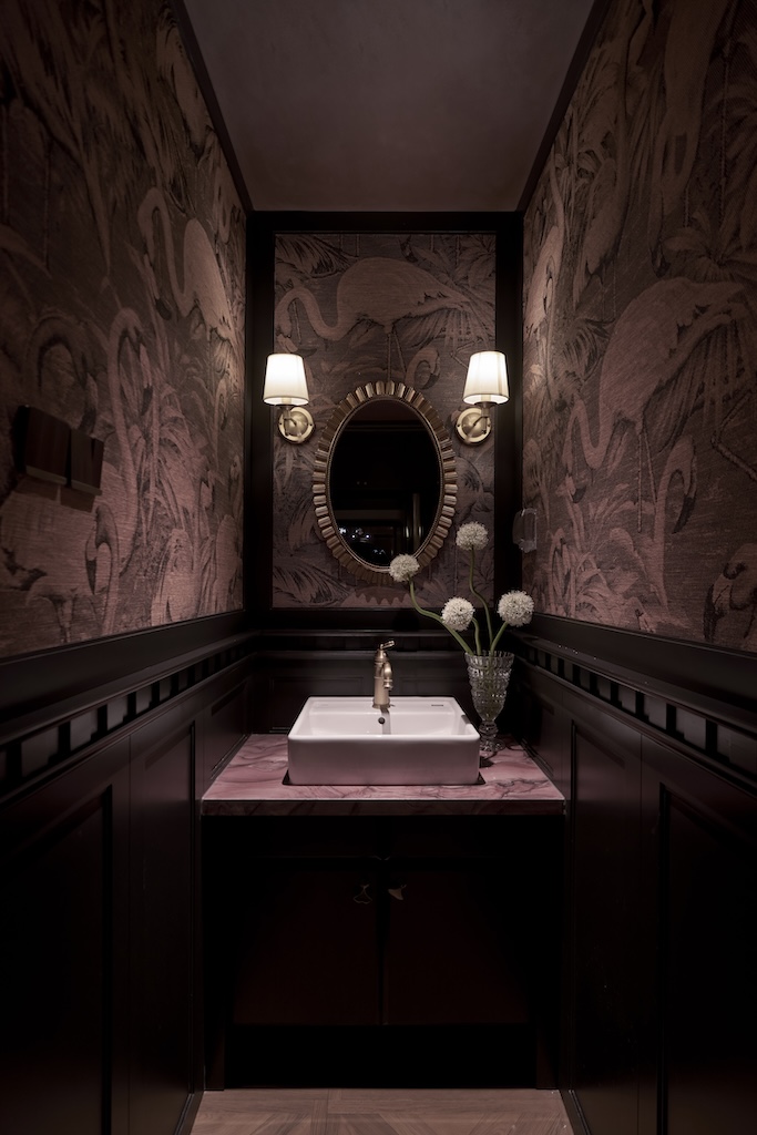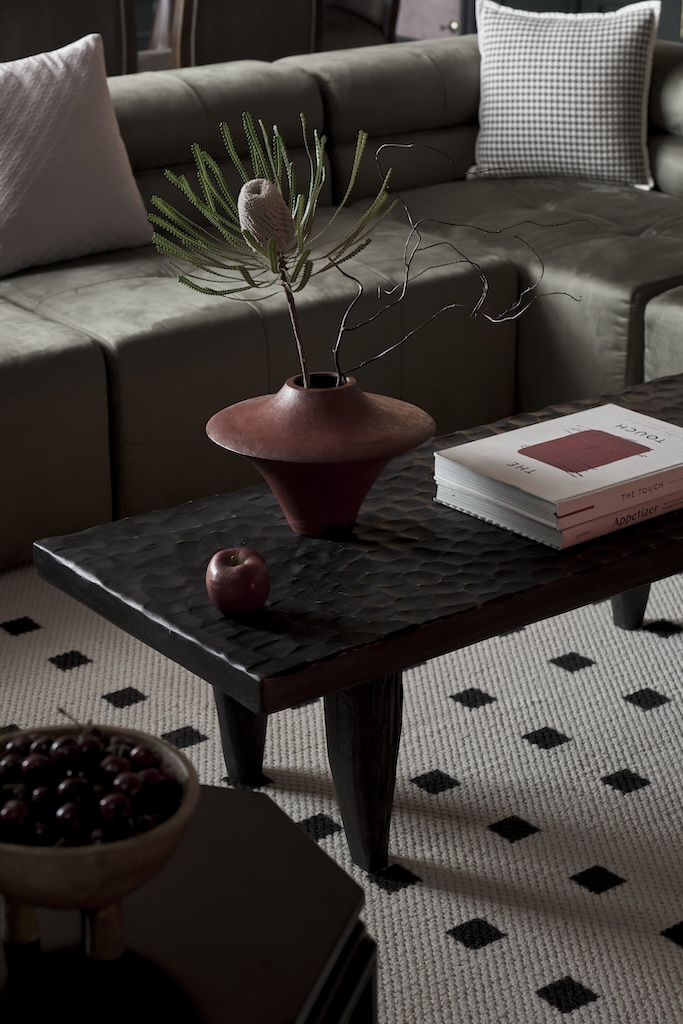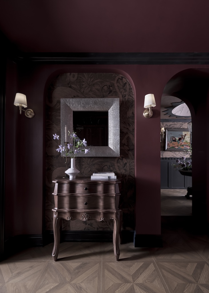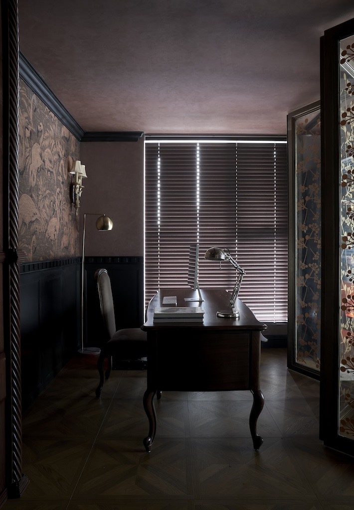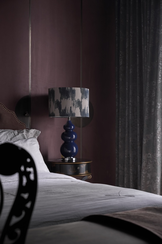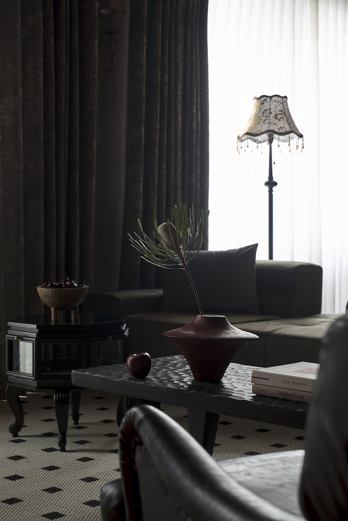 Sức hút của căn hộ nằm ở sự bạo dạn trong cách phối trộn chất liệu. Đó là trần nhà màu xanh rêu trầm mát, những bức tường đỏ thẫm đầy tính tự sự, kết hợp cùng sàn gỗ sồi ấm áp và vách kính ánh vàng phản chiếu ban mai. Mỗi chi tiết đều mang tính độc bản, từ những bức tranh sơn mài được vẽ riêng cho gia chủ, đến trần vòm phòng khách được những thợ thủ công kiên nhẫn vẽ tay suốt nhiều ngày, mang theo cả sức nặng của thời gian và tâm huyết.