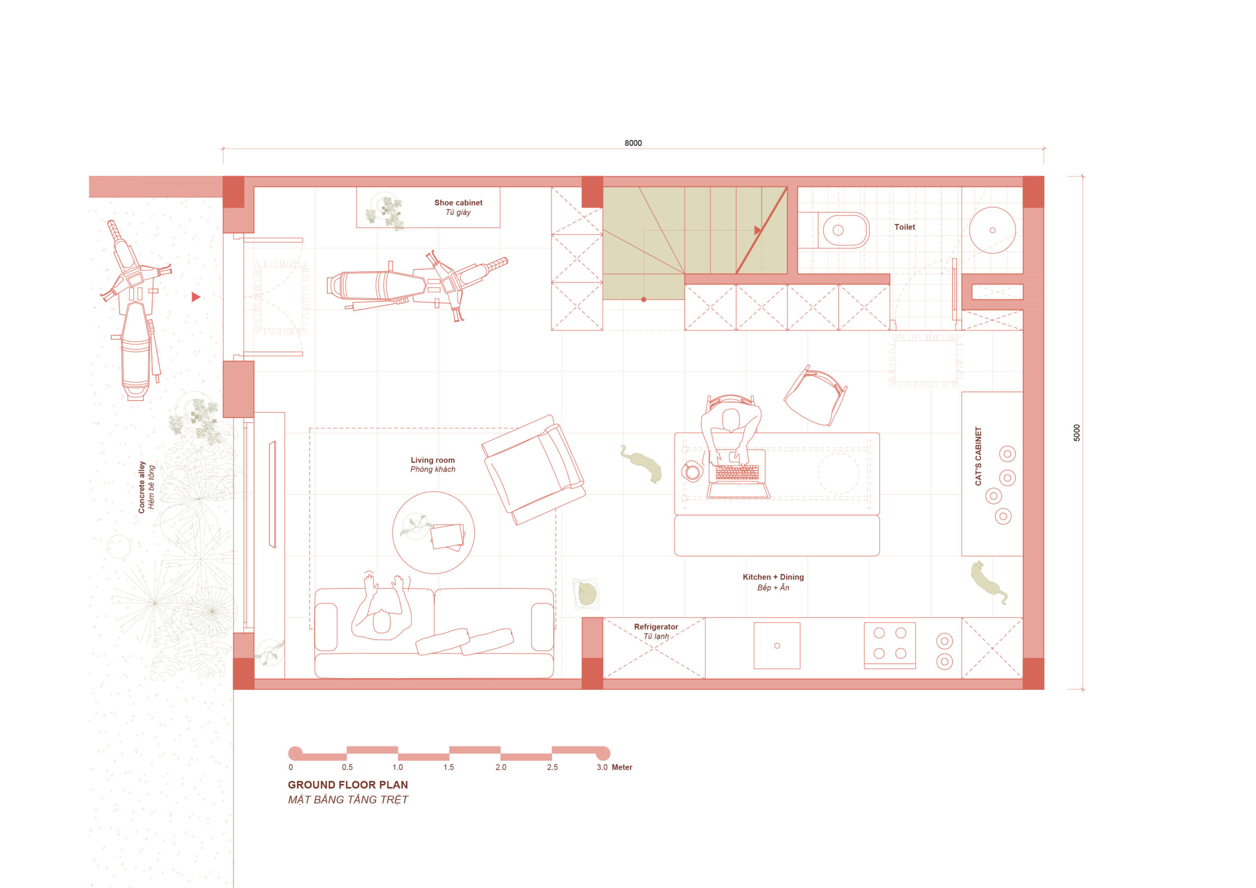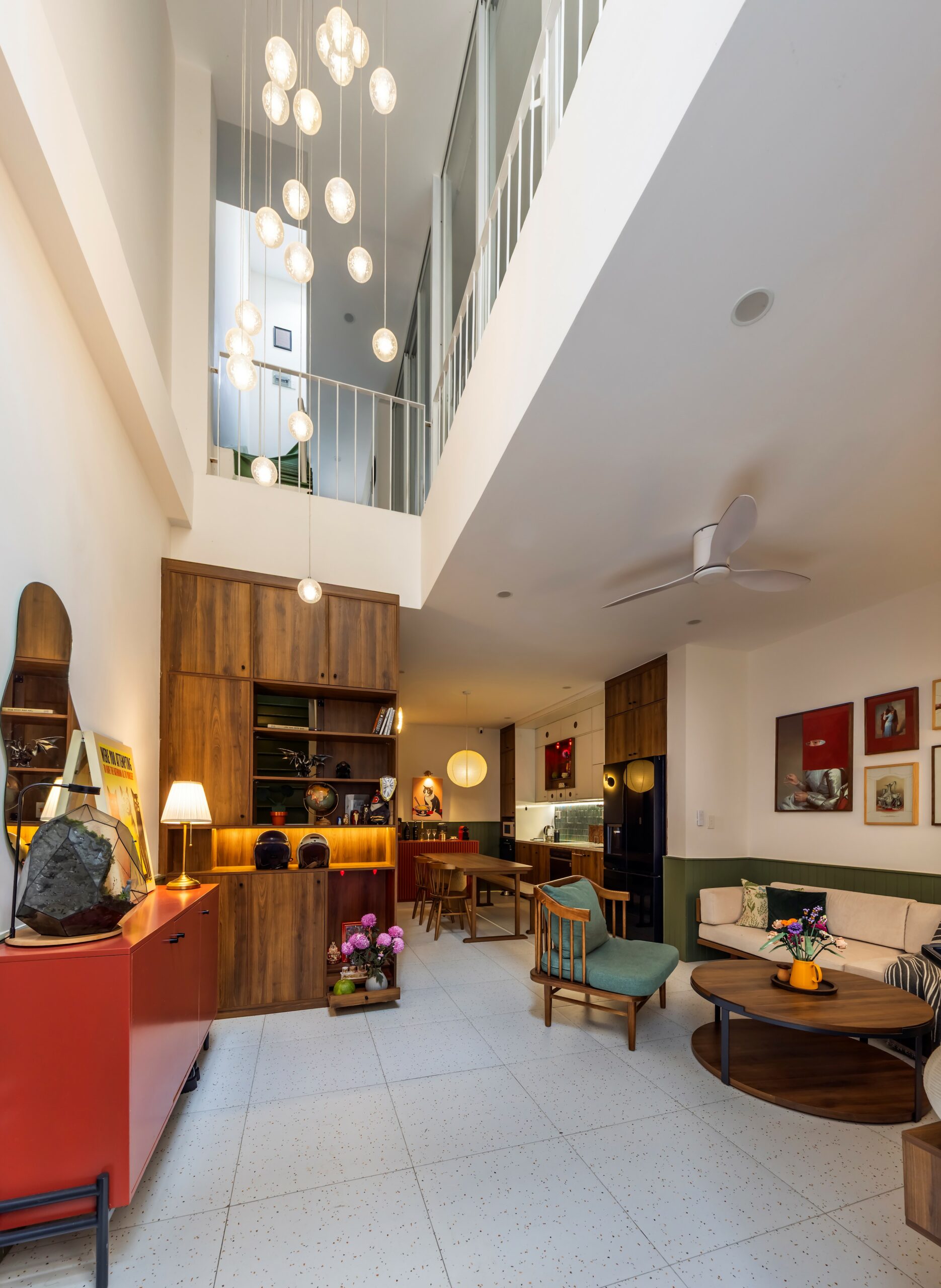 Tầng trệt trở thành không gian sinh hoạt chung – nơi con người và những chú mèo cùng chia sẻ nhịp sống hằng ngày. Khoảng thông tầng được đặt ngay lối vào, vì thế ngay khoảnh khắc bước chân vào nhà, cảm giác đầu tiên không phải là sự chật hẹp, mà là một không gian mở, cao và thoáng, vượt xa những gì diện tích thực tế có thể gợi lên.