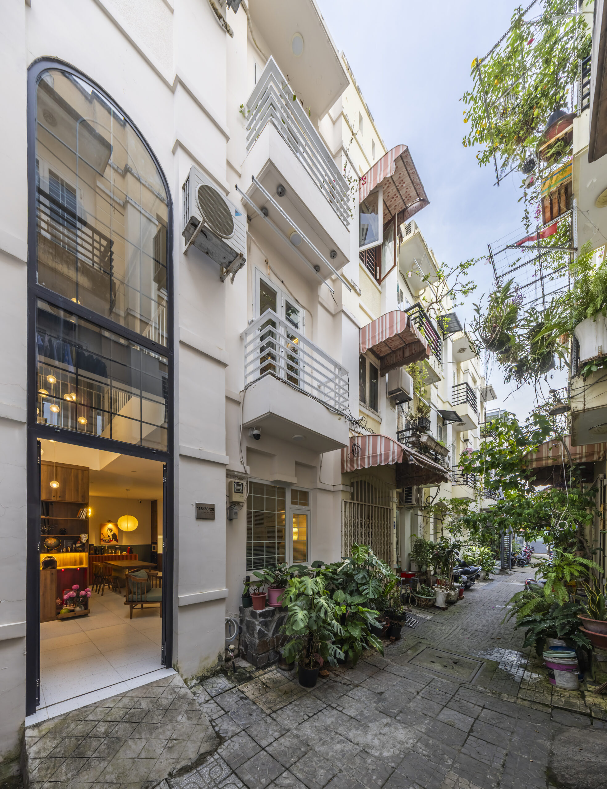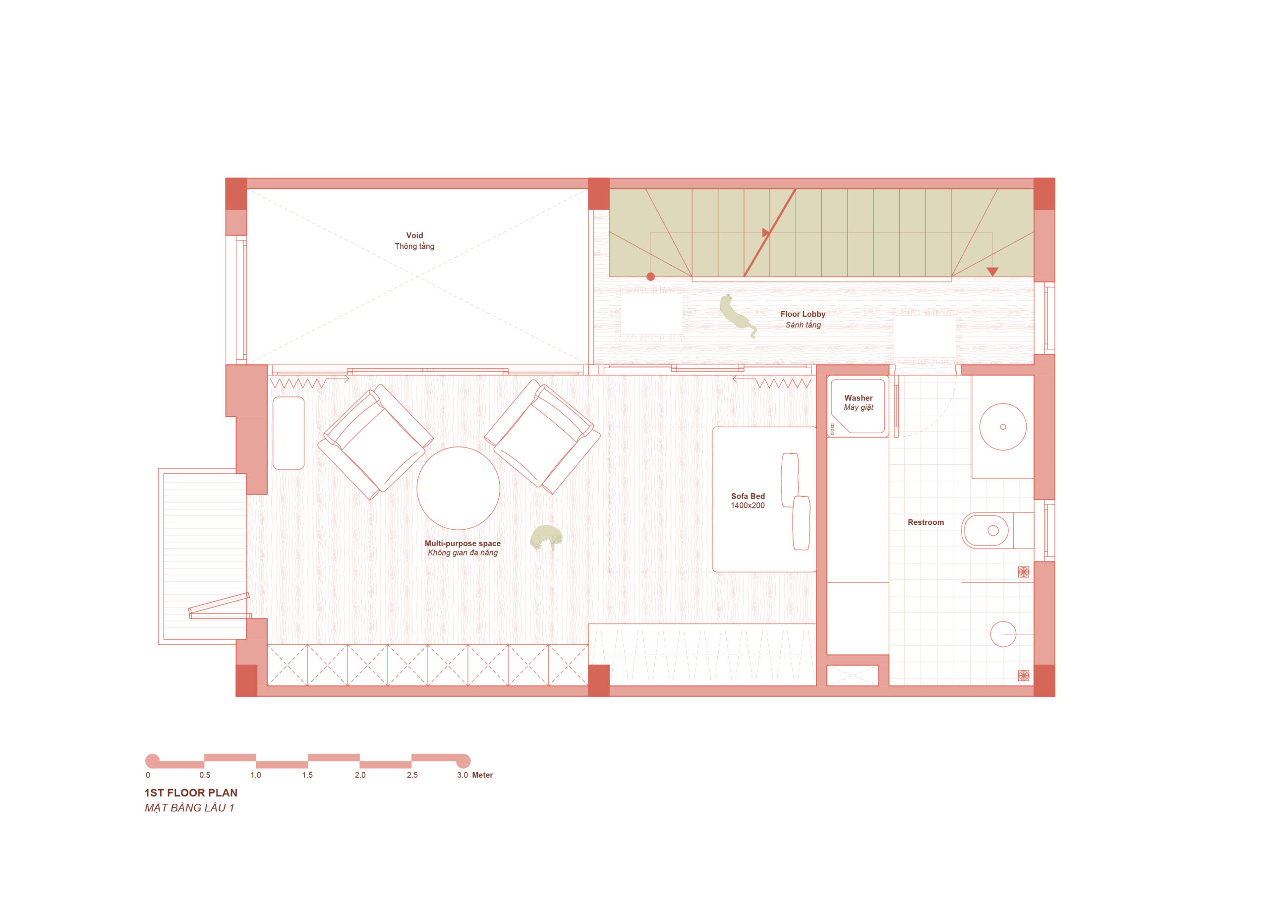 Hiện trạng ban đầu mang dáng dấp quen thuộc của nhà phố Việt Nam: không gian hẹp, thiếu ánh sáng và kém thông thoáng ở tầng trệt. Thay vì chấp nhận sự chật chội đó, giải pháp được lựa chọn là mở một khoảng thông tầng lớn xuyên suốt các tầng, tận dụng cầu thang hiện hữu để kết nối các không gian sống. Khoảng thông tầng này không chỉ mang ánh sáng và không khí len lỏi xuống tầng trệt, mà còn tạo nên sự kết nối liền mạch giữa các tầng, khiến ngôi nhà như được “thở” trở lại.