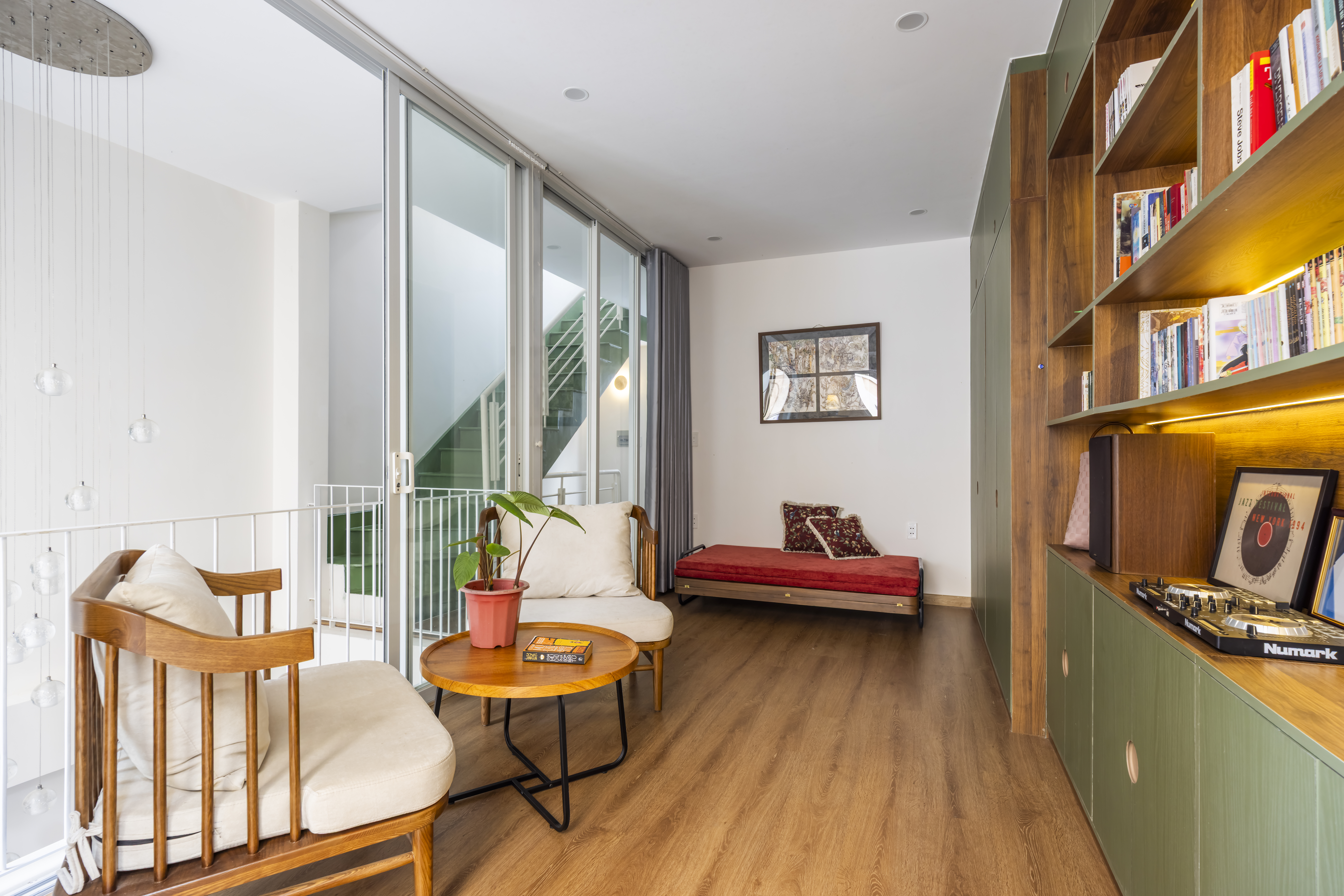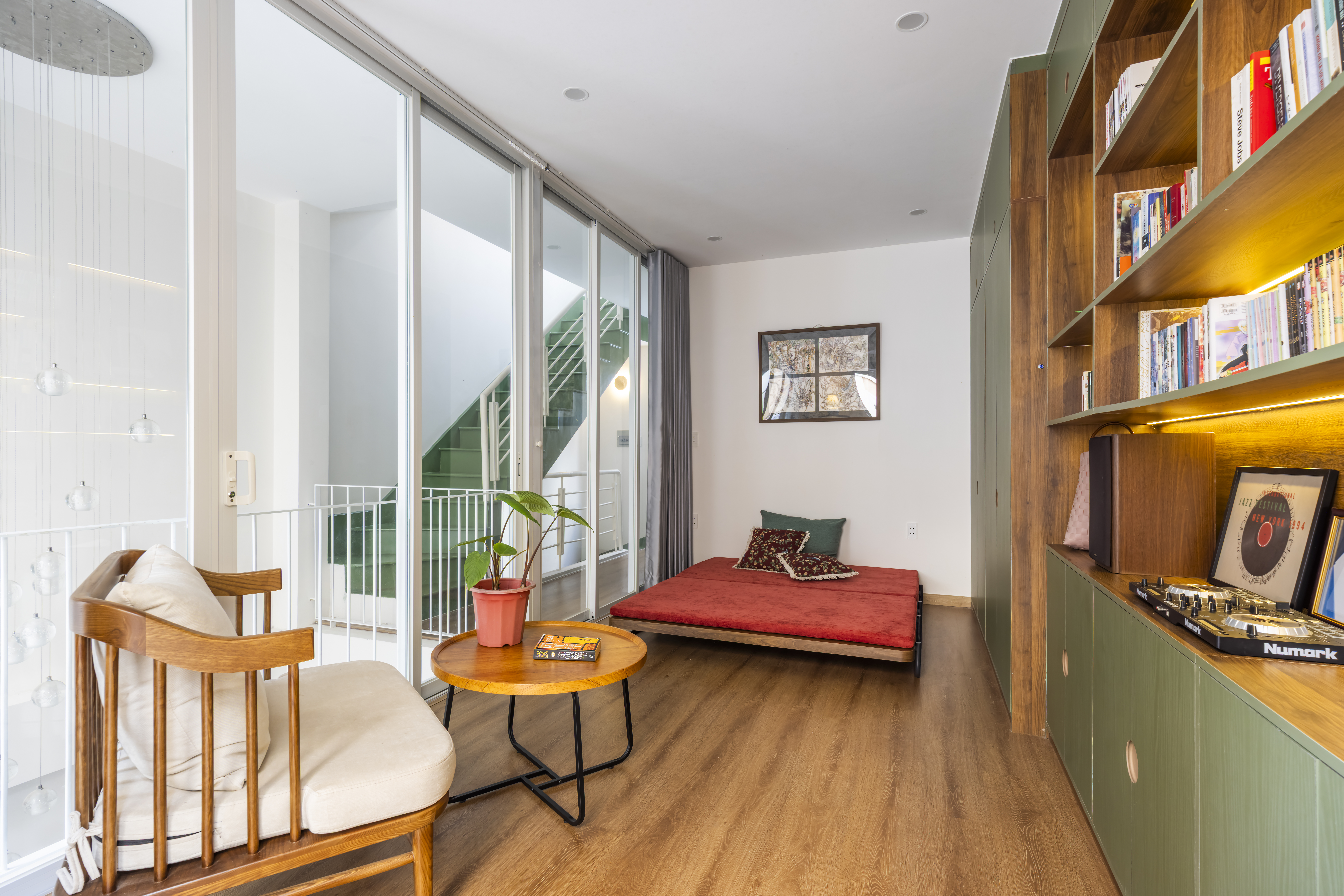– Lầu 1 được thiết kế như một thư viện nhỏ, yên tĩnh và đầy chất riêng. Khi cần, không gian này có thể linh hoạt trở thành phòng ngủ cho khách, vẫn giữ được sự kết nối với tầng trệt thông qua khoảng thông tầng – nơi ánh sáng, tiếng động và cảm xúc nhẹ nhàng lan tỏa. Lầu 2 được ưu tiên hoàn toàn cho phòng ngủ master, mang lại sự riêng tư và tiện nghi, như một khoảng lùi cần thiết sau những chuyển động liên tục của cuộc sống.