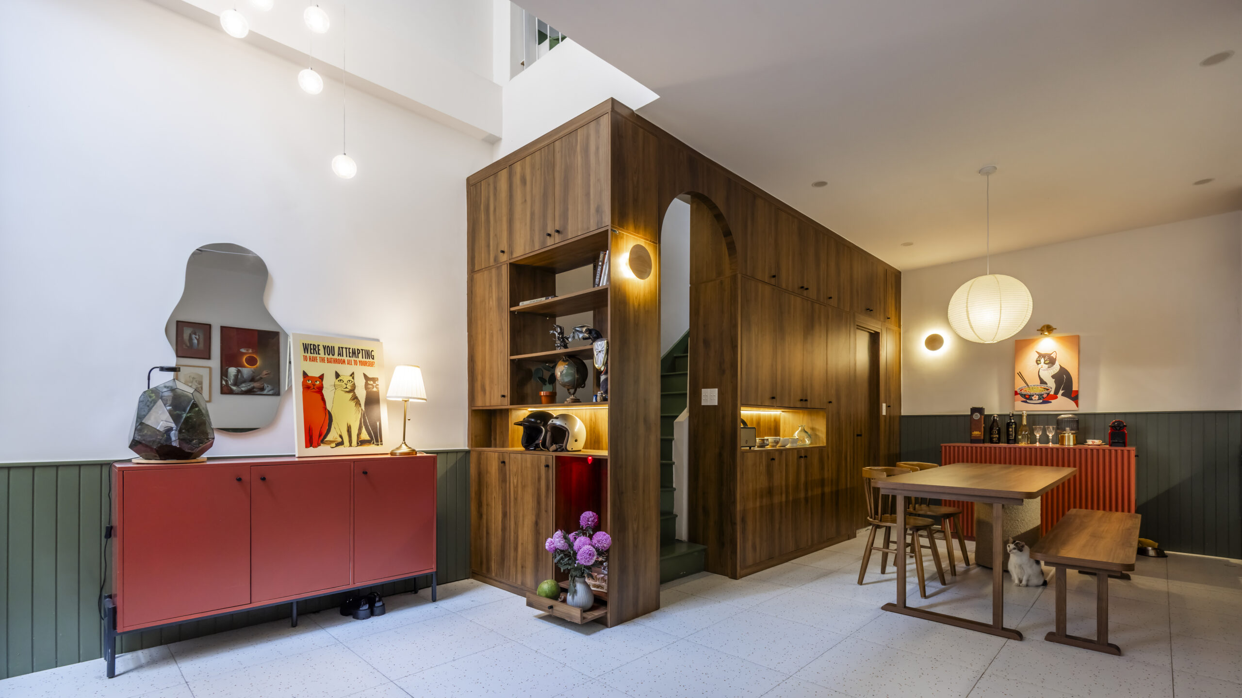 Niềm vui của chủ nhà khi được sống cùng những chú mèo đã thấm vào từng chi tiết thiết kế, tạo nên một bầu không khí ấm áp, gần gũi và mang tính cá nhân hóa rất cao. Ngôi nhà không chỉ được cải tạo để đẹp hơn hay tiện nghi hơn, mà để kể một câu chuyện – câu chuyện về sự gắn bó, yêu thương và cách con người tìm thấy hạnh phúc trong một không gian nhỏ, nhưng đầy ắp cảm xúc.