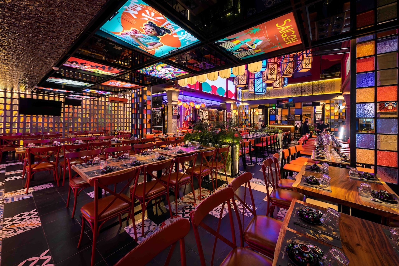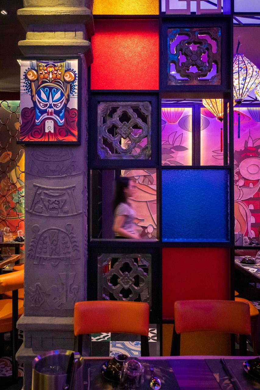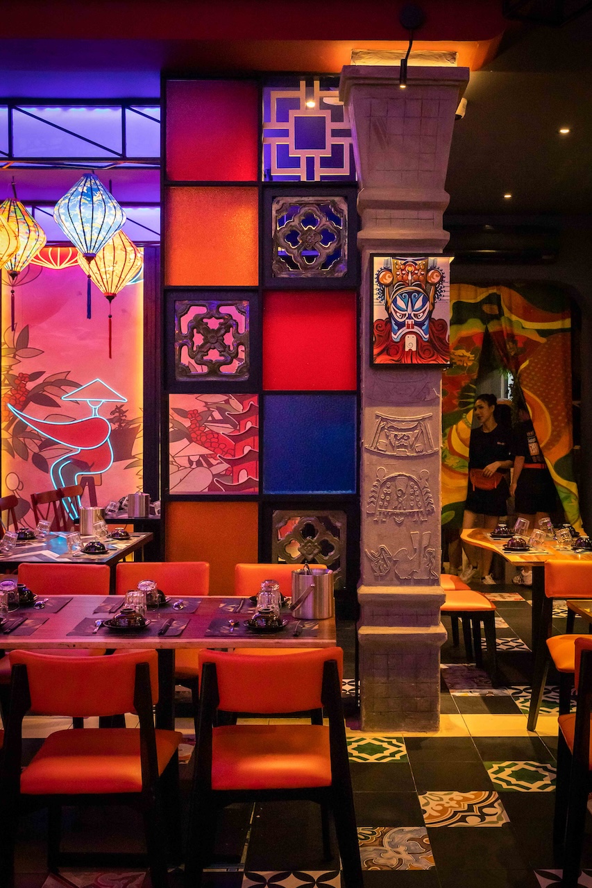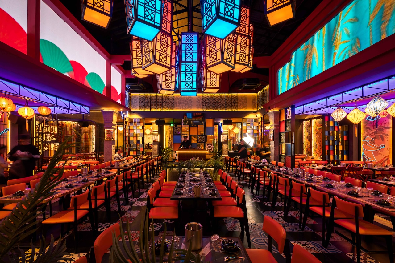 Không gian của nhà hàng được phân chia một cách thông minh để vừa đảm bảo sự riêng tư cho từng nhóm khách hàng, vừa tạo cảm giác rộng rãi, thoáng đãng. Khu vực ăn uống chung có thể được bố trí với những bàn lớn cho nhóm đông người, sử dụng ghế gỗ thiết kế hiện đại kết hợp với các chi tiết truyền thống như chạm khắc hoa văn. Vào ban đêm, hệ thống chiếu sáng bằng đèn lồng, đèn chùm truyền thống kết hợp với đèn LED hiện đại sẽ tạo ra hiệu ứng ánh sáng mềm mại, ấm áp và lãng mạn. Điểm đặc biệt của dự án lần này là cách phối hợp màu sắc ấn tượng với đỏ, vàng, cam, xanh, không hề bị rối mắt và mang một nét riêng đầy phá cách.
