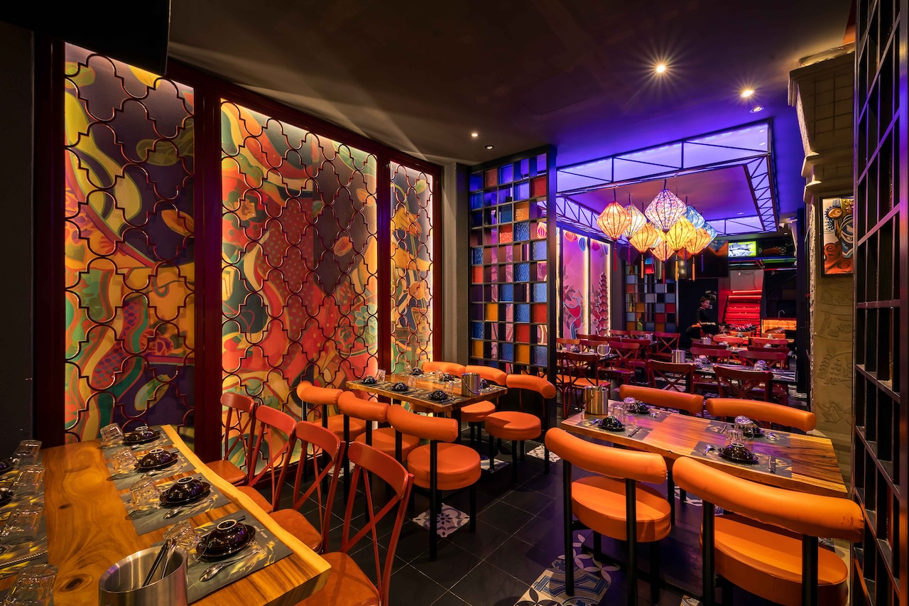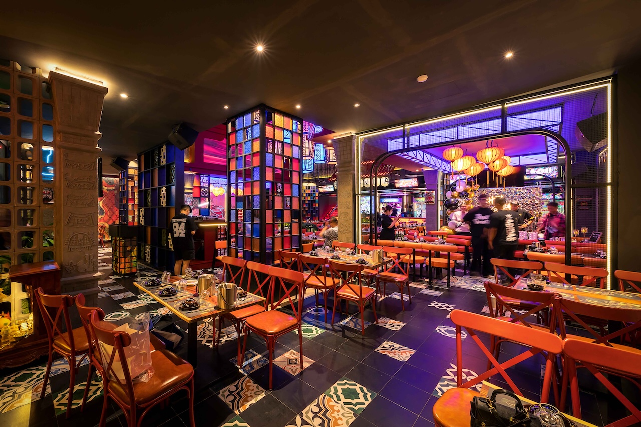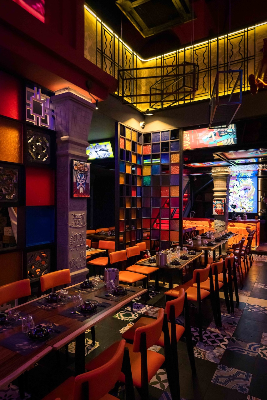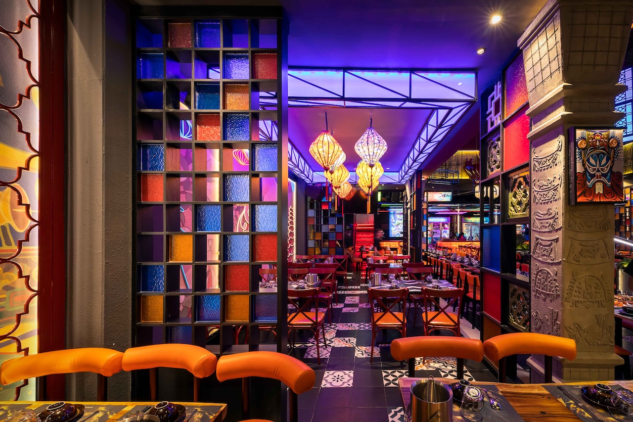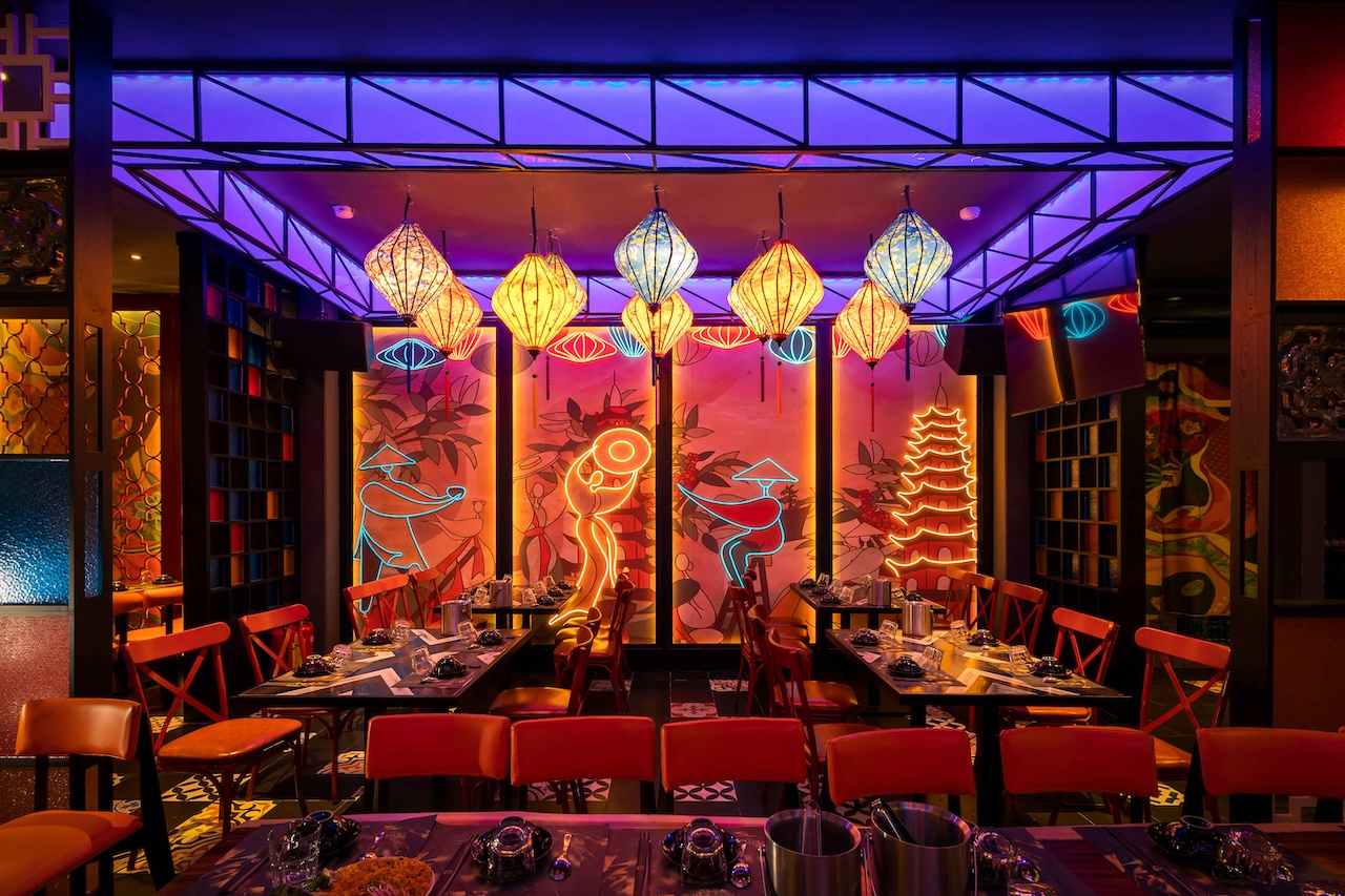 Không gian của nhà hàng được phân chia một cách thông minh để vừa đảm bảo sự riêng tư cho từng nhóm khách hàng, vừa tạo cảm giác rộng rãi, thoáng đãng. Khu vực ăn uống chung có thể được bố trí với những bàn lớn cho nhóm đông người, sử dụng ghế gỗ thiết kế hiện đại kết hợp với các chi tiết truyền thống như chạm khắc hoa văn. Vào ban đêm, hệ thống chiếu sáng bằng đèn lồng, đèn chùm truyền thống kết hợp với đèn LED hiện đại sẽ tạo ra hiệu ứng ánh sáng mềm mại, ấm áp và lãng mạn. Điểm đặc biệt của dự án lần này là cách phối hợp màu sắc ấn tượng với đỏ, vàng, cam, xanh, không hề bị rối mắt và mang một nét riêng đầy phá cách.