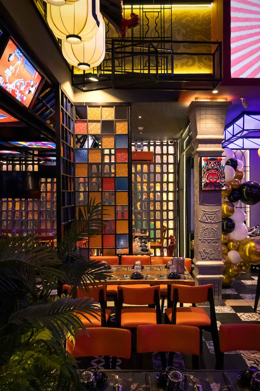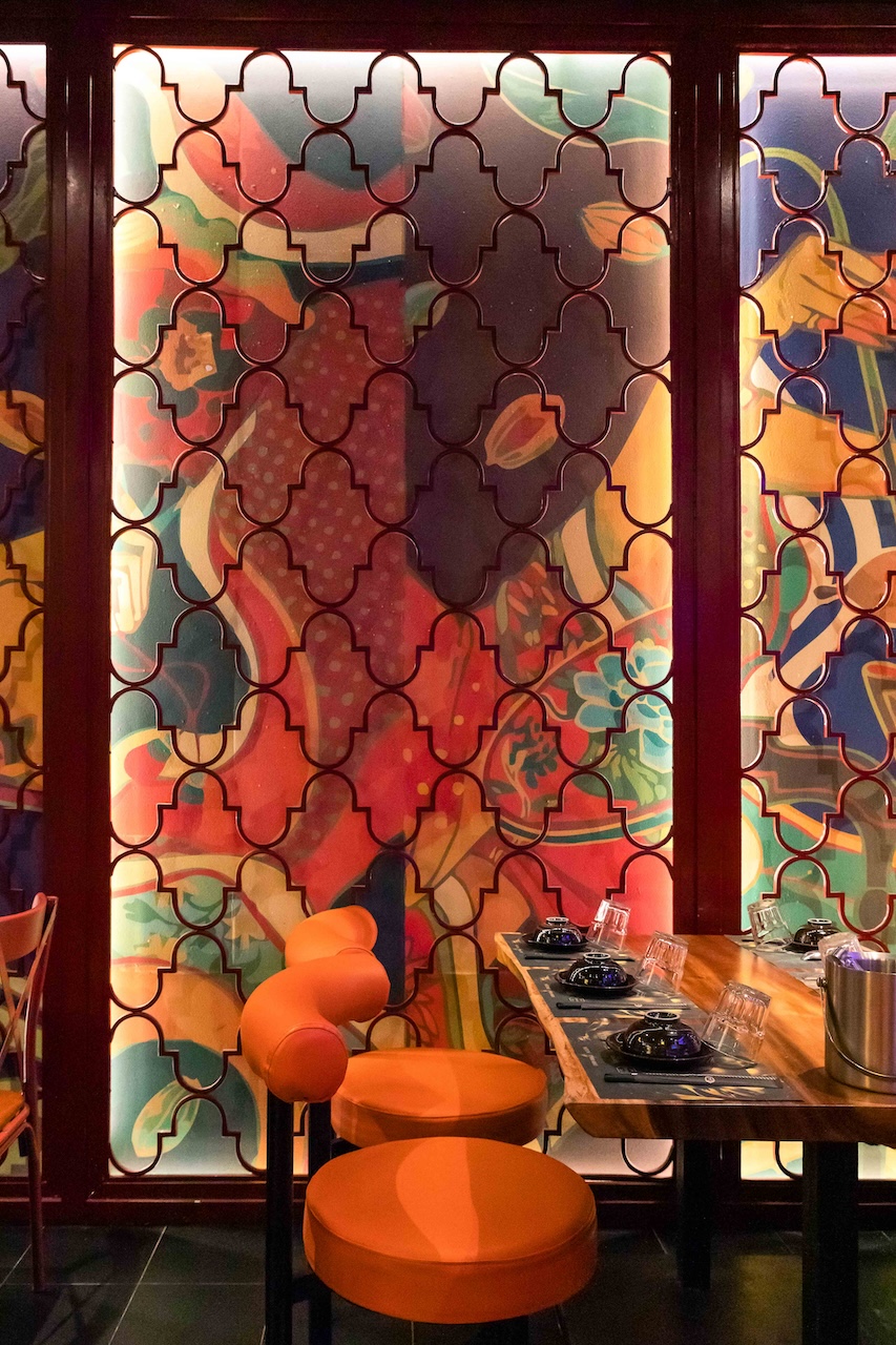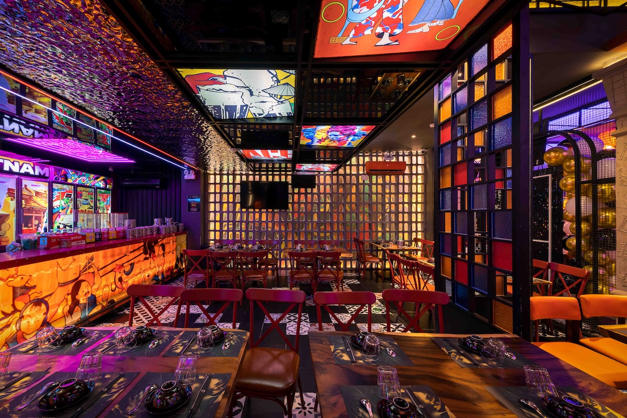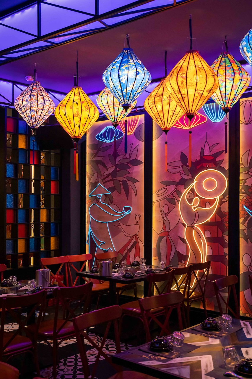 Không gian của nhà hàng được phân chia một cách thông minh để vừa đảm bảo sự riêng tư cho từng nhóm khách hàng, vừa tạo cảm giác rộng rãi, thoáng đãng. Khu vực ăn uống chung có thể được bố trí với những bàn lớn cho nhóm đông người, sử dụng ghế gỗ thiết kế hiện đại kết hợp với các chi tiết truyền thống như chạm khắc hoa văn. Vào ban đêm, hệ thống chiếu sáng bằng đèn lồng, đèn chùm truyền thống kết hợp với đèn LED hiện đại sẽ tạo ra hiệu ứng ánh sáng mềm mại, ấm áp và lãng mạn. Điểm đặc biệt của dự án lần này là cách phối hợp màu sắc ấn tượng với đỏ, vàng, cam, xanh, không hề bị rối mắt và mang một nét riêng đầy phá cách.