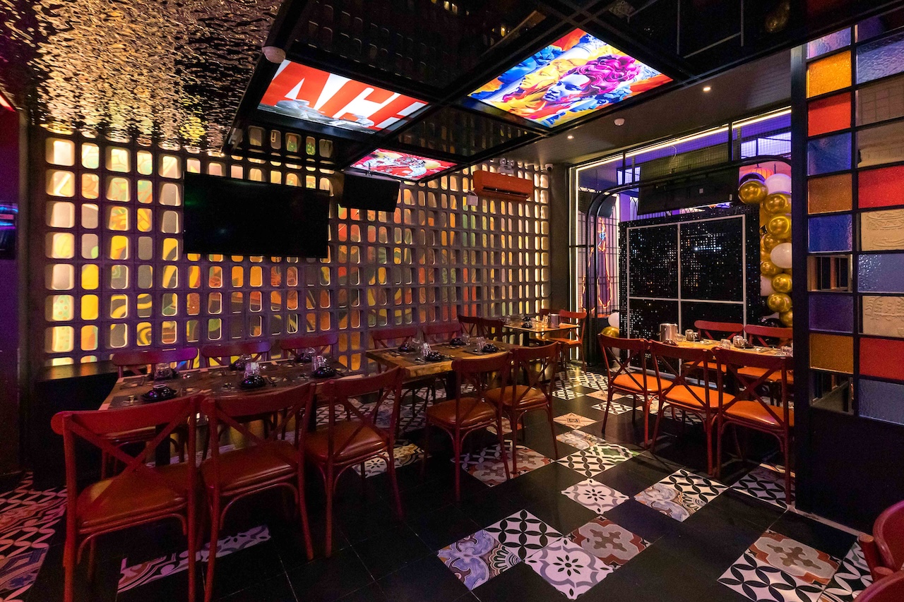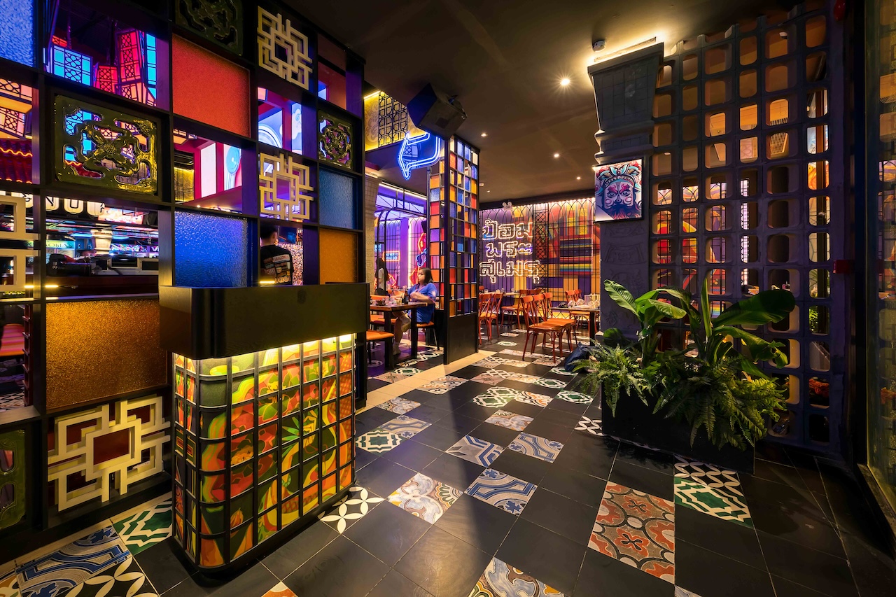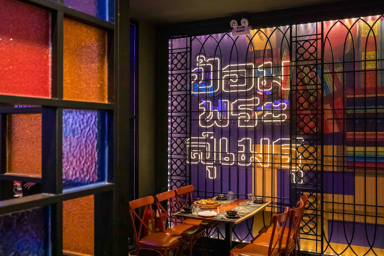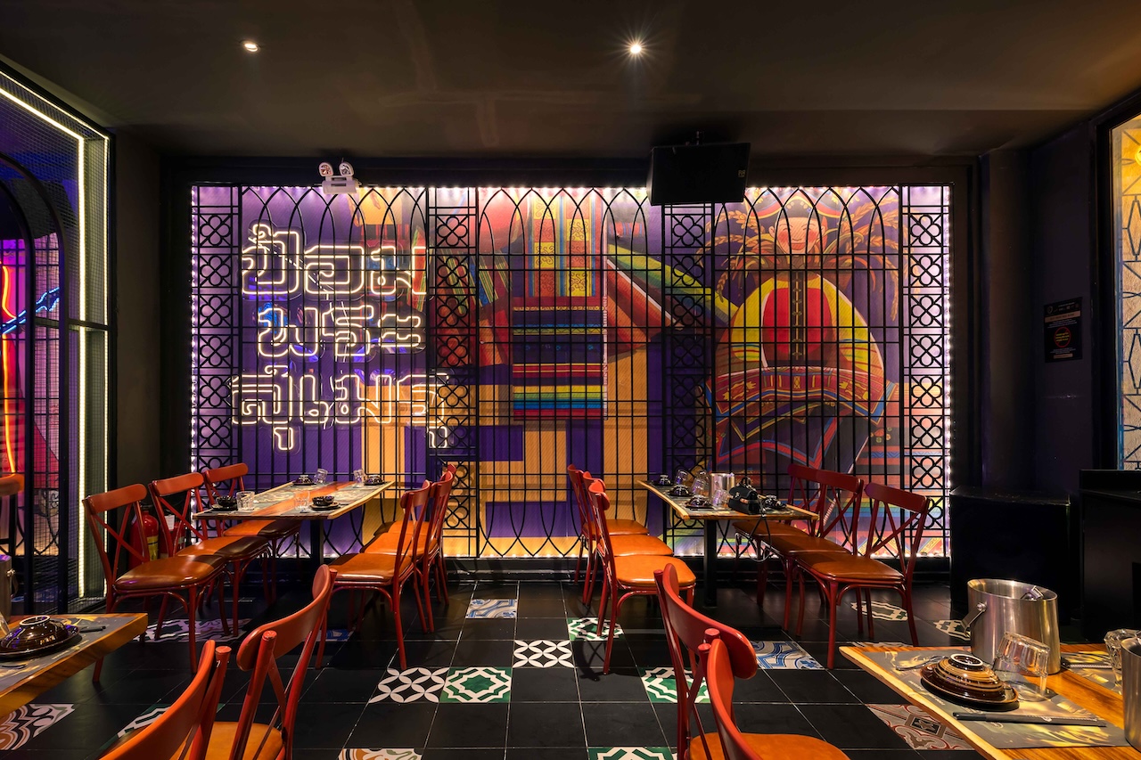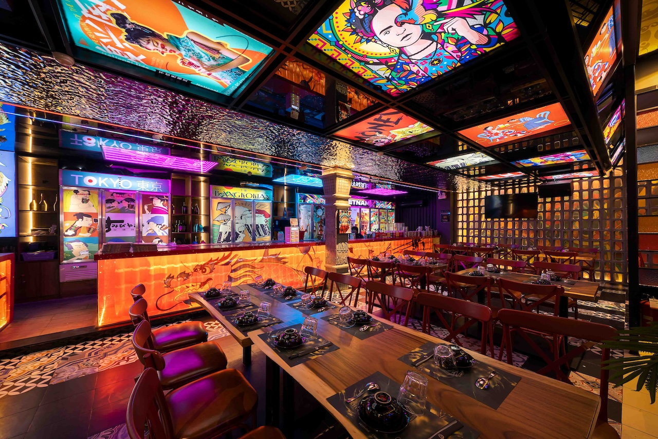 Không gian của nhà hàng được phân chia một cách thông minh để vừa đảm bảo sự riêng tư cho từng nhóm khách hàng, vừa tạo cảm giác rộng rãi, thoáng đãng. Khu vực ăn uống chung có thể được bố trí với những bàn lớn cho nhóm đông người, sử dụng ghế gỗ thiết kế hiện đại kết hợp với các chi tiết truyền thống như chạm khắc hoa văn. Vào ban đêm, hệ thống chiếu sáng bằng đèn lồng, đèn chùm truyền thống kết hợp với đèn LED hiện đại sẽ tạo ra hiệu ứng ánh sáng mềm mại, ấm áp và lãng mạn. Điểm đặc biệt của dự án lần này là cách phối hợp màu sắc ấn tượng với đỏ, vàng, cam, xanh, không hề bị rối mắt và mang một nét riêng đầy phá cách.